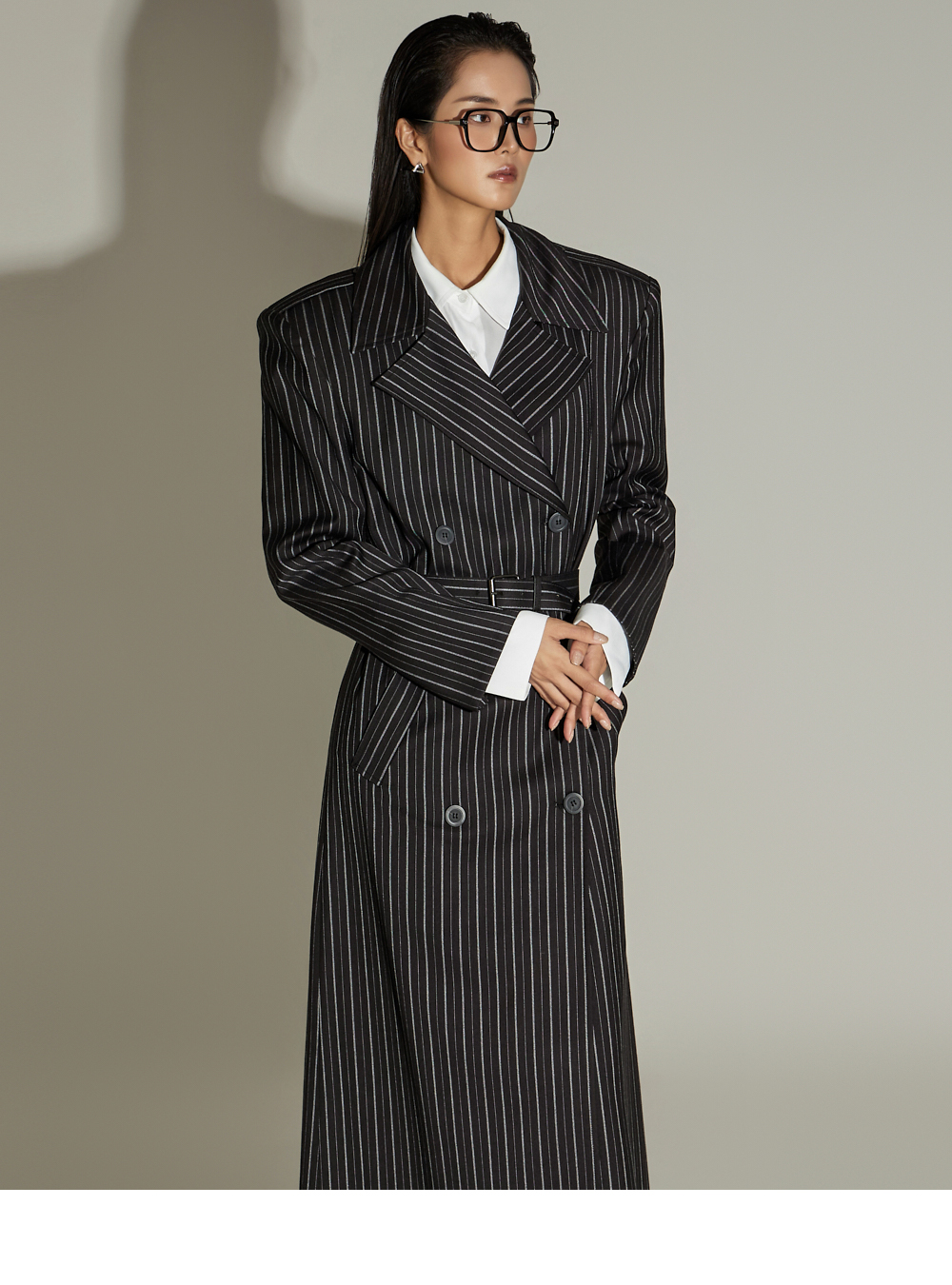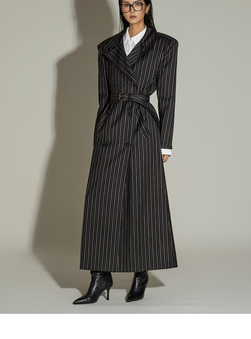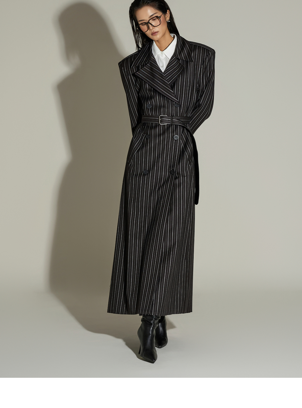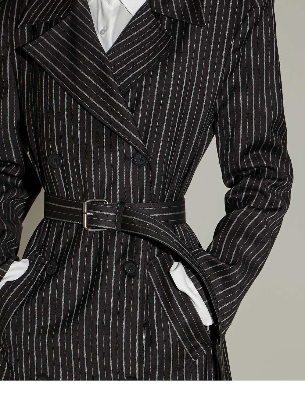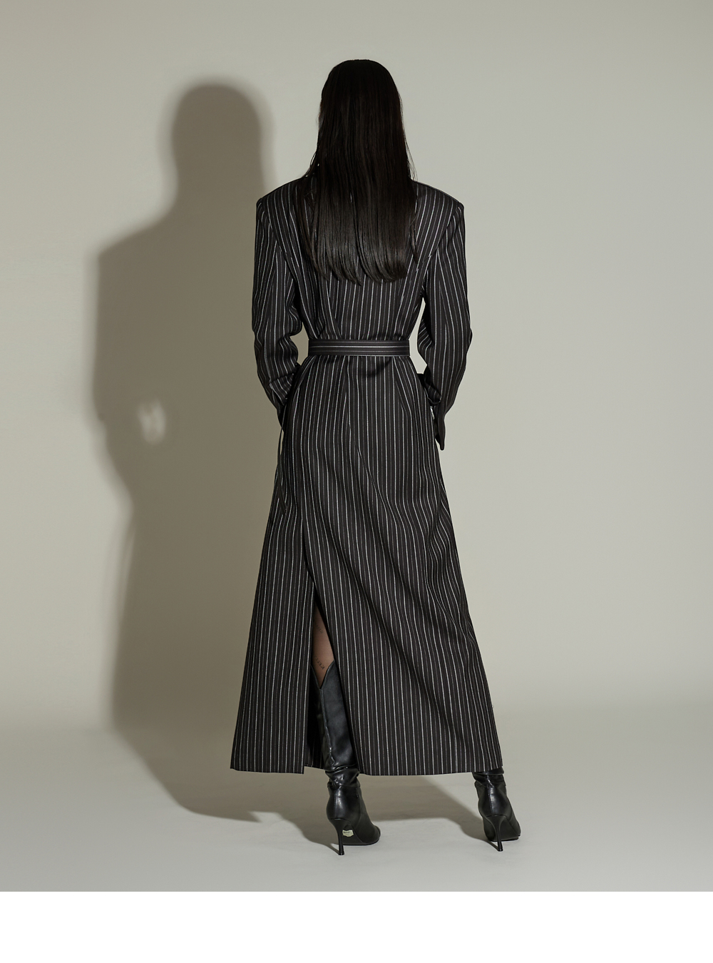 优雅精致的长款连衣裙。 由柔软的聚酯纤维、粘胶纤维及氨纶混纺材质制成,ONE 尺码设计,可根据体型舒适穿着。 前襟扣设计便于穿脱,宽肩设计凸显大方轮廓。 条纹图案营造视觉延伸感,长款裙摆和宽松垂感呈现精致氛围,附同面料腰带套装,可打造多样造型。 如模特示范,可将领口与袖口翻起进行搭配,呈现酷感造型,本款产品推荐给DINT顾客。 173CM 模特,ONE 尺码,BLACK 颜色穿着。