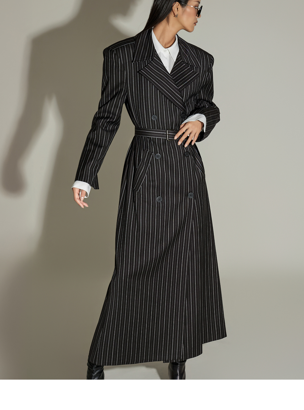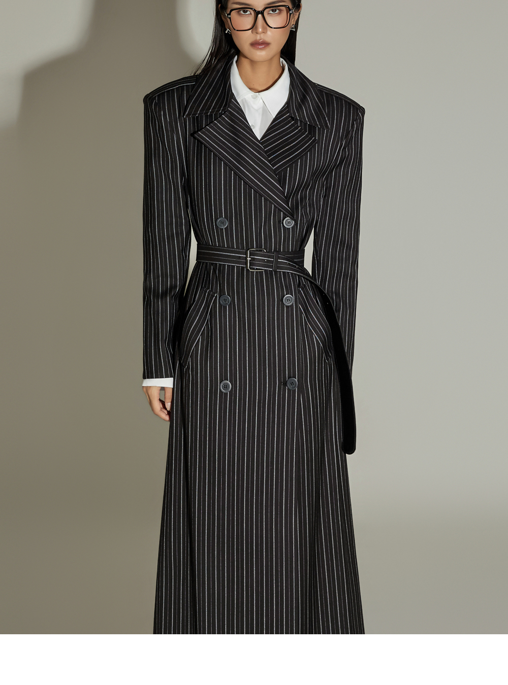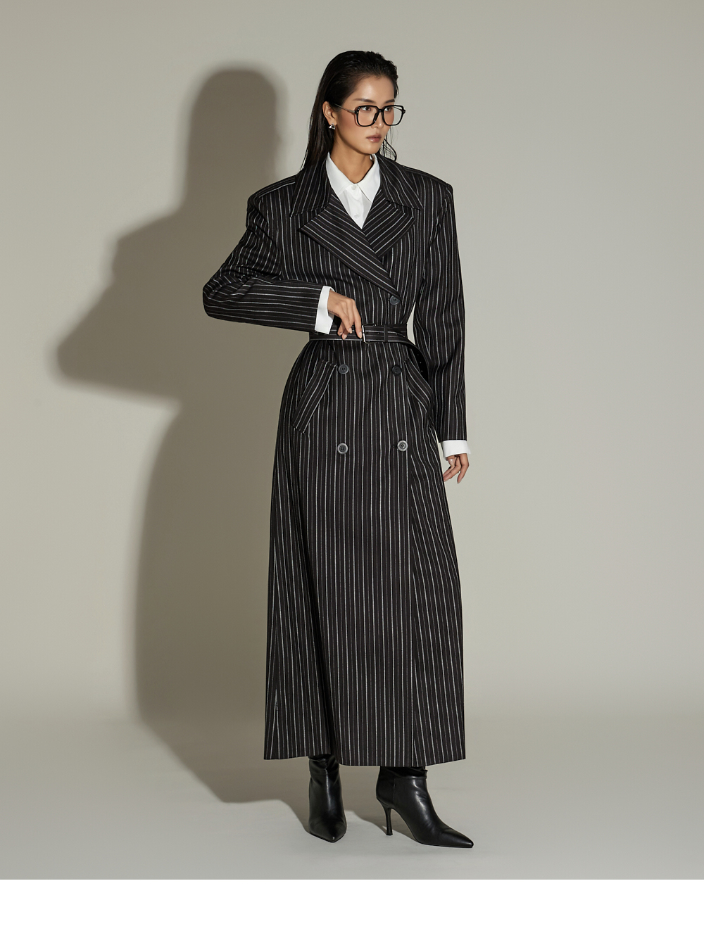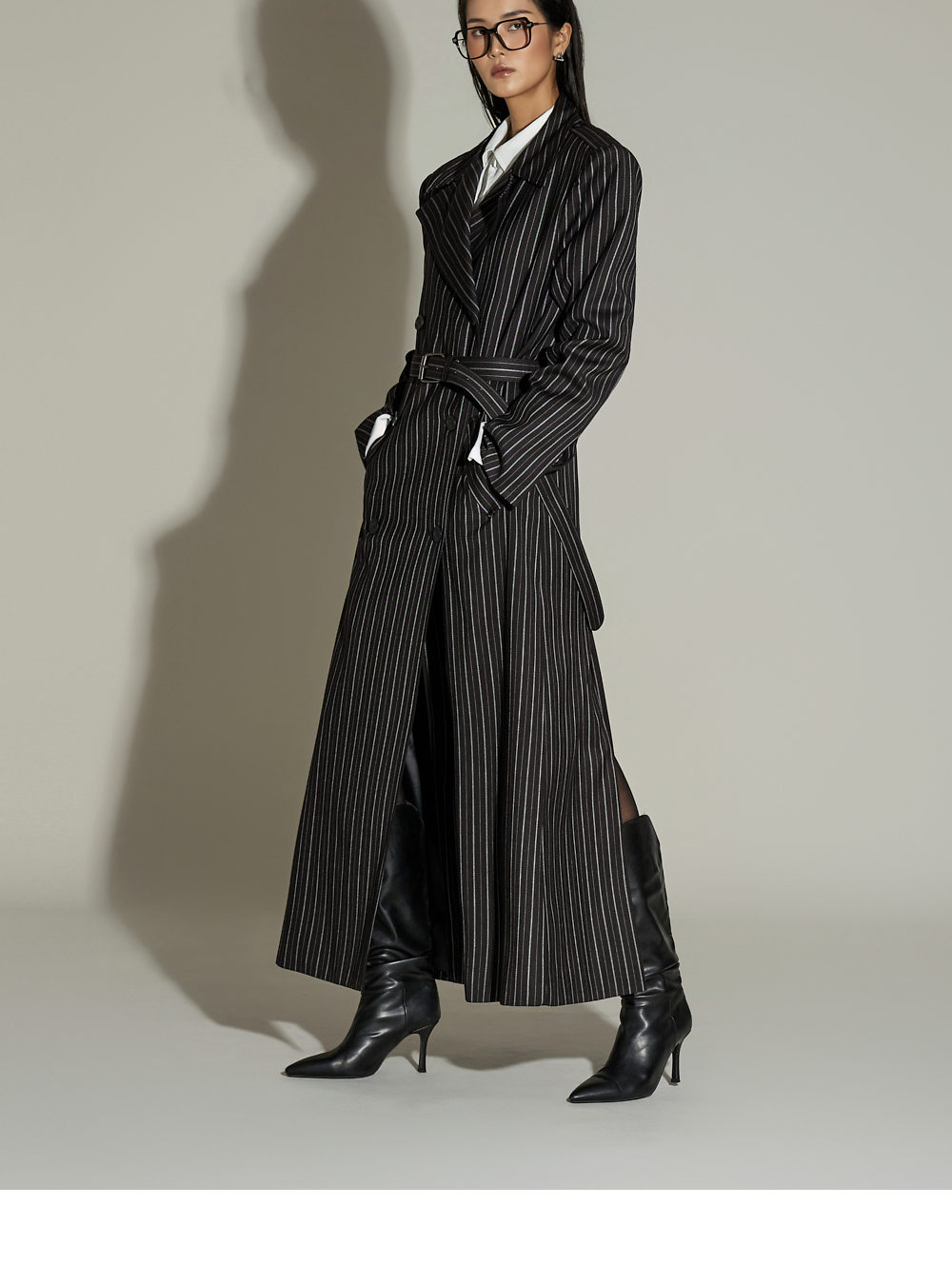 优雅精致的长款连衣裙。 由柔软的聚酯纤维、粘胶纤维及氨纶混纺材质制成,ONE 尺码设计,可根据体型舒适穿着。 前襟扣设计便于穿脱,宽肩设计凸显大方轮廓。 条纹图案营造视觉延伸感,长款裙摆和宽松垂感呈现精致氛围,附同面料腰带套装,可打造多样造型。 如模特示范,可将领口与袖口翻起进行搭配,呈现酷感造型,本款产品推荐给DINT顾客。 173CM 模特,ONE 尺码,BLACK 颜色穿着。