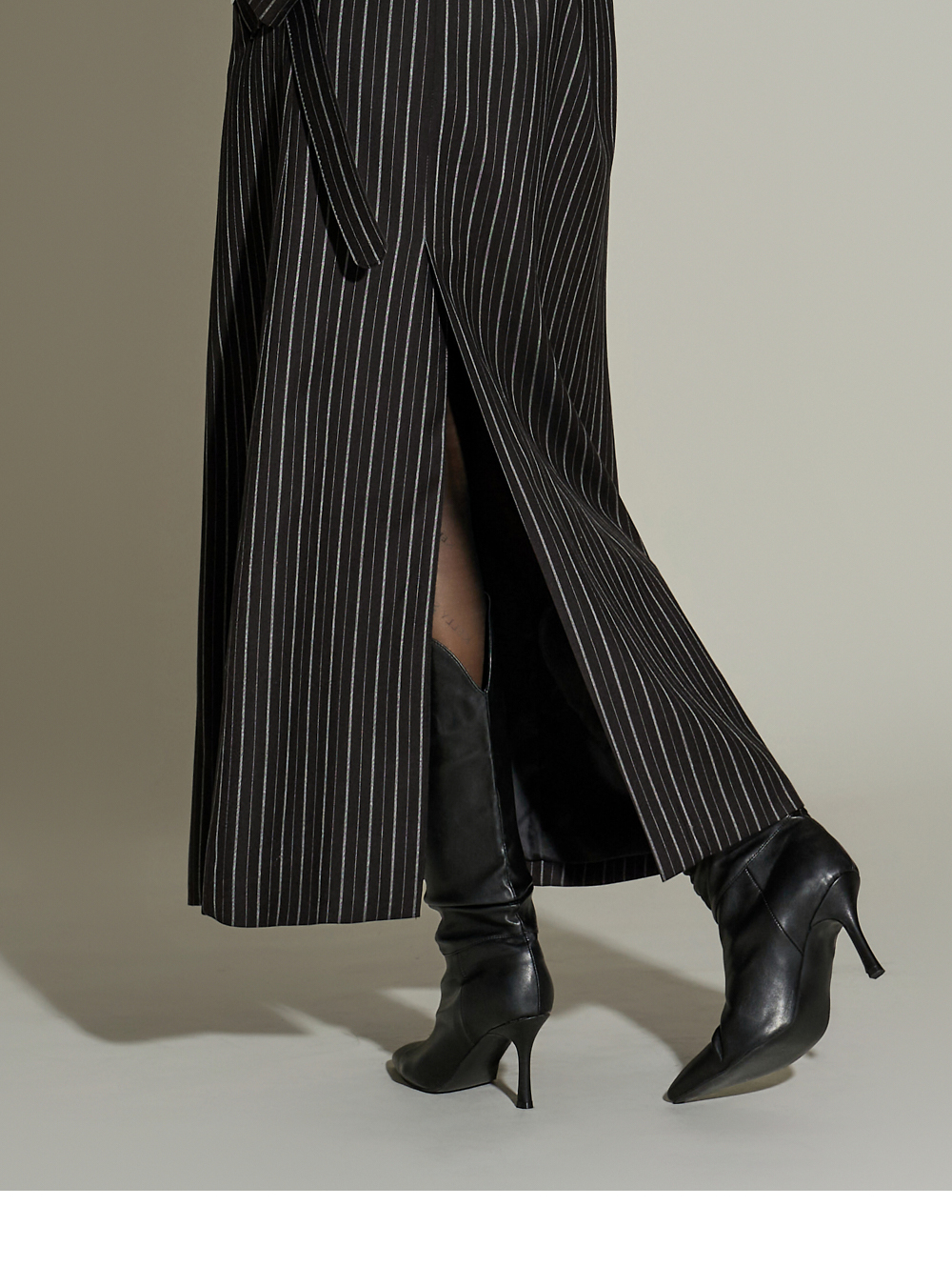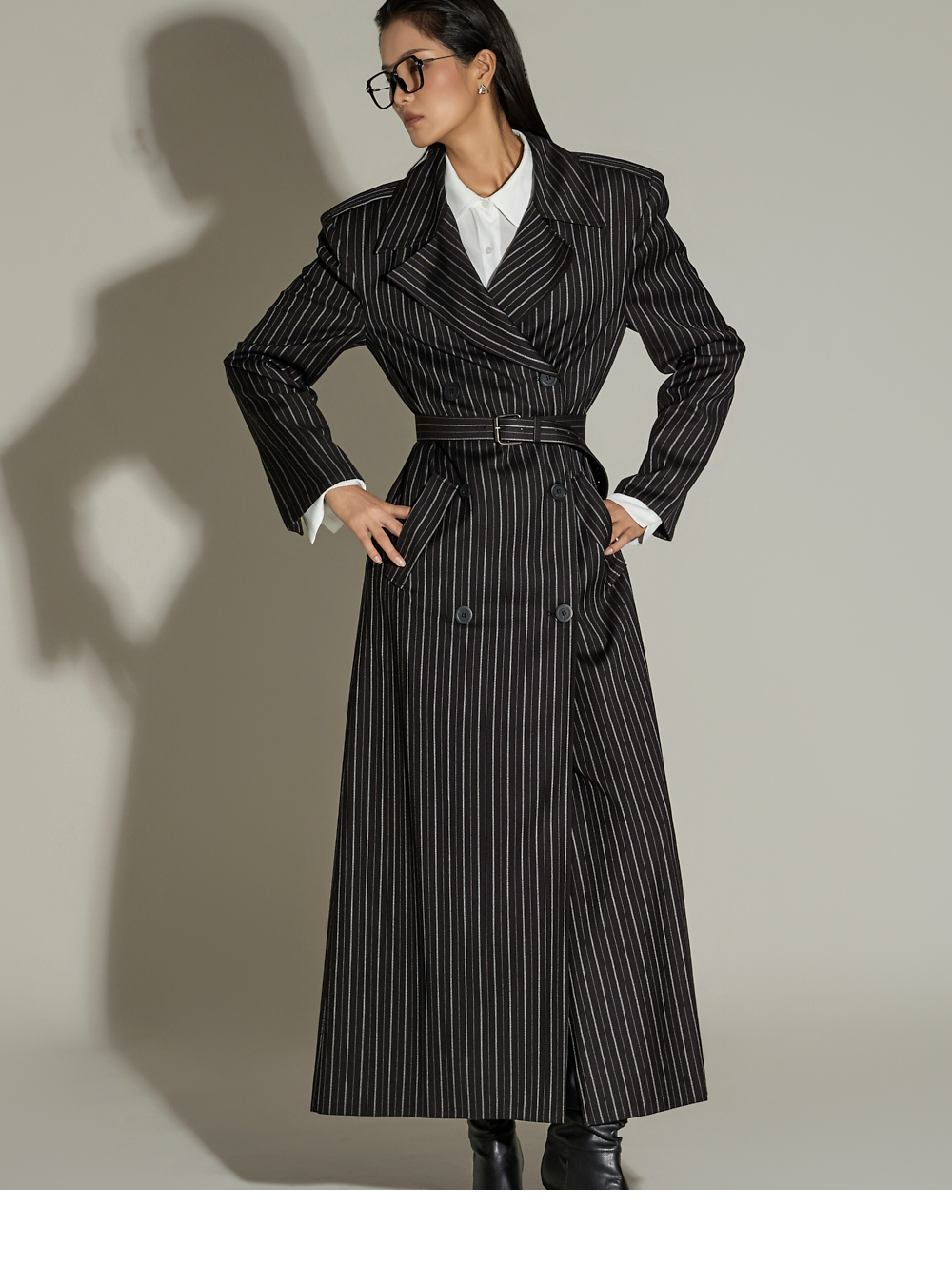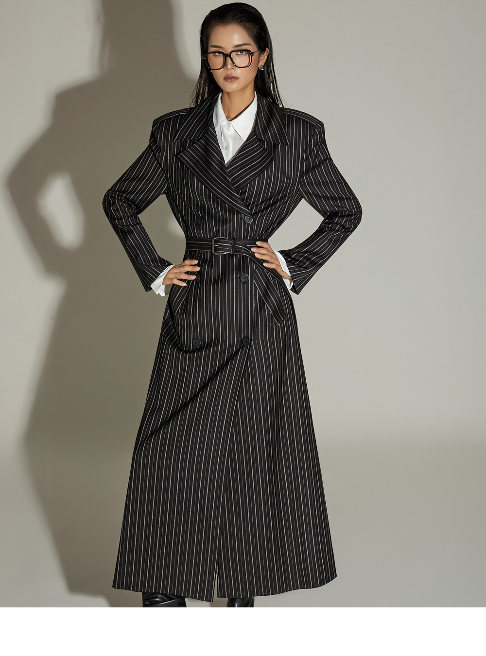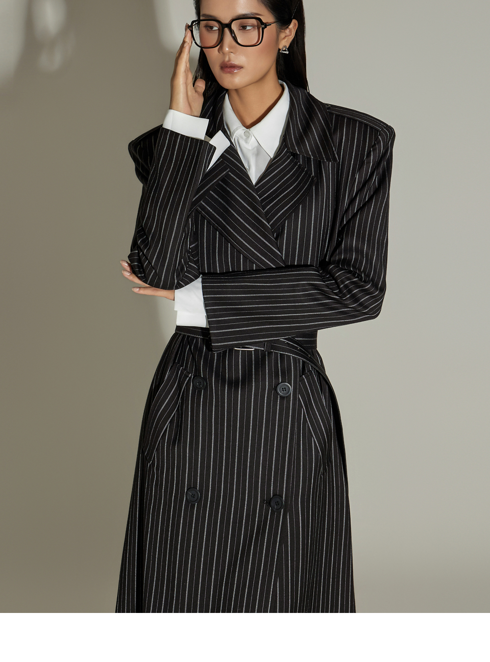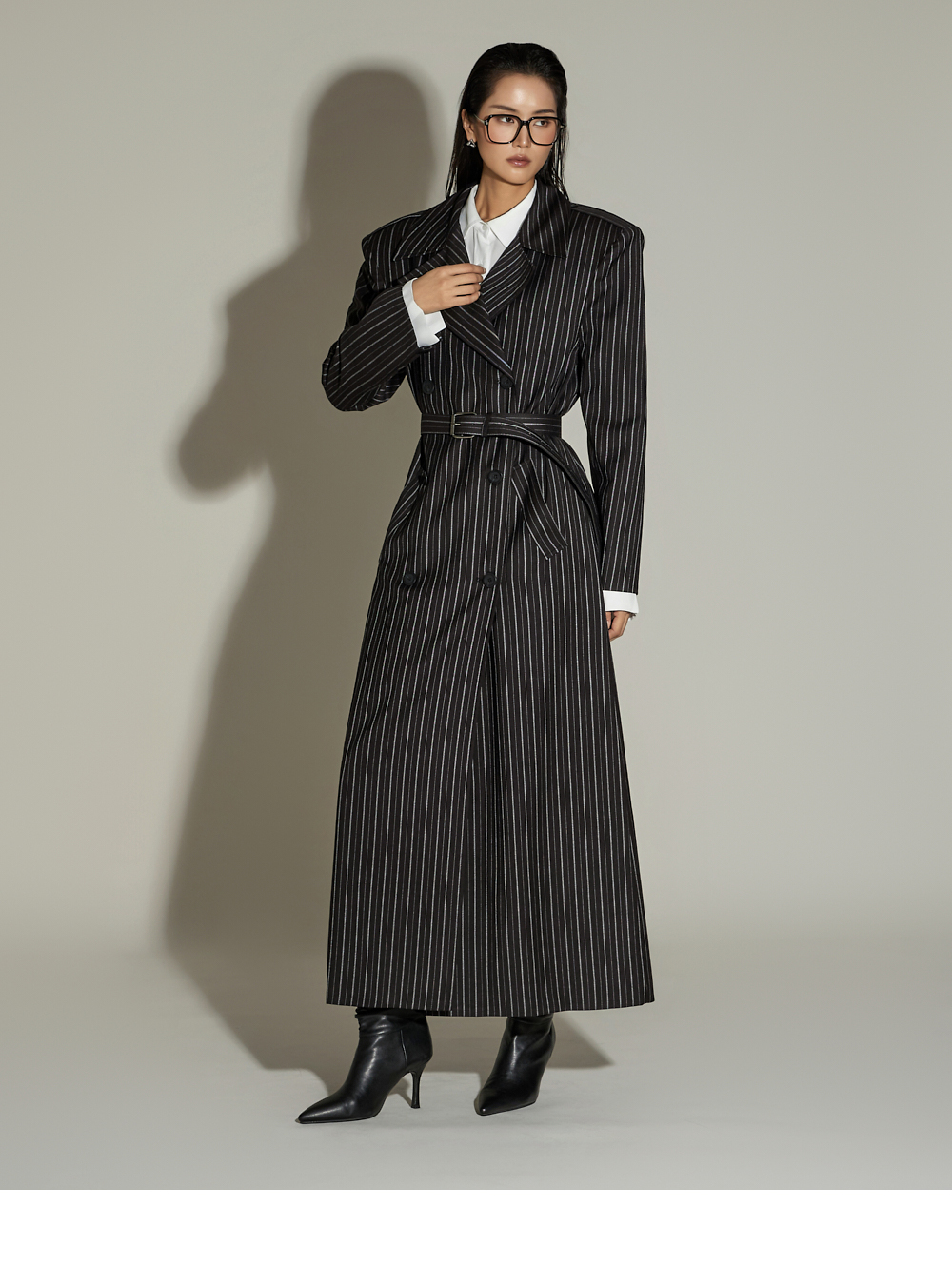 优雅精致的长款连衣裙。 由柔软的聚酯纤维、粘胶纤维及氨纶混纺材质制成,ONE 尺码设计,可根据体型舒适穿着。 前襟扣设计便于穿脱,宽肩设计凸显大方轮廓。 条纹图案营造视觉延伸感,长款裙摆和宽松垂感呈现精致氛围,附同面料腰带套装,可打造多样造型。 如模特示范,可将领口与袖口翻起进行搭配,呈现酷感造型,本款产品推荐给DINT顾客。 173CM 模特,ONE 尺码,BLACK 颜色穿着。