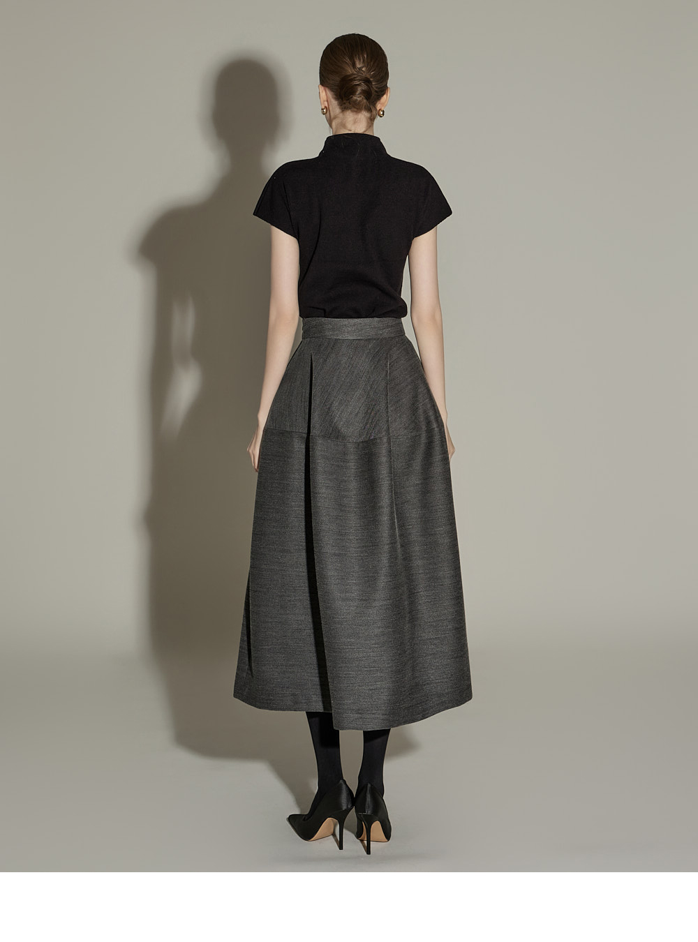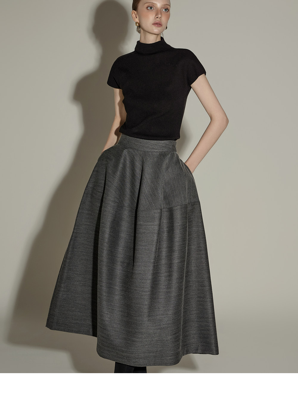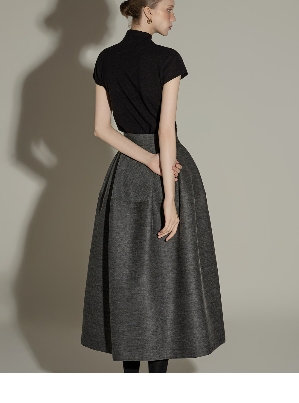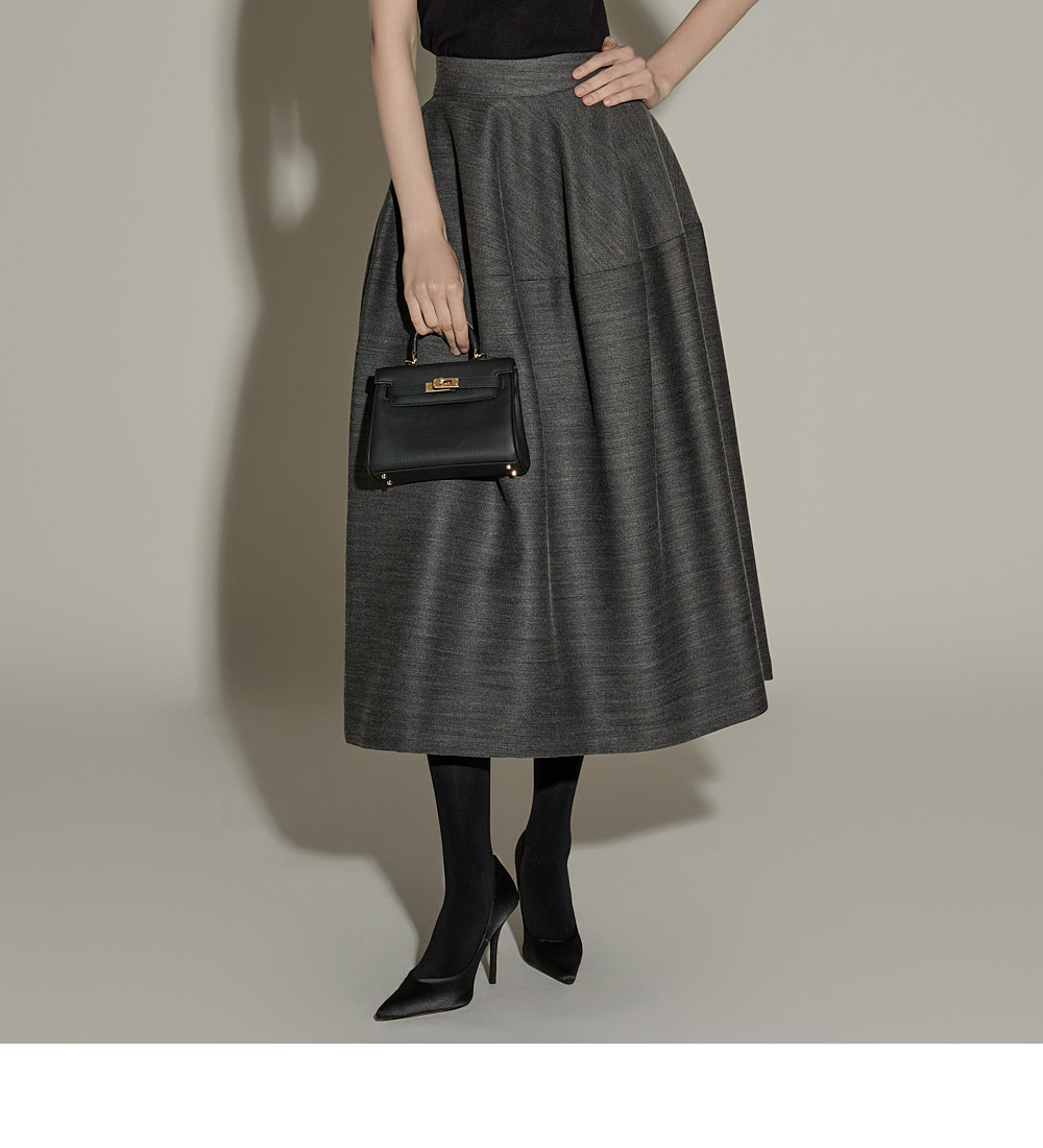 展现女性化氛围的半身裙。 采用聚酯纤维、粘胶纤维和氨纶混纺材质制作,带来舒适的穿着感和稳定的廓形。 在基础的喇叭裙版型上加入中段拼接线,增添设计亮点,并以拼接线为界改变布料纹理方向,使整体不显单调,展现独特气质。 侧边拉链开合,穿着简洁利落,双侧口袋与局部内衬细节提升实用性与舒适度。 与成套西装外套搭配时,能演绎更完整的女性化氛围,单独搭配多样上衣也能轻松打造F/W 季节时尚感十足的造型。 174CM 模特身着 S 码,GRAY 颜色。