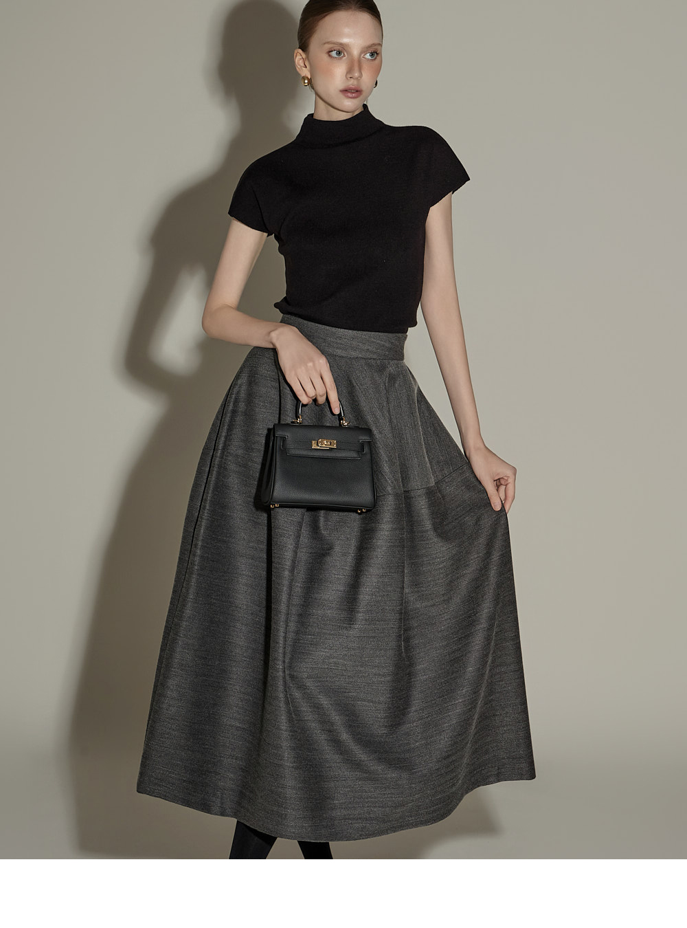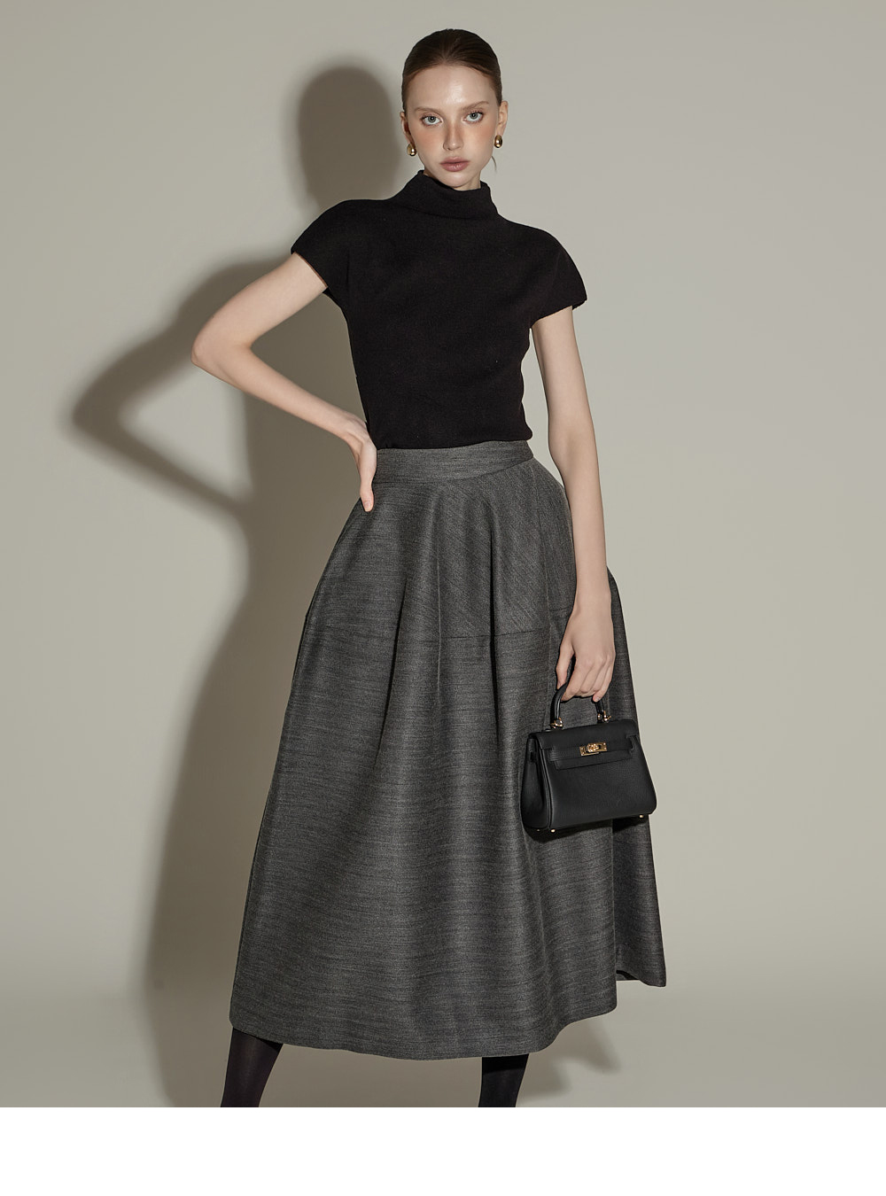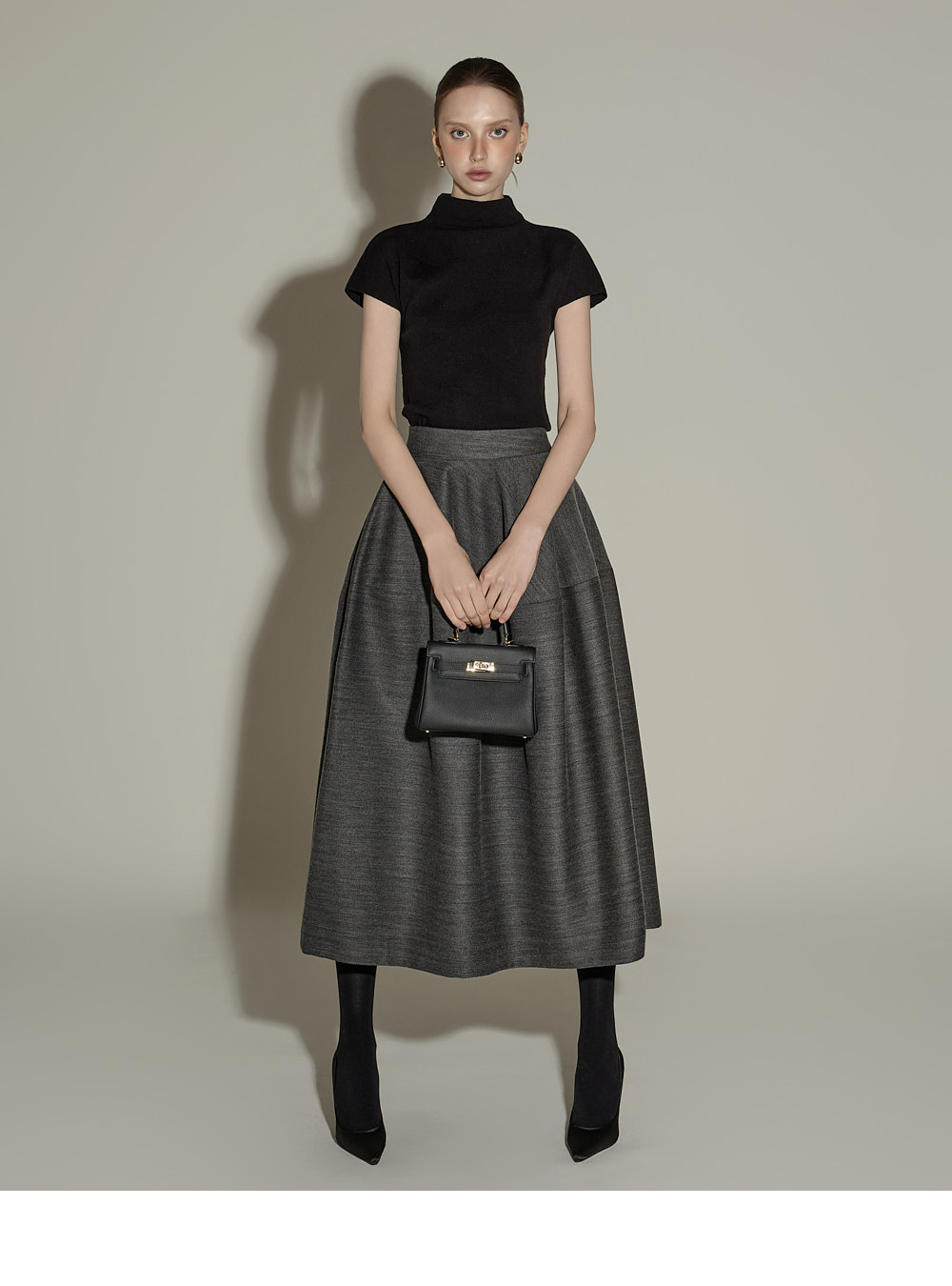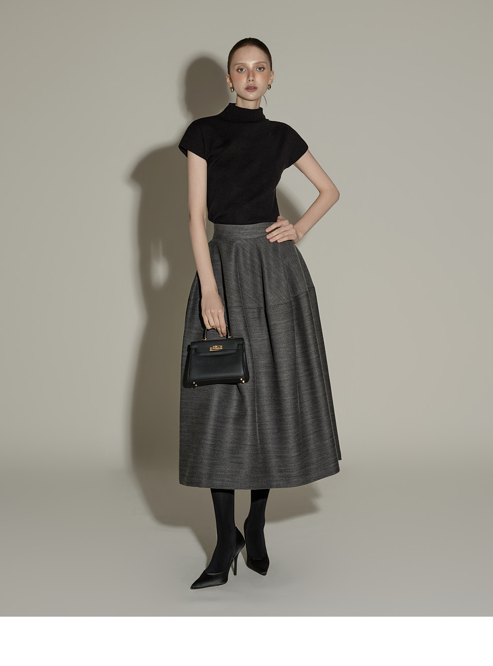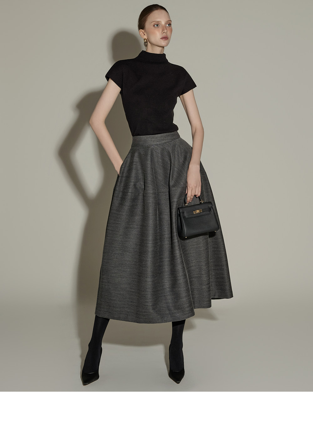 展现女性化氛围的半身裙。 采用聚酯纤维、粘胶纤维和氨纶混纺材质制作,带来舒适的穿着感和稳定的廓形。 在基础的喇叭裙版型上加入中段拼接线,增添设计亮点,并以拼接线为界改变布料纹理方向,使整体不显单调,展现独特气质。 侧边拉链开合,穿着简洁利落,双侧口袋与局部内衬细节提升实用性与舒适度。 与成套西装外套搭配时,能演绎更完整的女性化氛围,单独搭配多样上衣也能轻松打造F/W 季节时尚感十足的造型。 174CM 模特身着 S 码,GRAY 颜色。