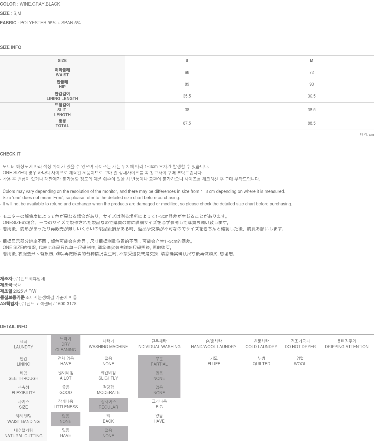 換貨 與 退貨 收到商品後, 7日內能在我的頁面申請交換或退貨, 申請後請將商品寄回DINT. 申請後, 請填寫包裹裡一同寄去的撤回申請書, 再將包裹包裝成一開始您收到時的狀態(包裝袋、衣架、贈品皆要一起寄送回來)發送至DINT即可. 因爲顧客變心所申請的換貨與退貨, 運費將由顧客負擔;誤送或是商品瑕疵的部分, 將由DINT負擔運費. 退貨住所爲:首爾市 衿川區 加山洞 459-8號 大韓通運 7樓 DINT股份有限公司 品質保證標準說明:符合電子商務等有關消費者保護法律規定的消費者可申請交換或是退貨.