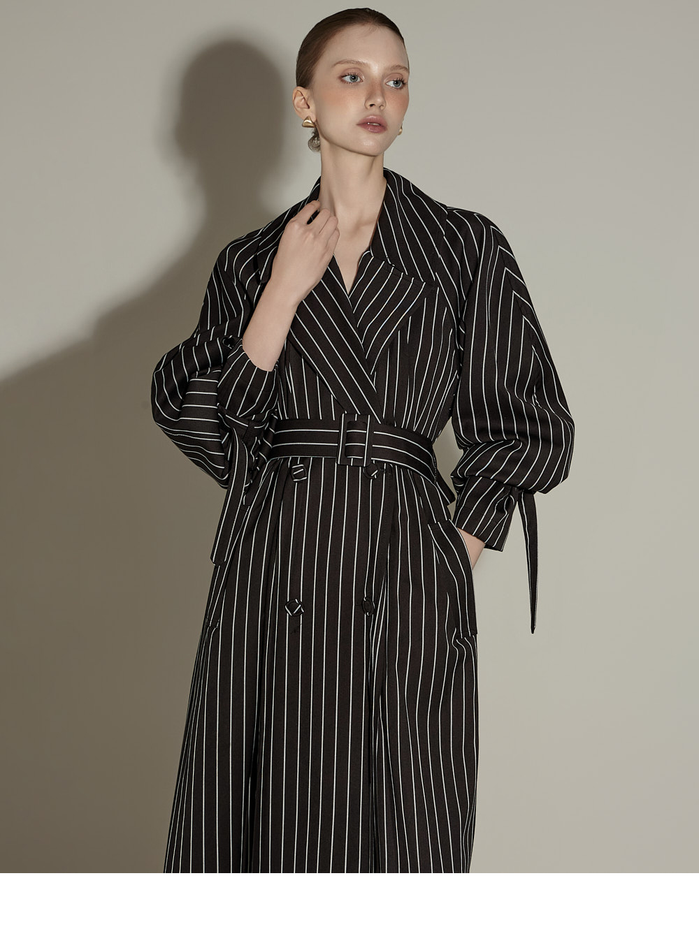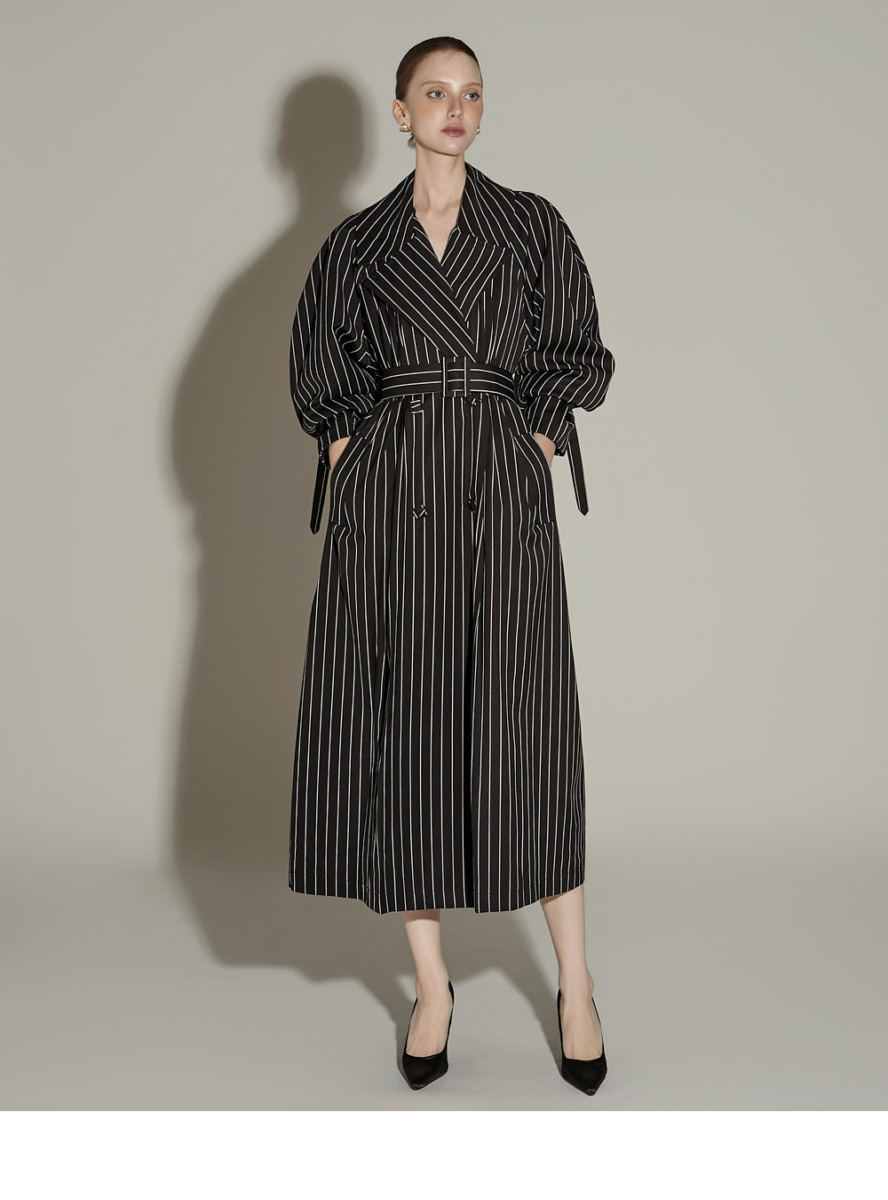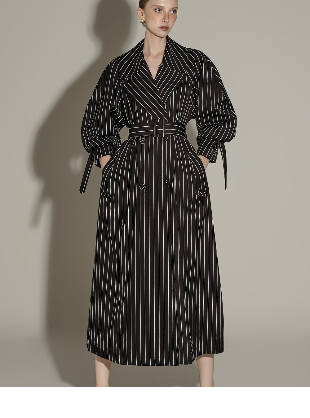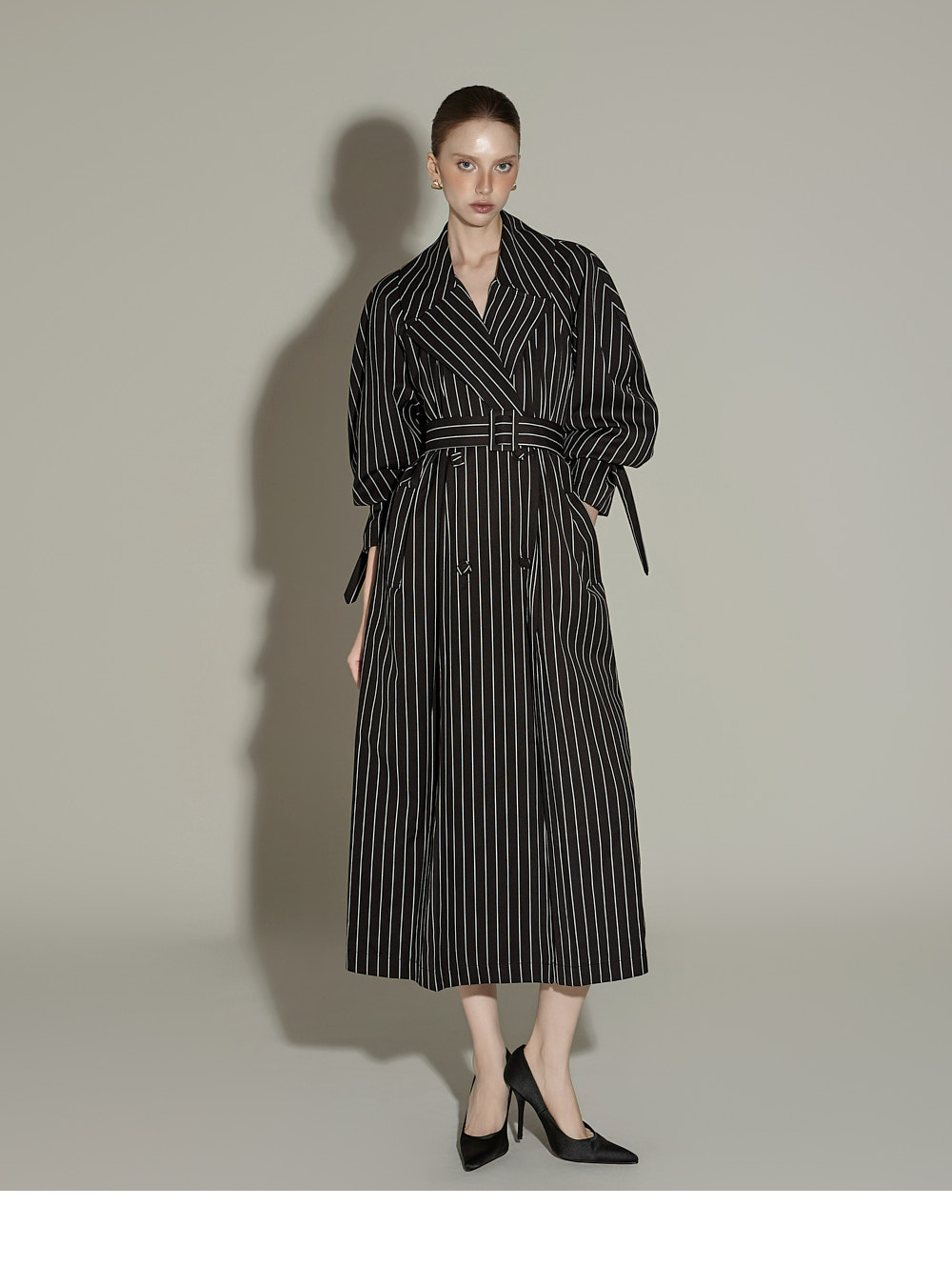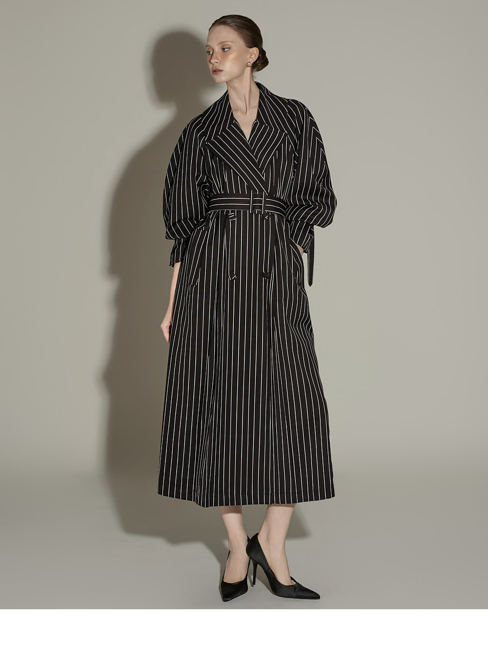 时尚氛围的连衣裙。 采用聚酯纤维与雷永纤维混纺面料制作,轻盈顺滑,穿着舒适,ONE码设计适合多种体型。 条纹图案增添精致感,风衣款设计搭配腰带收腰,塑造优雅轮廓。 长款长度呈现整洁又时尚的氛围,袖口腰带可多样调节,实用性高。 前襟纽扣、双侧口袋与后开衩细节,提升活动便利性与设计完整度,整体内衬保证穿着稳固。 单穿即可完成出众造型,是一款值得推荐的连衣裙。 模特身高174CM,穿ONE码,黑色款。