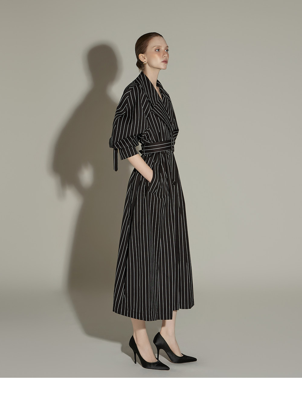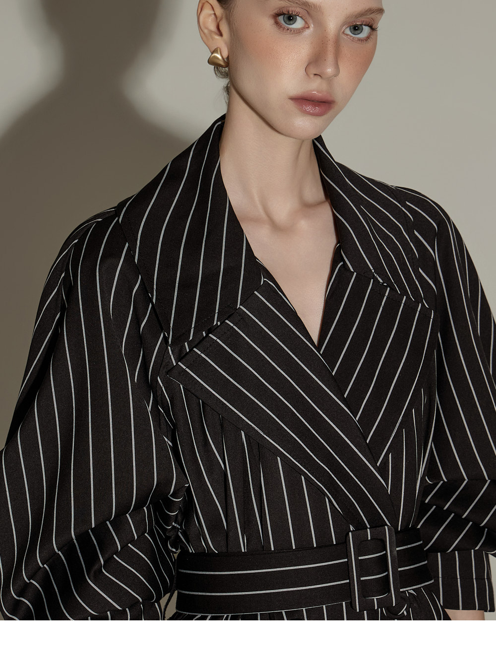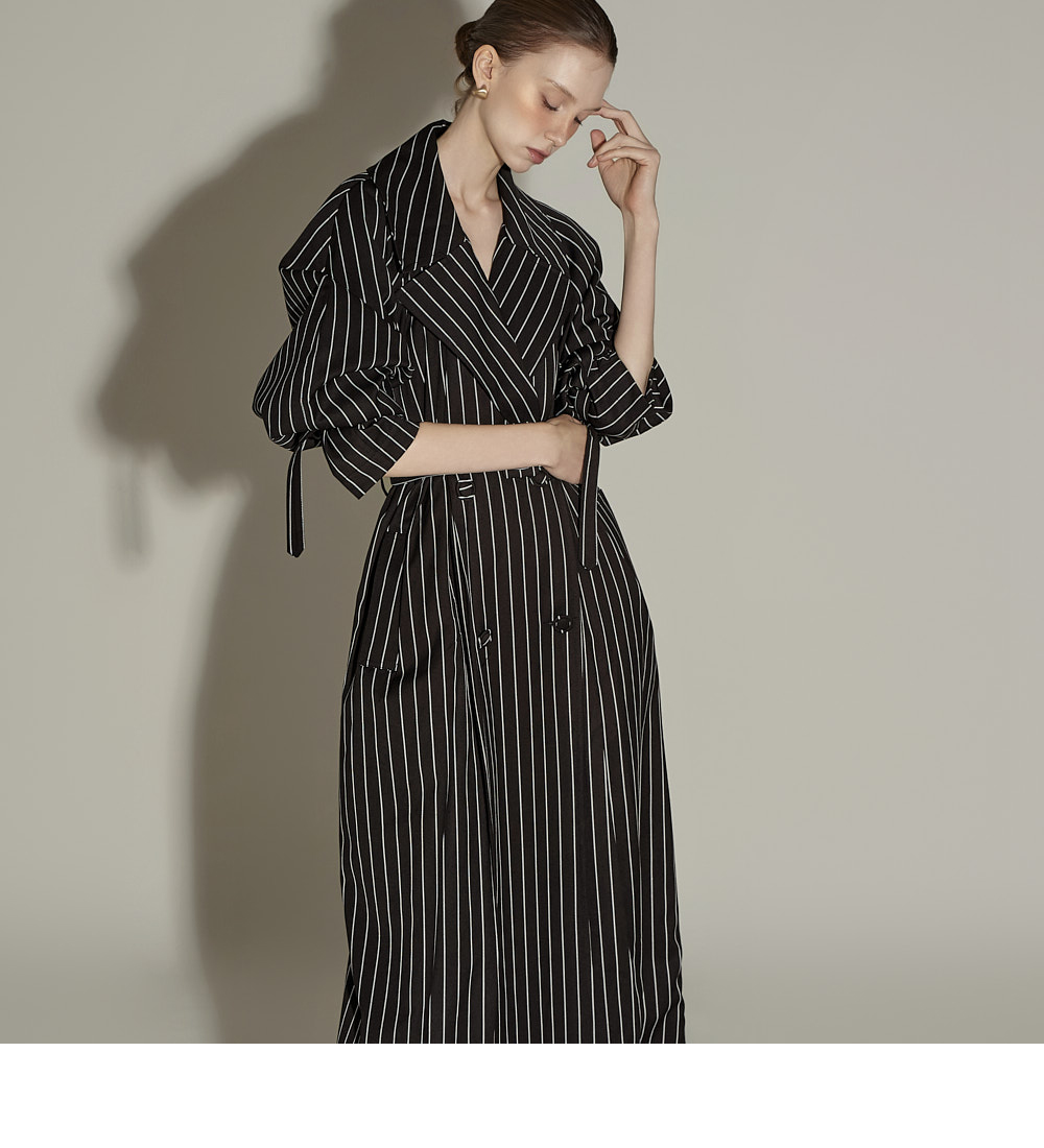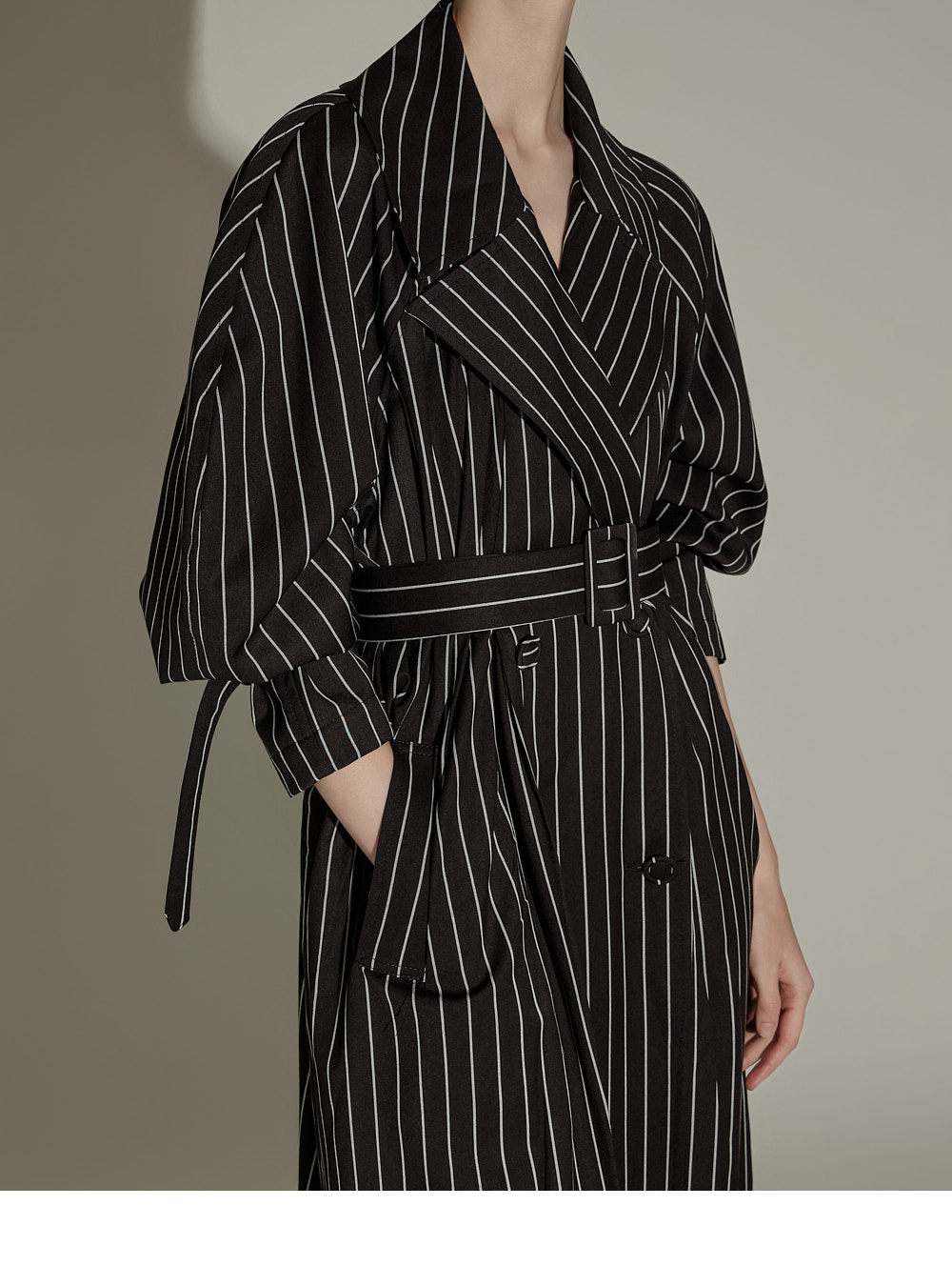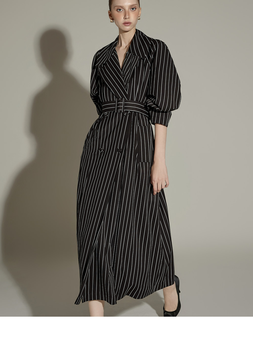 时尚氛围的连衣裙。 采用聚酯纤维与雷永纤维混纺面料制作,轻盈顺滑,穿着舒适,ONE码设计适合多种体型。 条纹图案增添精致感,风衣款设计搭配腰带收腰,塑造优雅轮廓。 长款长度呈现整洁又时尚的氛围,袖口腰带可多样调节,实用性高。 前襟纽扣、双侧口袋与后开衩细节,提升活动便利性与设计完整度,整体内衬保证穿着稳固。 单穿即可完成出众造型,是一款值得推荐的连衣裙。 模特身高174CM,穿ONE码,黑色款。
