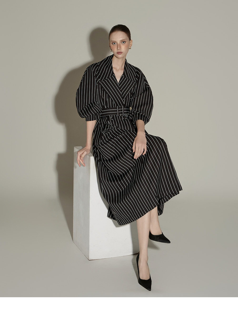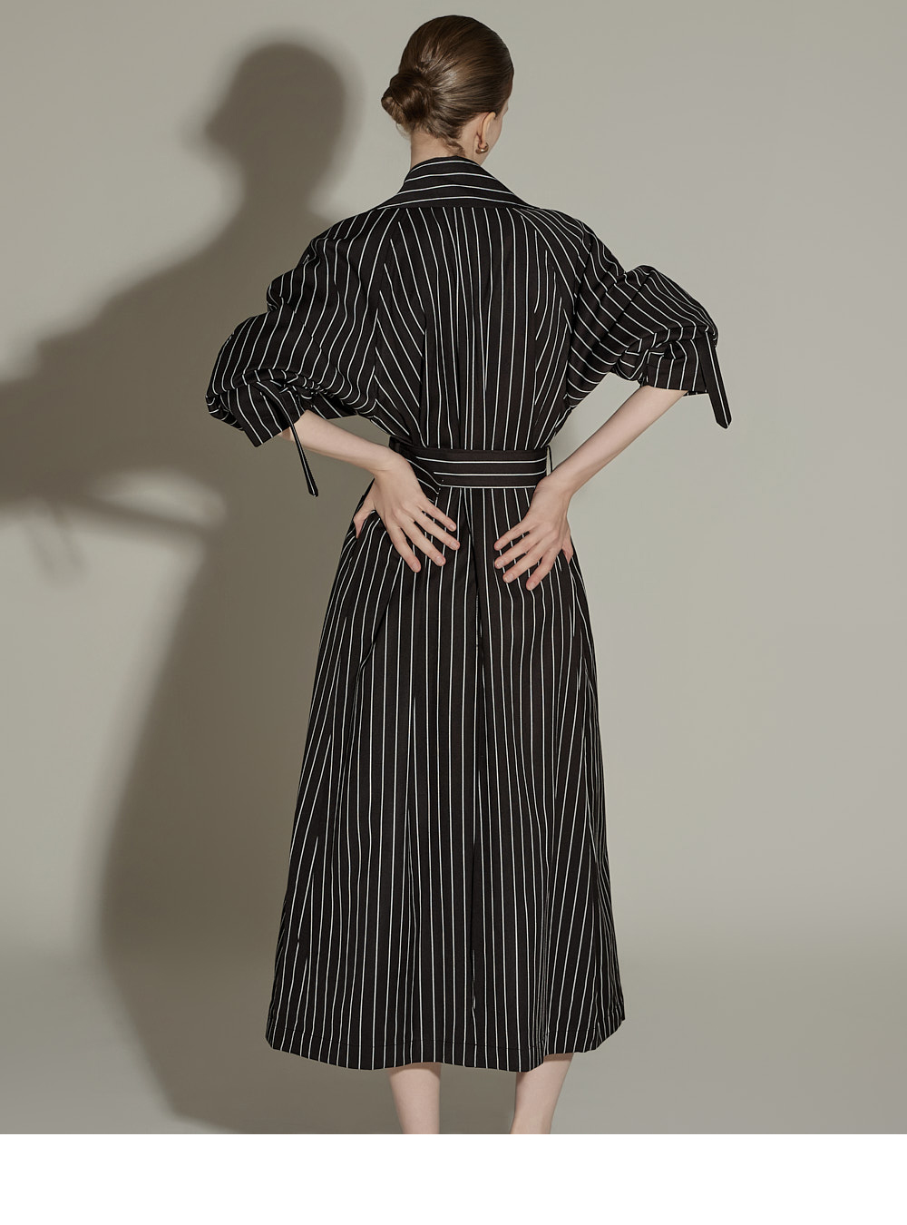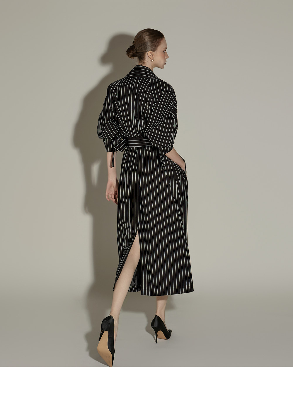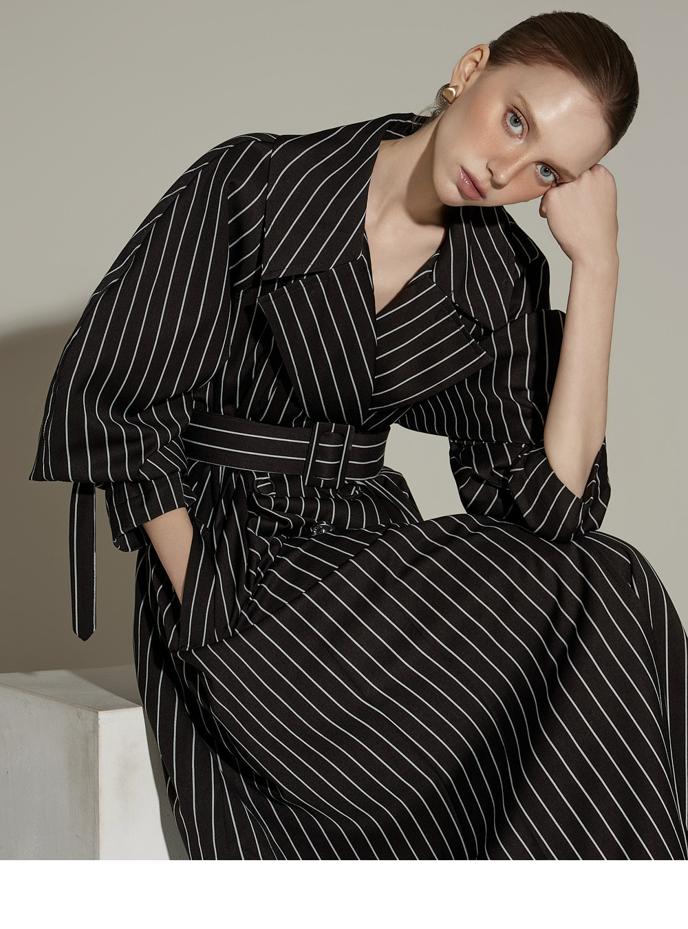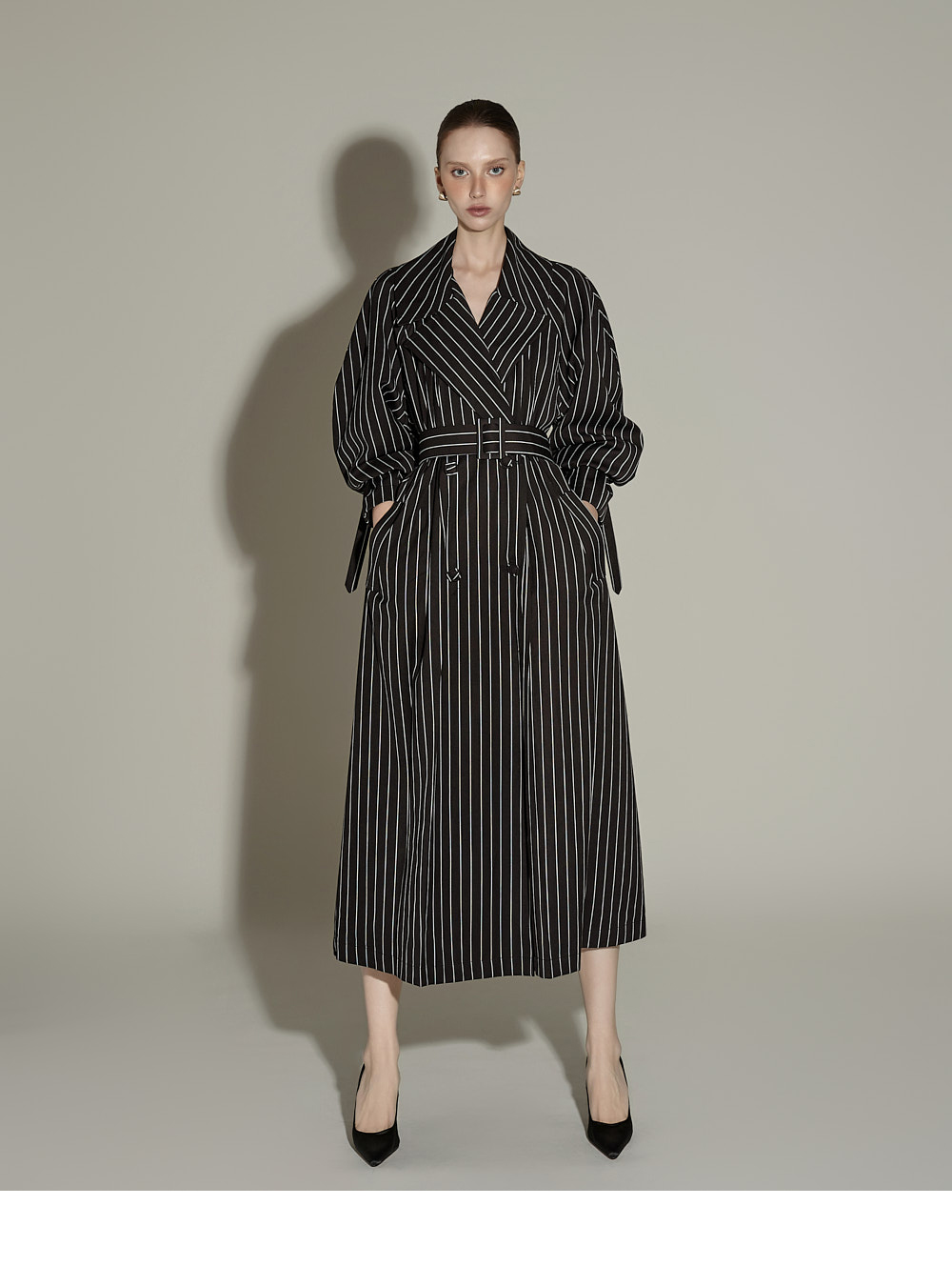 时尚氛围的连衣裙。 采用聚酯纤维与雷永纤维混纺面料制作,轻盈顺滑,穿着舒适,ONE码设计适合多种体型。 条纹图案增添精致感,风衣款设计搭配腰带收腰,塑造优雅轮廓。 长款长度呈现整洁又时尚的氛围,袖口腰带可多样调节,实用性高。 前襟纽扣、双侧口袋与后开衩细节,提升活动便利性与设计完整度,整体内衬保证穿着稳固。 单穿即可完成出众造型,是一款值得推荐的连衣裙。 模特身高174CM,穿ONE码,黑色款。