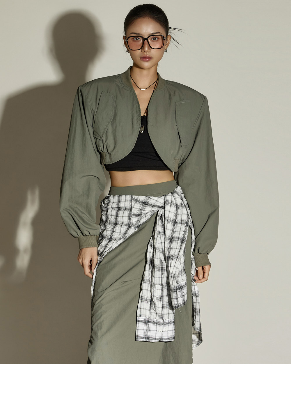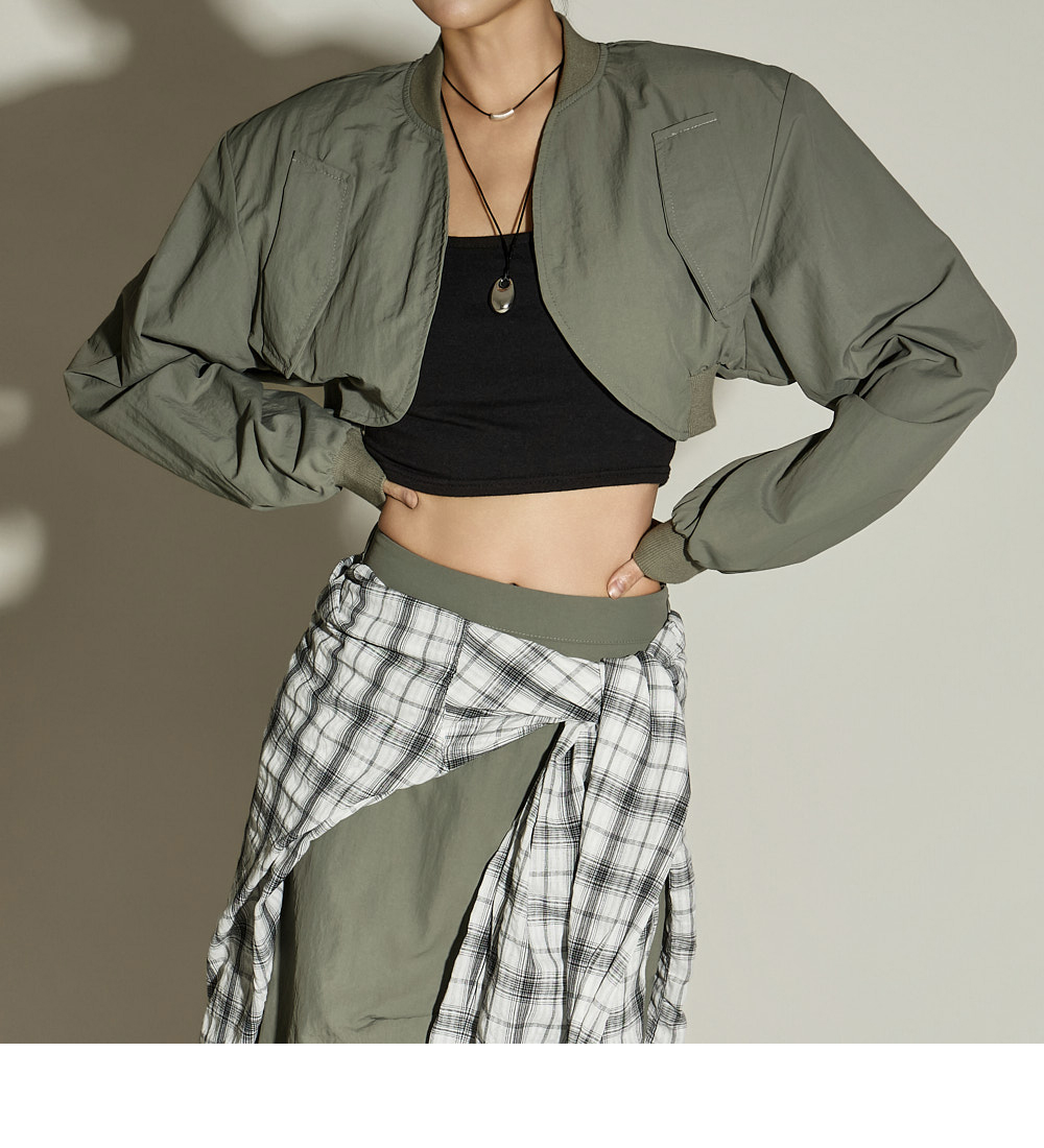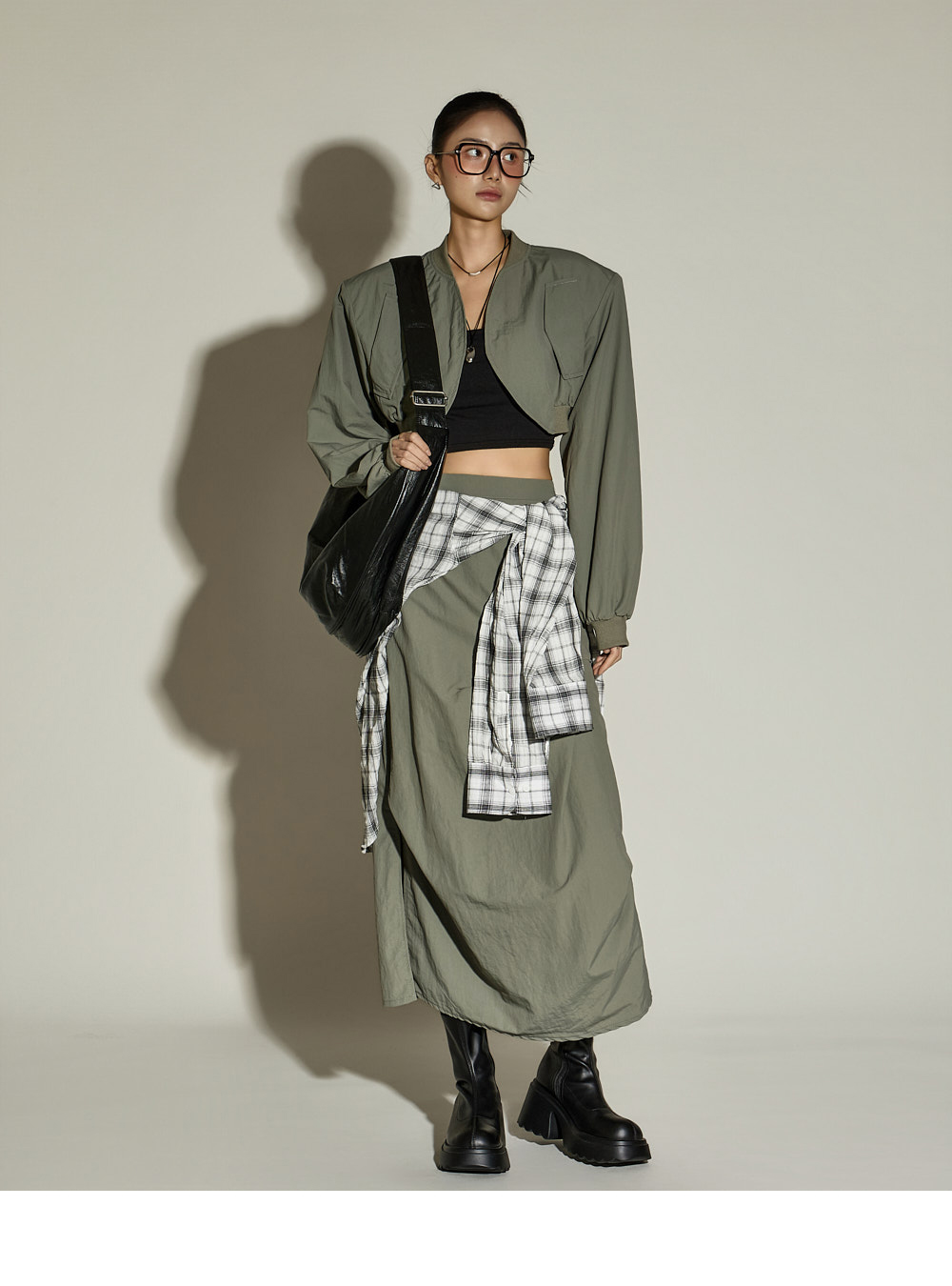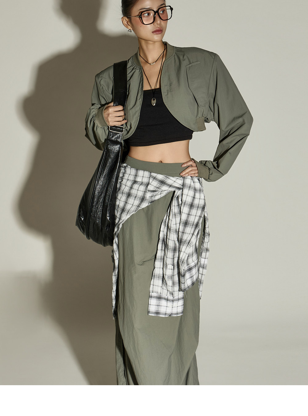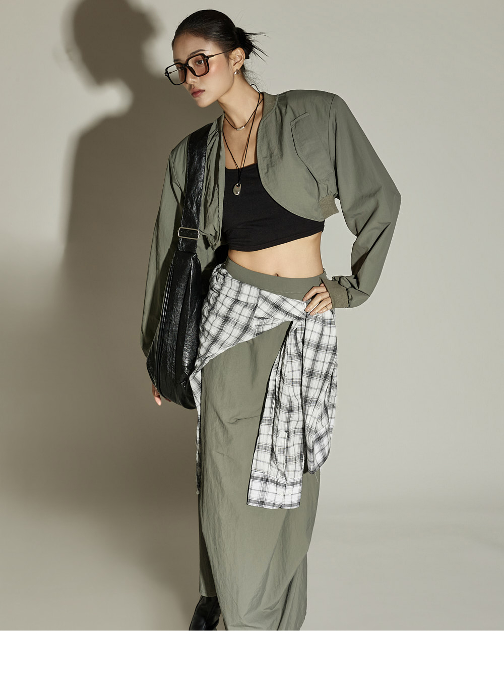 一套休闲风格的短款飞行夹克外套与褶皱裙组合。