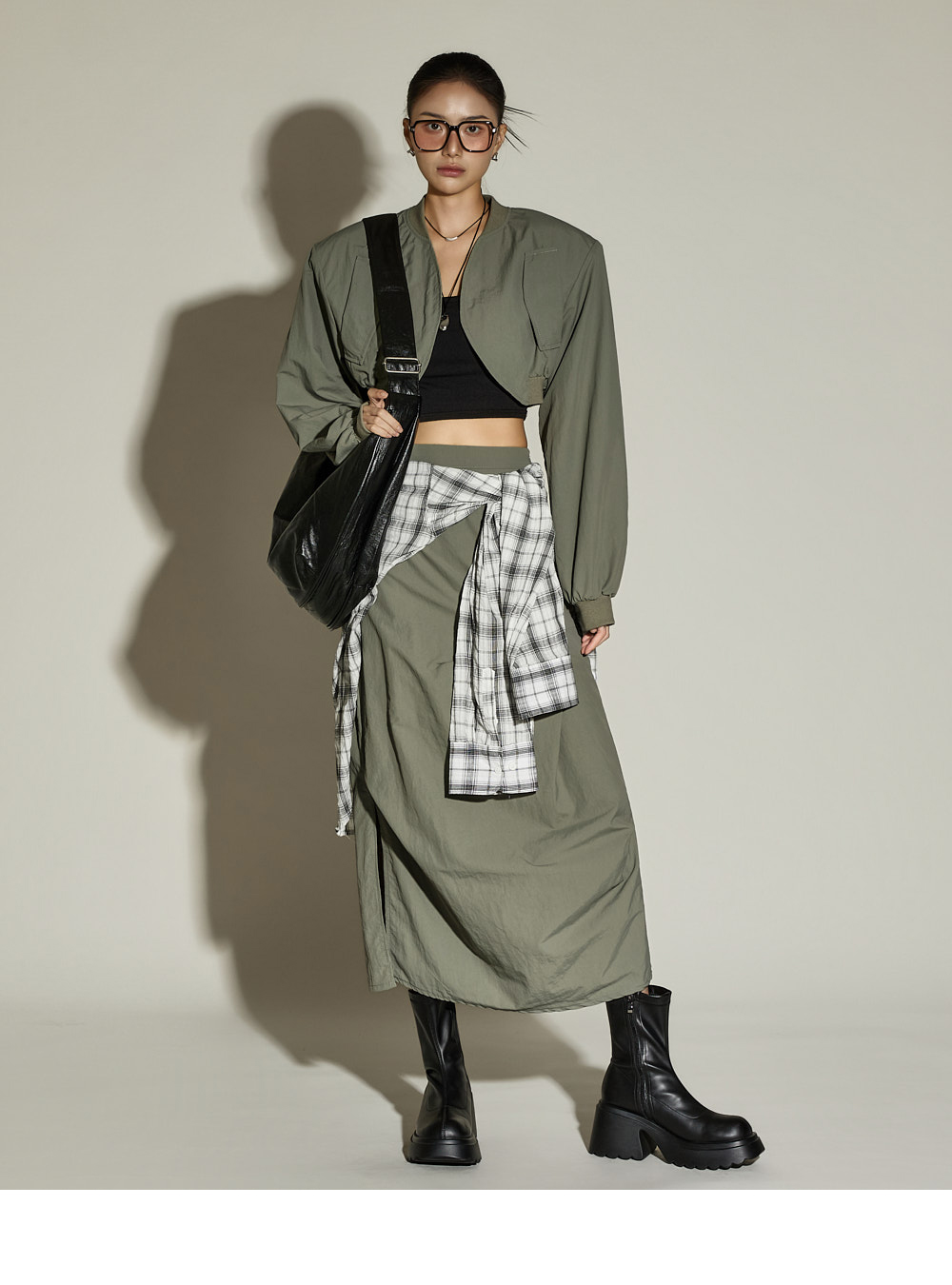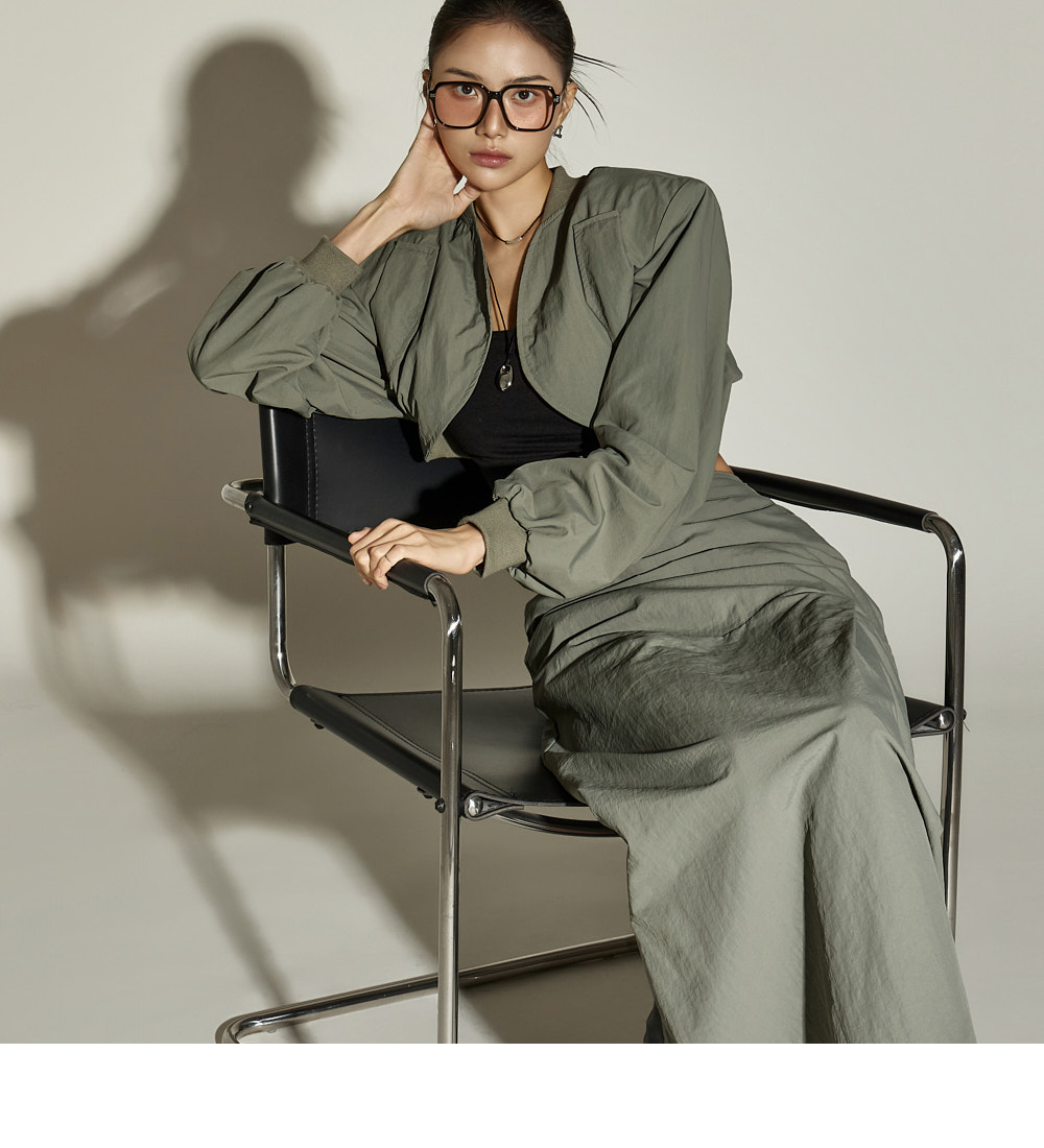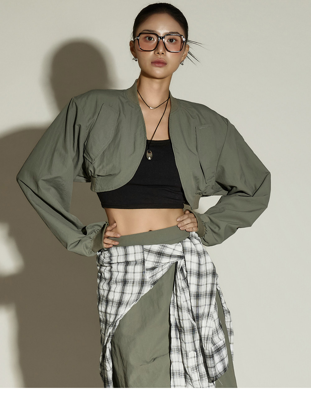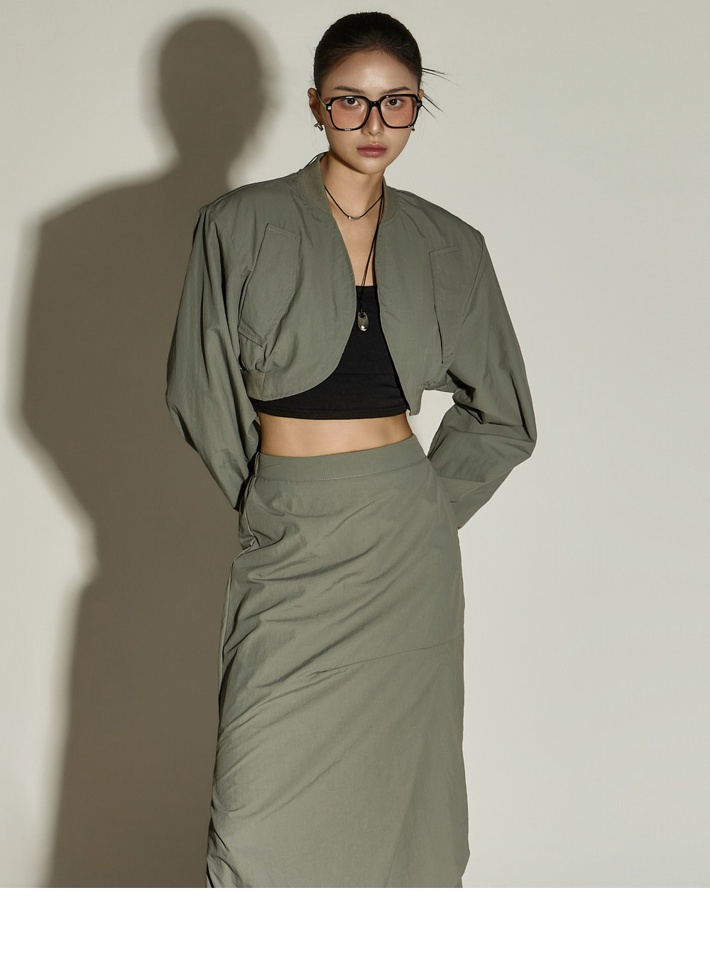 一套休闲风格的短款飞行夹克外套与褶皱裙组合。