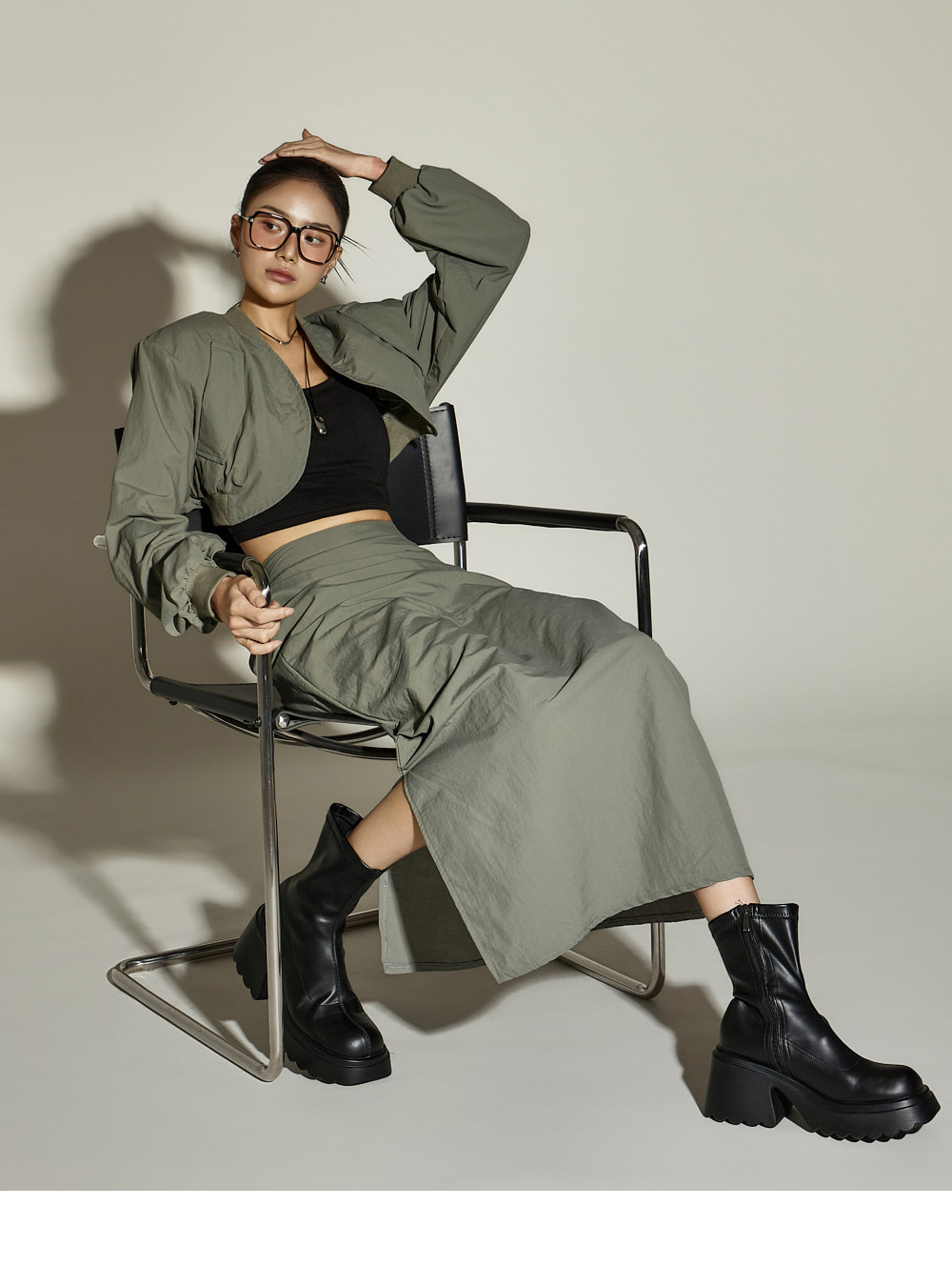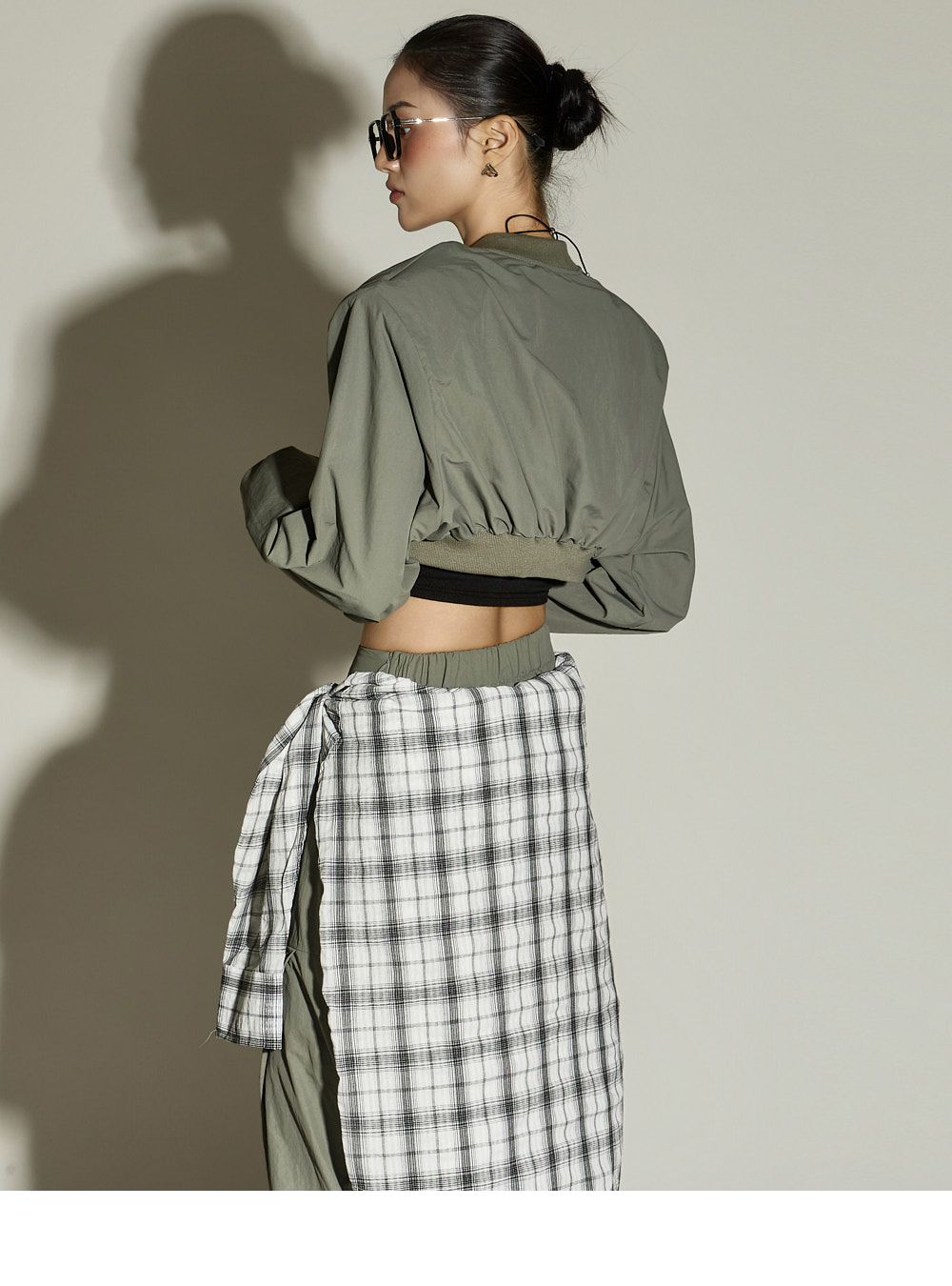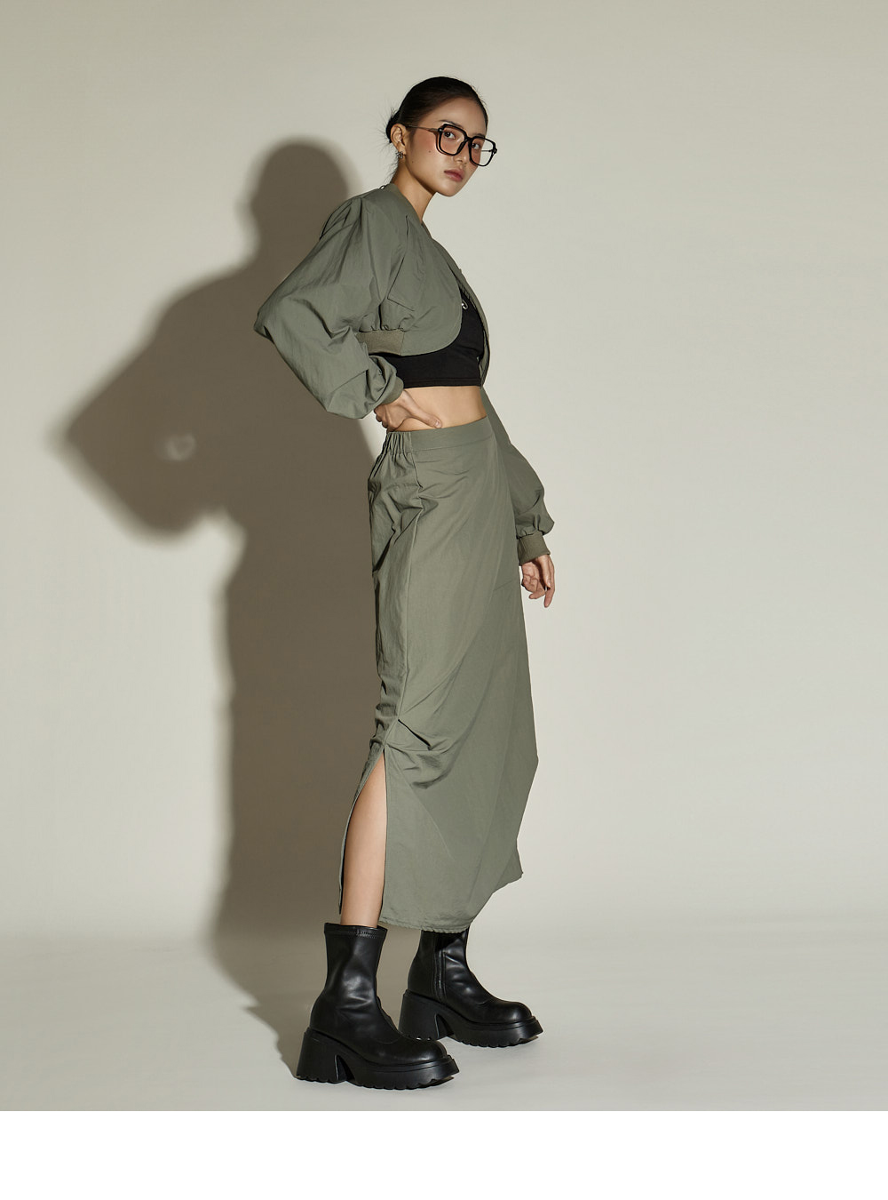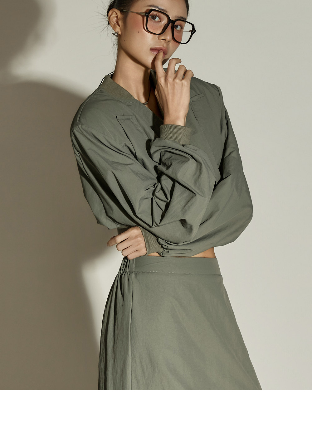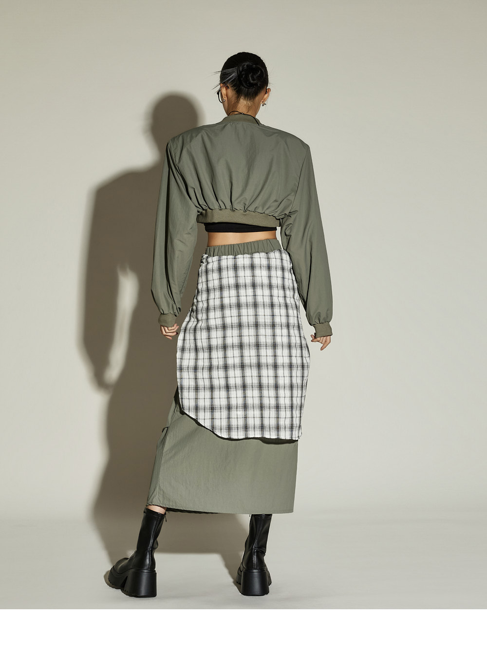 一套休闲风格的短款飞行夹克外套与褶皱裙组合。