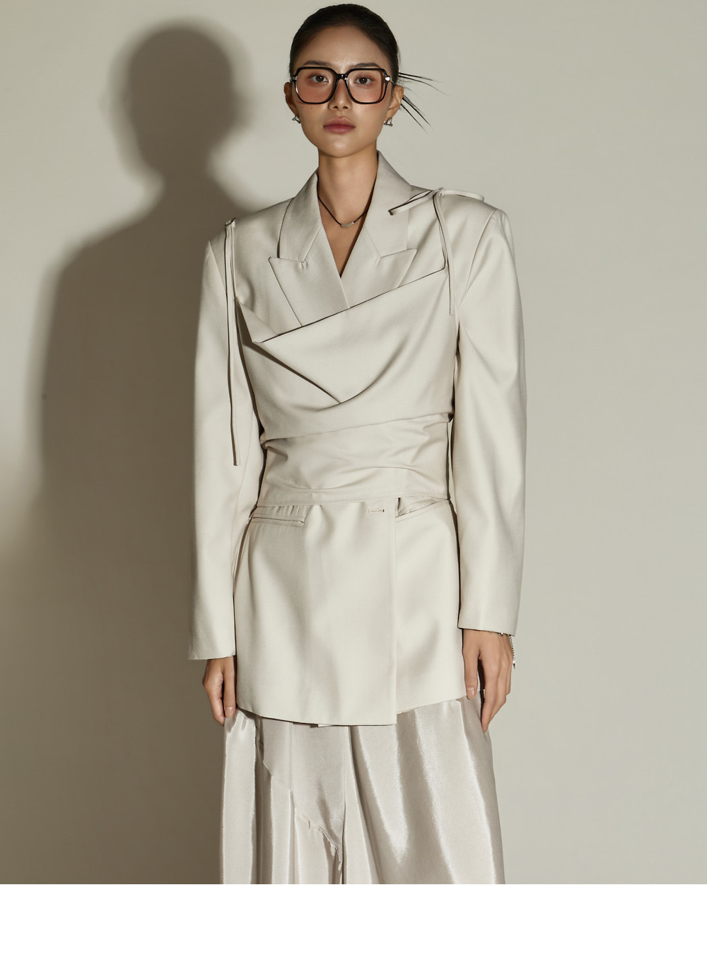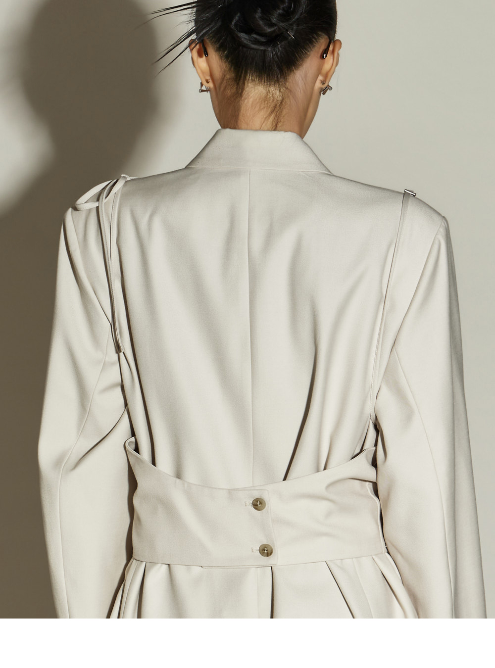 袖口纽扣、后背开衩、前襟纽扣等经典细节,