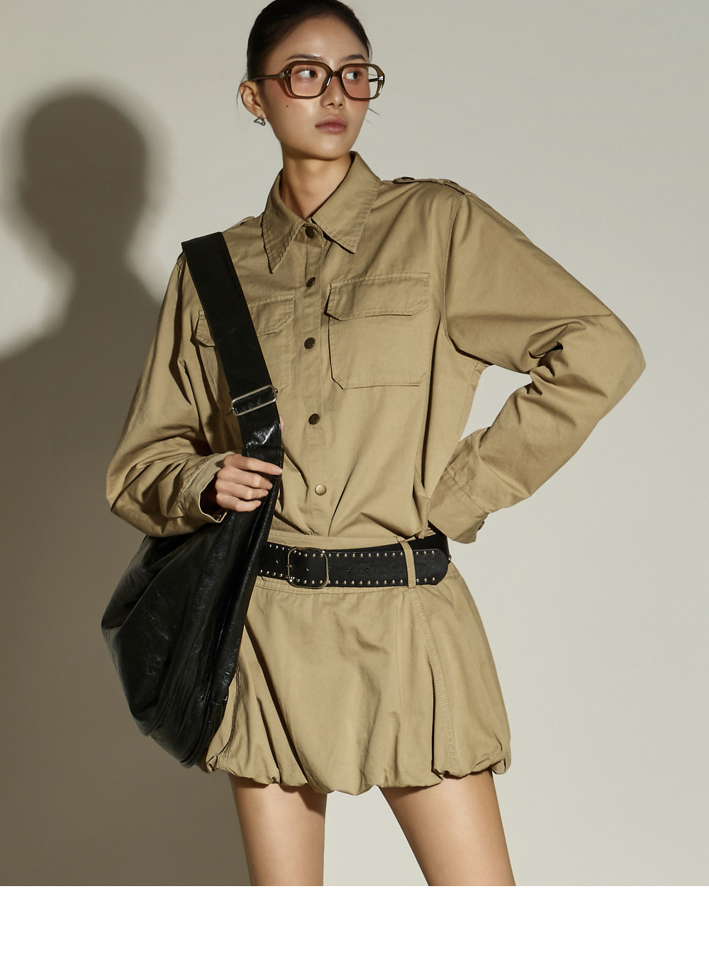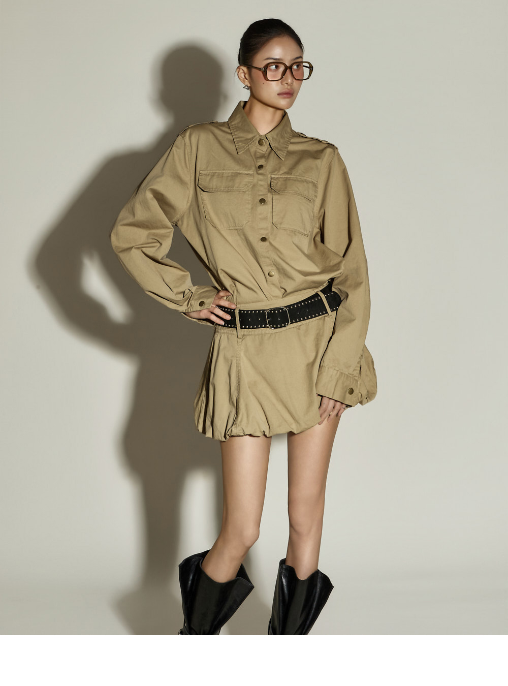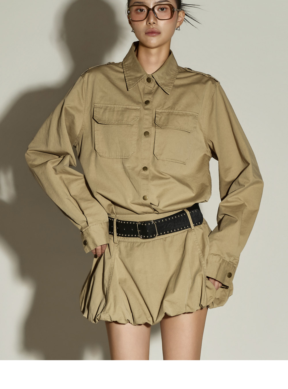 一款独特氛围的两件套套装。 采用棉与聚酯混纺面料制作,穿着舒适,ONE 尺码设计,任何人都能轻松驾驭。 上衣为衬衫款式,宽松版型,U 型下摆设计,打造独特轮廓,胸前双口袋增添休闲细节,前襟纽扣设计便于轻松穿脱。 下装为气球型迷你裙,增添可爱且独特的氛围,内置安全裤保证舒适穿着,侧边拉链设计便捷实用。 两件套组合,无需犹豫即可完成高质感造型,可搭配多种外套,随季节灵活穿搭。 171CM 模特穿着 ONE 尺码,颜色为 BEIGE。