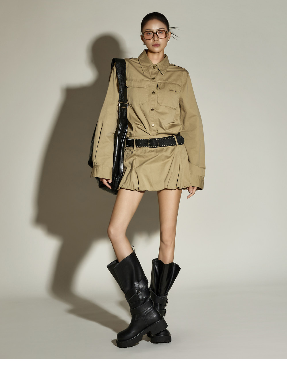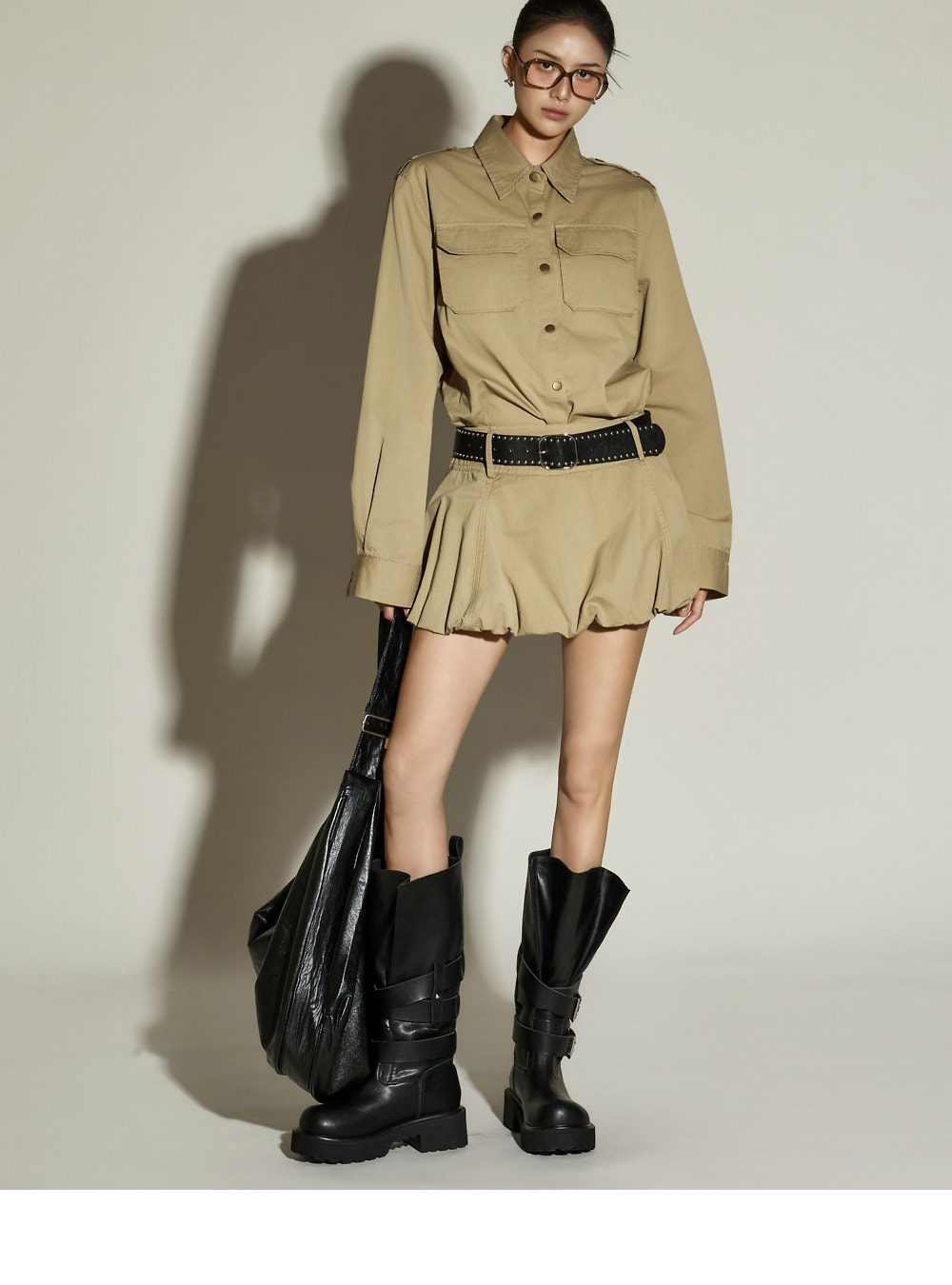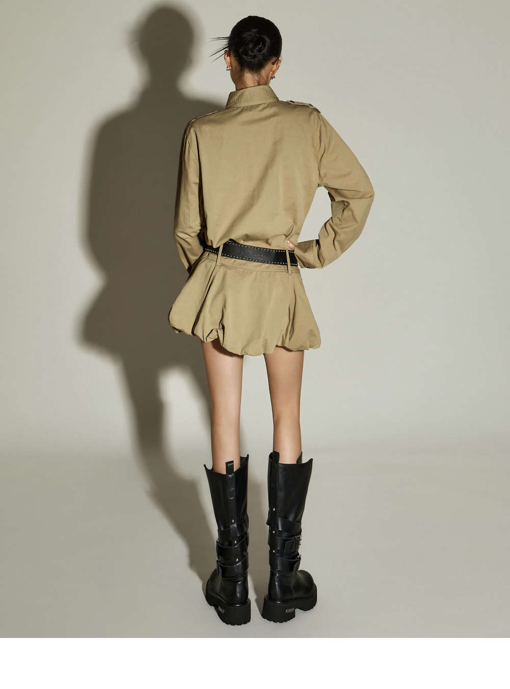 一款独特氛围的两件套套装。 采用棉与聚酯混纺面料制作,穿着舒适,ONE 尺码设计,任何人都能轻松驾驭。 上衣为衬衫款式,宽松版型,U 型下摆设计,打造独特轮廓,胸前双口袋增添休闲细节,前襟纽扣设计便于轻松穿脱。 下装为气球型迷你裙,增添可爱且独特的氛围,内置安全裤保证舒适穿着,侧边拉链设计便捷实用。 两件套组合,无需犹豫即可完成高质感造型,可搭配多种外套,随季节灵活穿搭。 171CM 模特穿着 ONE 尺码,颜色为 BEIGE。