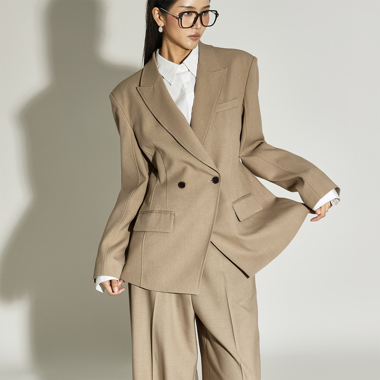现代风格双扣垫肩西装外套。 采用聚酯纤维、氨纶和人造丝混纺面料制成,兼具挺括与柔韧的穿着感,厚度适中,适合换季穿着。 适度肩垫与修身版型勾勒干净利落的轮廓,前襟双扣设计与简洁细节营造端庄精致的印象。 两侧口袋与胸部假口袋提升实用性与设计完整度,可轻松搭配西裤、半身裙或牛仔裤。 171CM 模特穿 ONE 码,BEIGE 颜色。