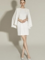 这是一款高级感十足的连衣裙。 采用聚酯纤维面料制作,质地光滑且挺括,S、M 两种尺码可根据身形选择。 无袖设计搭配披肩式袖片,展现优雅的轮廓,迷你长度增添精致气质,适度的肩垫修饰肩线,使整体更挺拔。 H型裙身剪裁,呈现干练修身线条,后背拉链设计便于穿脱,部分内衬增加穿着舒适感。 散发女性化且高级的气息,适合正式场合或特别日子穿着。 174CM 模特穿 S 尺码,示范黑色款。