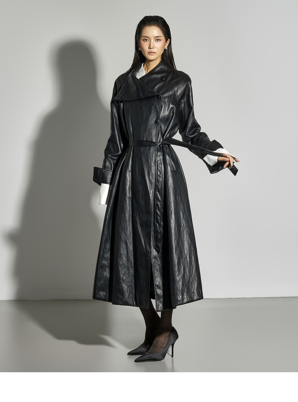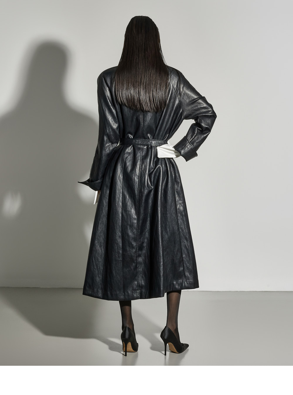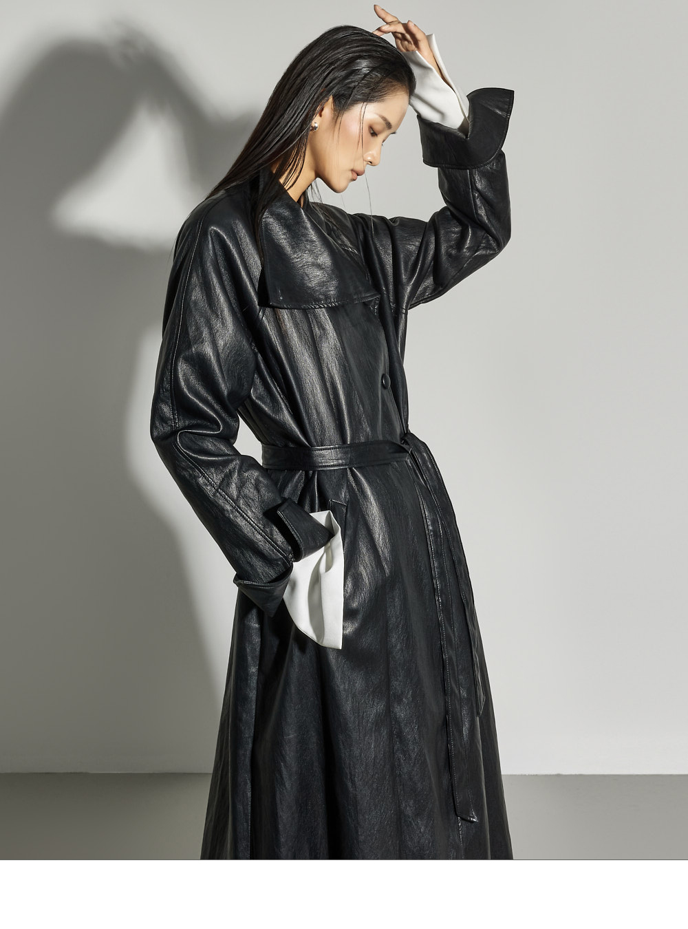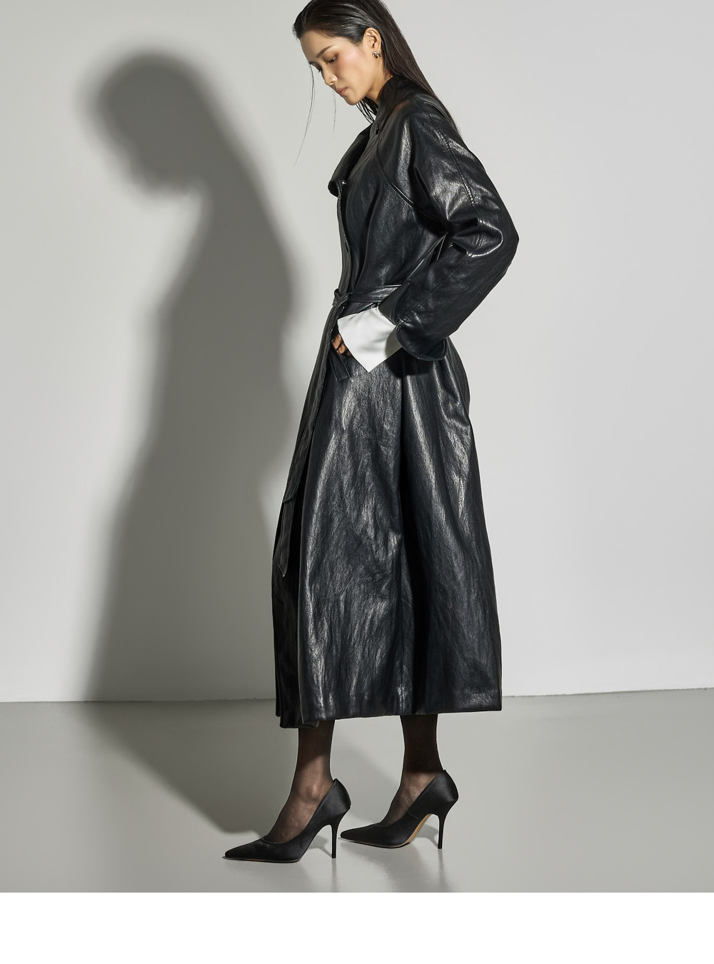 酷感风格的皮革外套。 采用聚氨酯面料制作,质感坚挺且带有低调光泽,ONE 码设计呈现宽松而精致的廓形。 在极简线条中突显结构化细节,营造强烈的个性氛围;前襟的垂褶设计增添独特感,腰部配套腰带可灵活调节整体轮廓。 凭借面料本身的挺度与结构感展现存在感,塑造高贵而精致的视觉印象,并辅以全内衬提升整体品质。 前襟纽扣闭合与双侧口袋增加实用性,非常适合作为早秋或晚春外套,打造硬朗有型的穿搭效果。 174CM 模特,ONE 码,BLACK 色。
