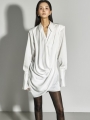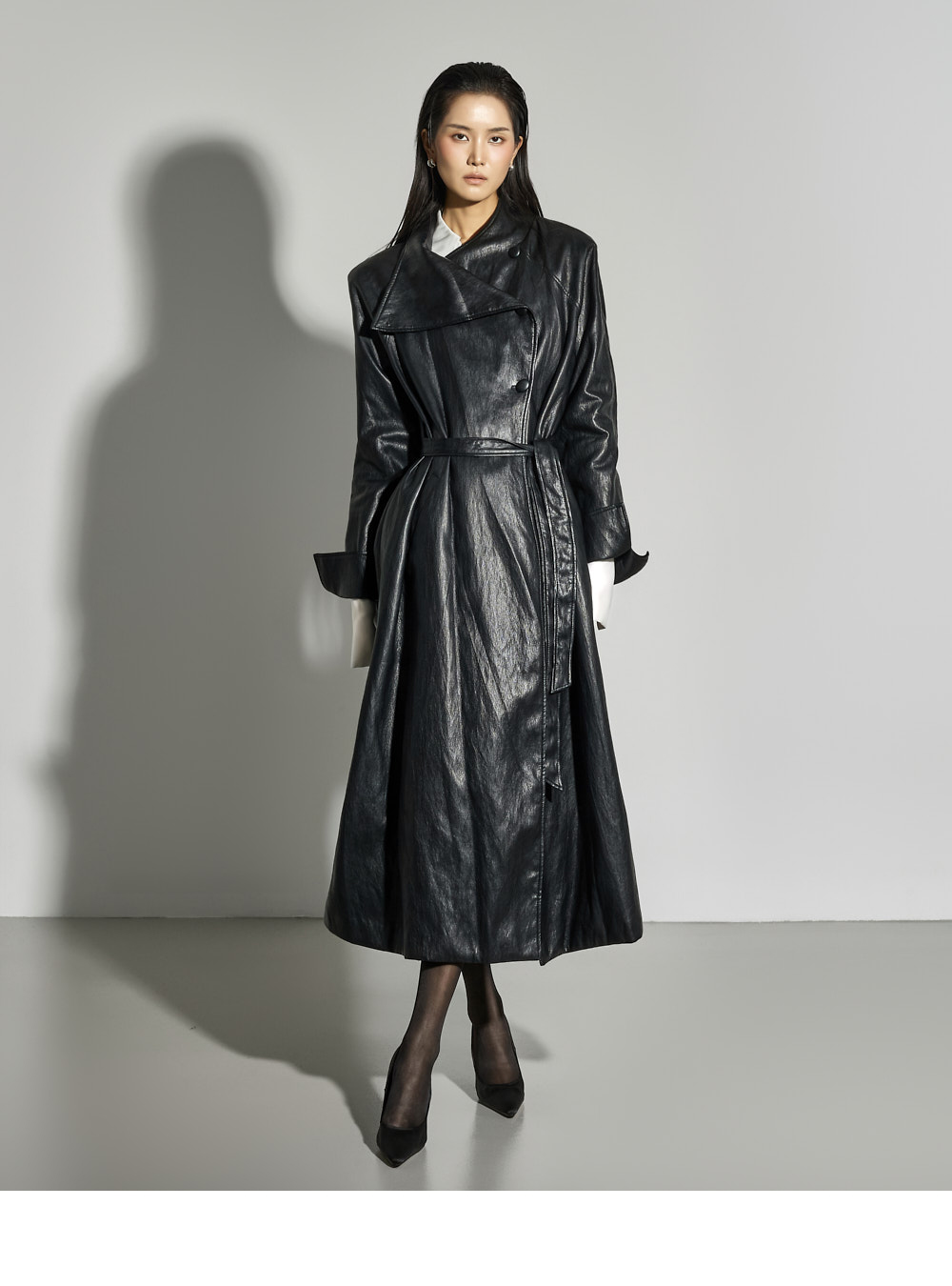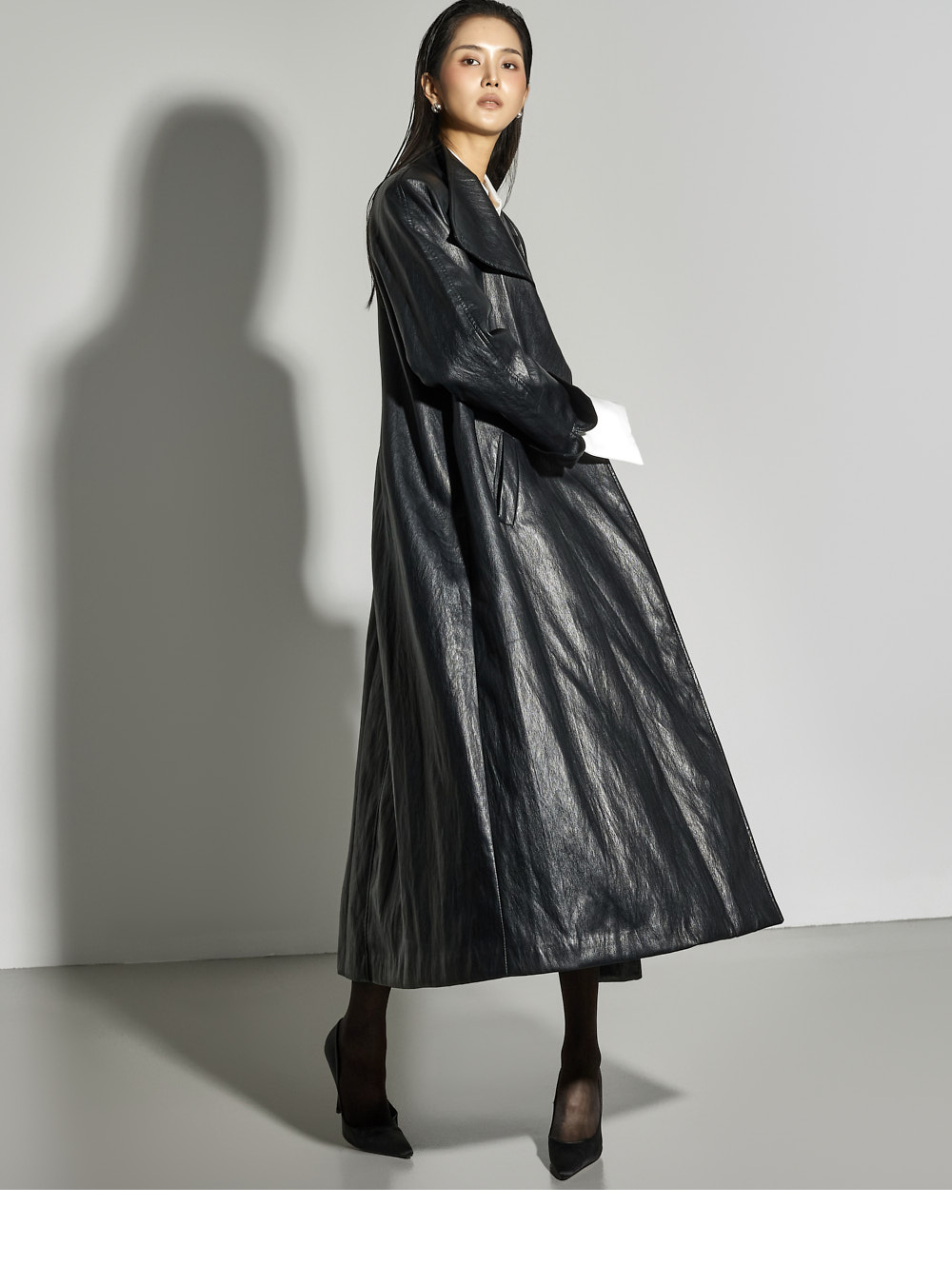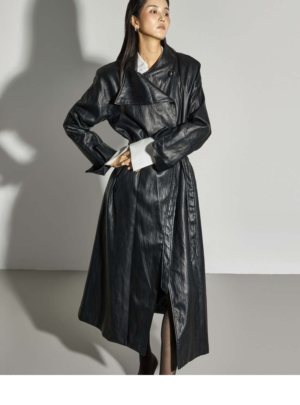 酷感风格的皮革外套。 采用聚氨酯面料制作,质感坚挺且带有低调光泽,ONE 码设计呈现宽松而精致的廓形。 在极简线条中突显结构化细节,营造强烈的个性氛围;前襟的垂褶设计增添独特感,腰部配套腰带可灵活调节整体轮廓。 凭借面料本身的挺度与结构感展现存在感,塑造高贵而精致的视觉印象,并辅以全内衬提升整体品质。 前襟纽扣闭合与双侧口袋增加实用性,非常适合作为早秋或晚春外套,打造硬朗有型的穿搭效果。 174CM 模特,ONE 码,BLACK 色。