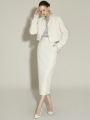 隐形扣设计保持前襟整洁,适中的肩垫提供稳固的贴合感。由于象牙色材质特性,略有透视感,建议搭配打底衫穿着。