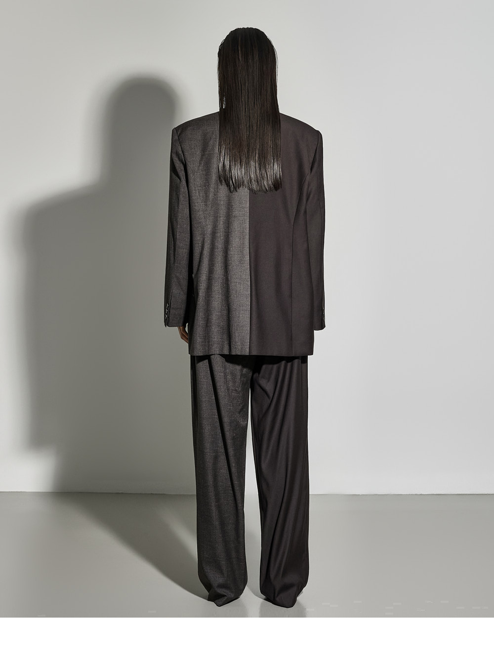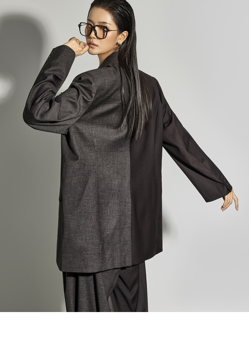 一侧为纯色,另一侧为细格纹拼接设计,带来独特的视觉亮点,即使单穿也能为整体造型增添个性。