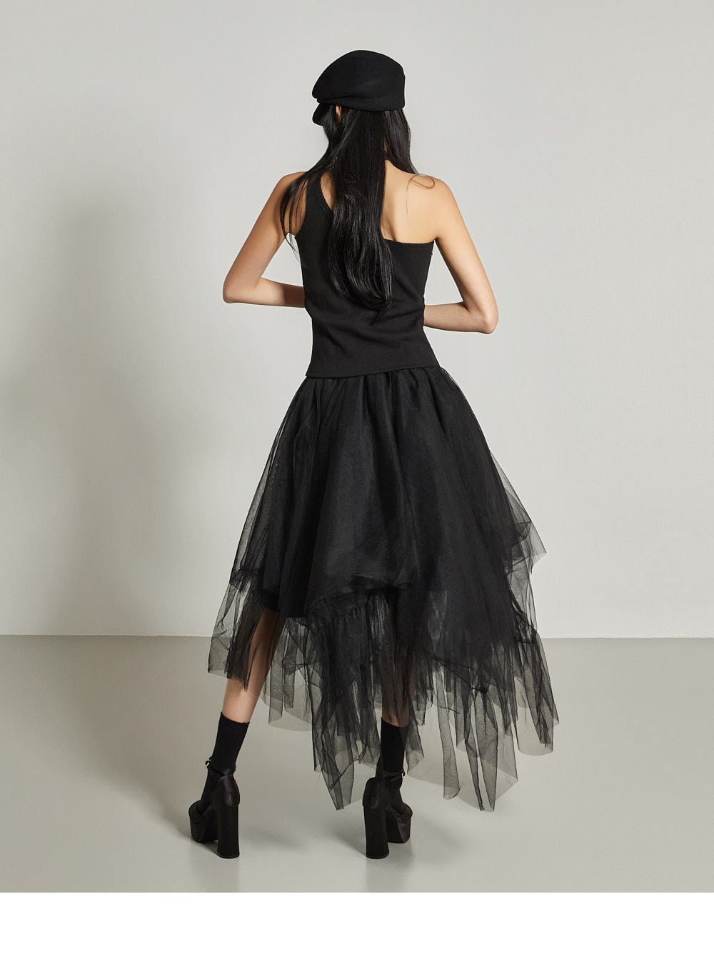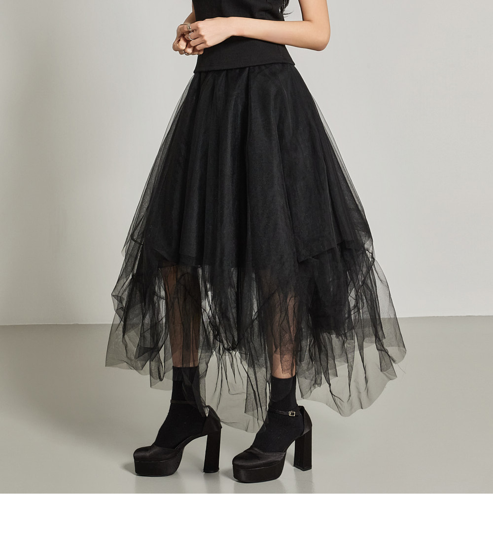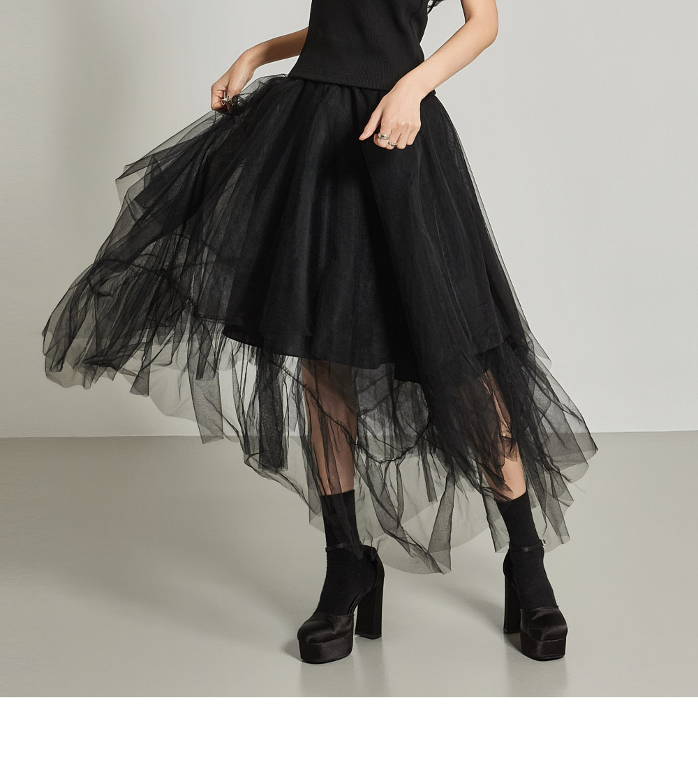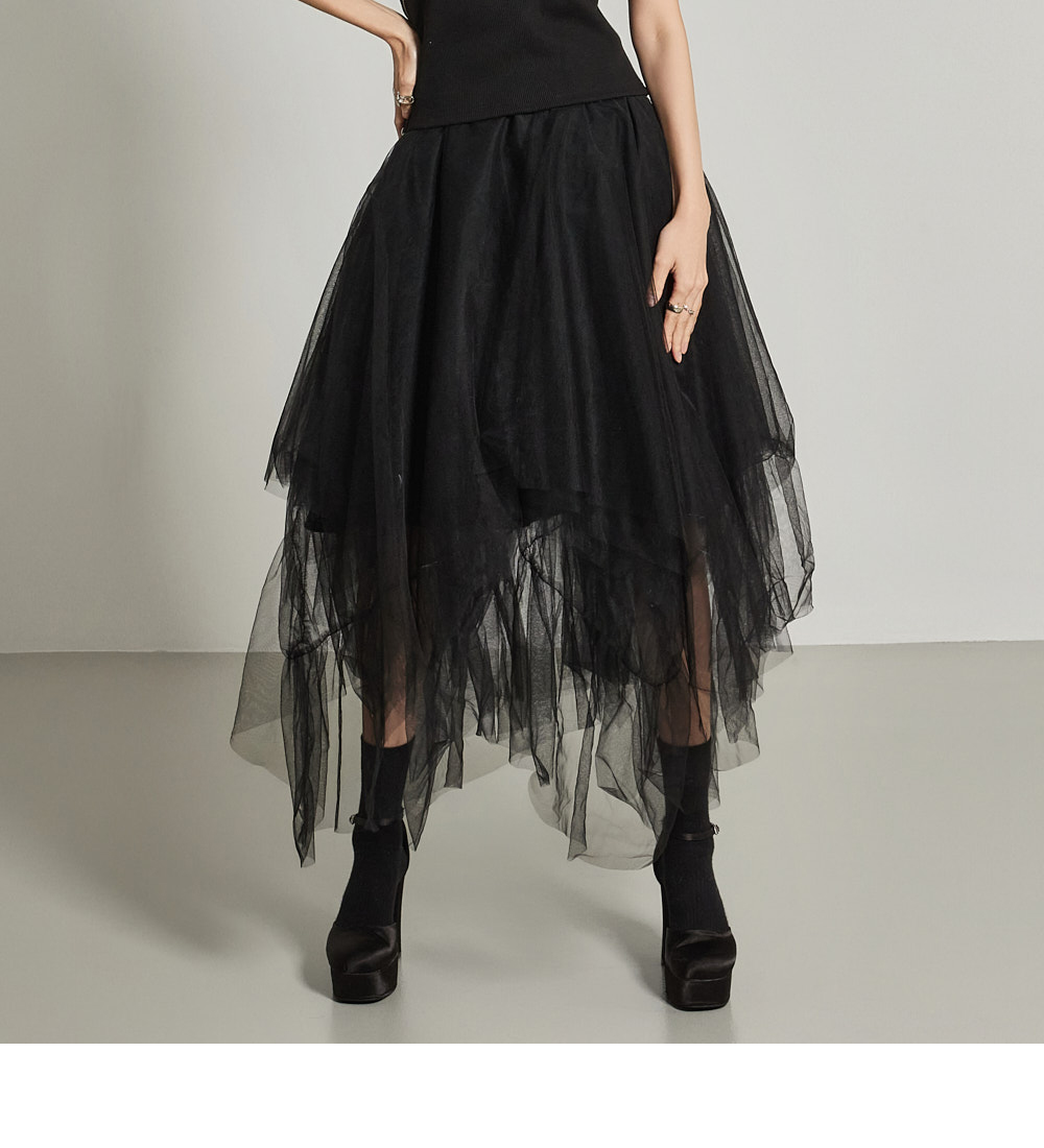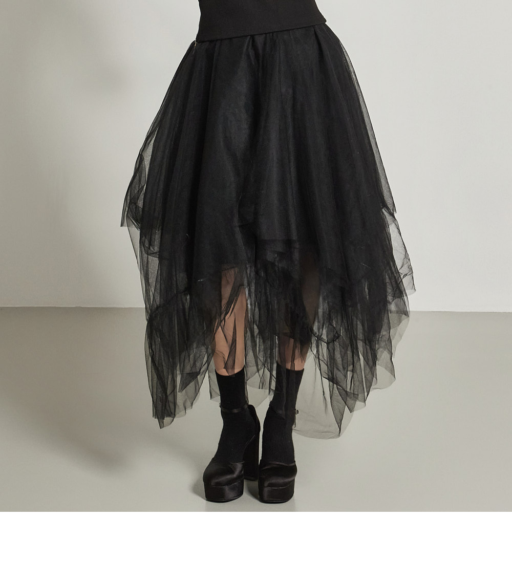 这是一款兼具独特与优雅氛围的不规则纱质半裙。 采用聚酯纤维材质制作,轻盈且富有蓬松感的剪裁展现立体轮廓,随动作轻轻摇曳,透视层次感自然呈现。 腰部后松紧设计提供舒适穿着感,侧边拉链确保整洁的裙型。 自然裁剪细节增添独特感,局部内衬可有效减少透视,穿着稳妥且安心。 即使搭配基础上衣或外套,也能成为造型亮点,打造感性独特的时尚造型。 171CM 模特,ONE 尺码,BLACK 色穿着。