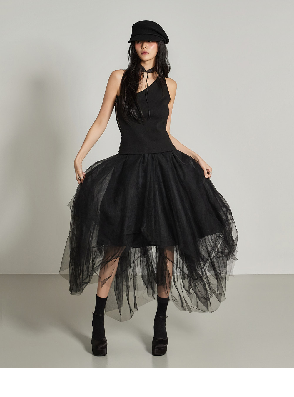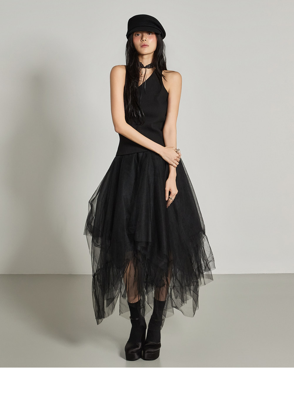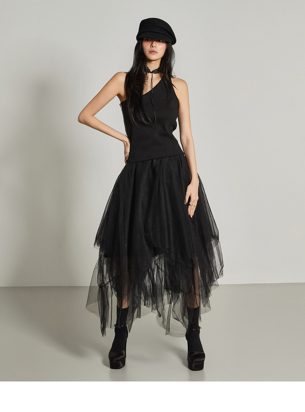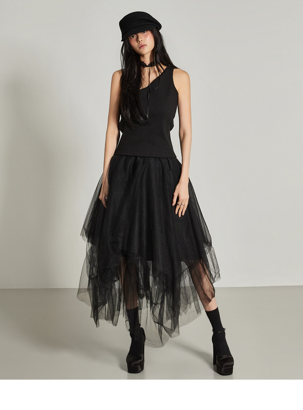 这是一款兼具独特与优雅氛围的不规则纱质半裙。 采用聚酯纤维材质制作,轻盈且富有蓬松感的剪裁展现立体轮廓,随动作轻轻摇曳,透视层次感自然呈现。 腰部后松紧设计提供舒适穿着感,侧边拉链确保整洁的裙型。 自然裁剪细节增添独特感,局部内衬可有效减少透视,穿着稳妥且安心。 即使搭配基础上衣或外套,也能成为造型亮点,打造感性独特的时尚造型。 171CM 模特,ONE 尺码,BLACK 色穿着。