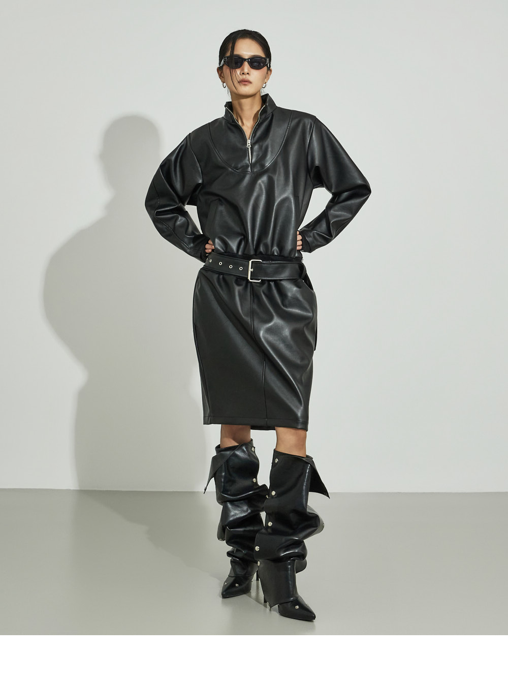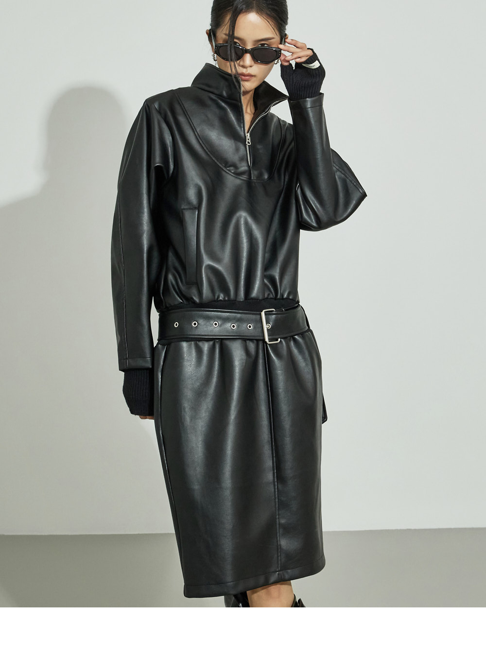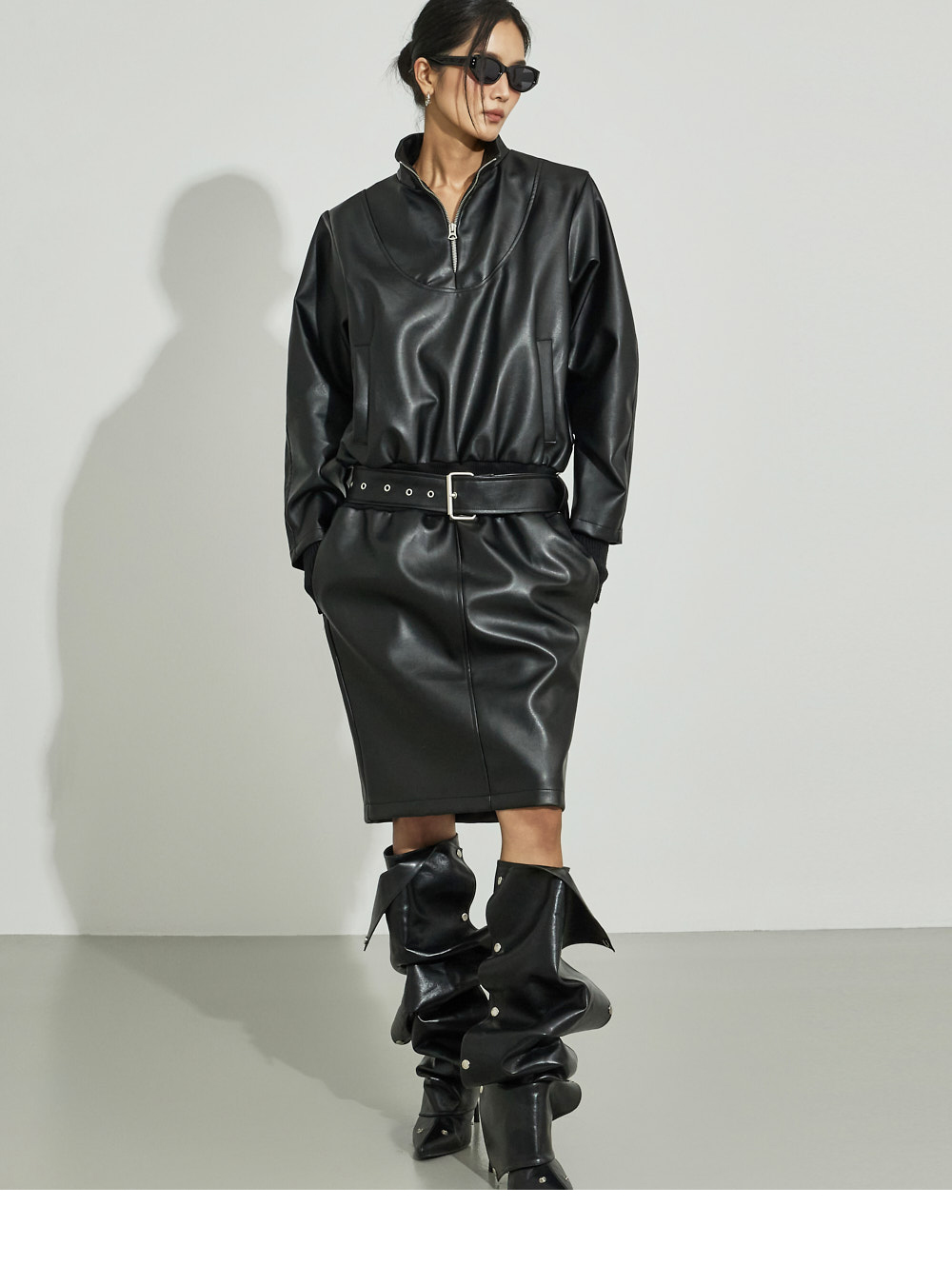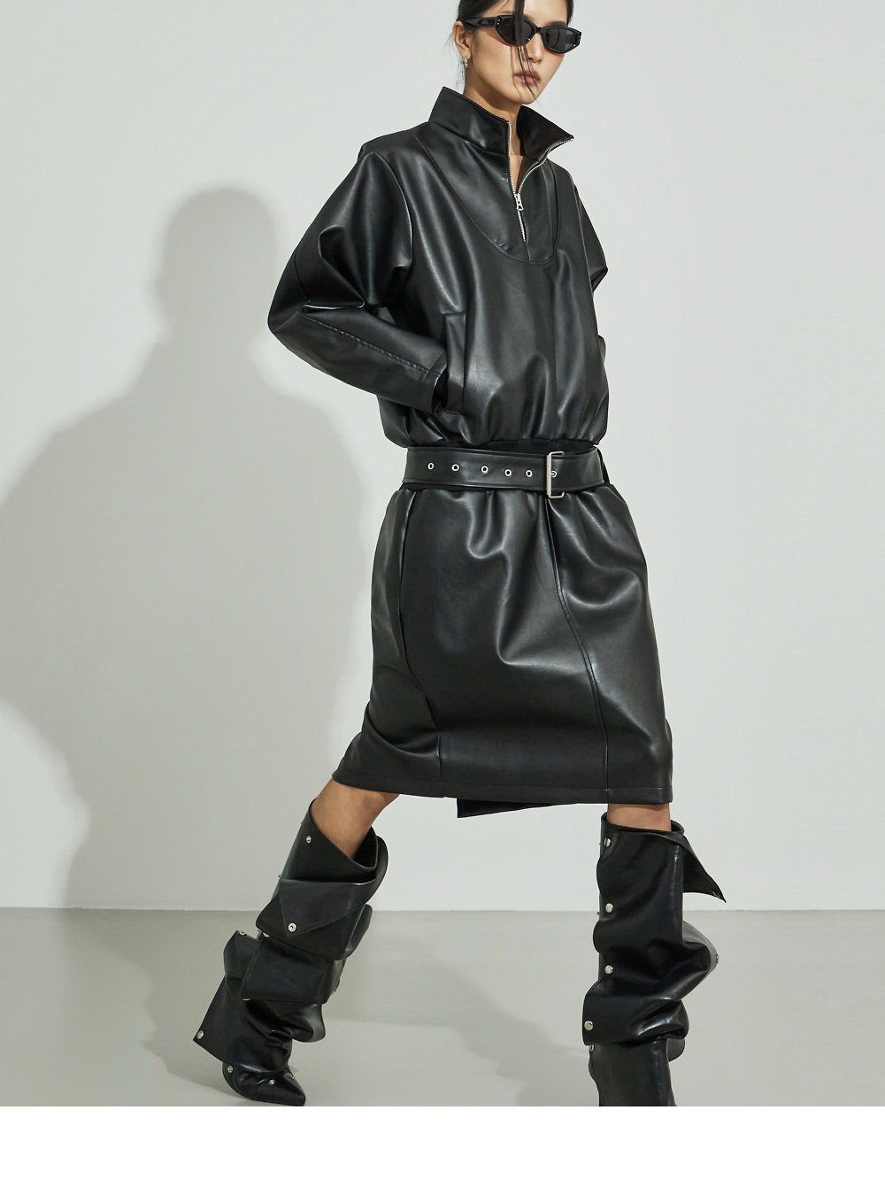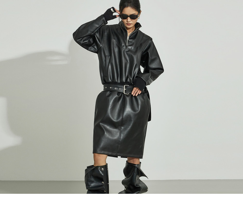 这是一款散发时尚气息的腰带套装皮革连衣裙。 采用聚氨酯与粘纤混纺面料制作,质感坚韧且富有弹性的皮革纹理十分突出,宽松版型既舒适又能营造感性的氛围。 半高领设计与半拉链开合,增添干练而现代的细节。 腰部松紧设计,搭配腰带套装,可自由调整轮廓,展现多样氛围,上衣与裙子两侧口袋兼具实用性。 适合正式场合以及追求独特氛围的造型,是一款兼具时尚感与实穿性的皮革连衣裙。 模特身高173CM,穿着ONE尺码,颜色为BLACK。
