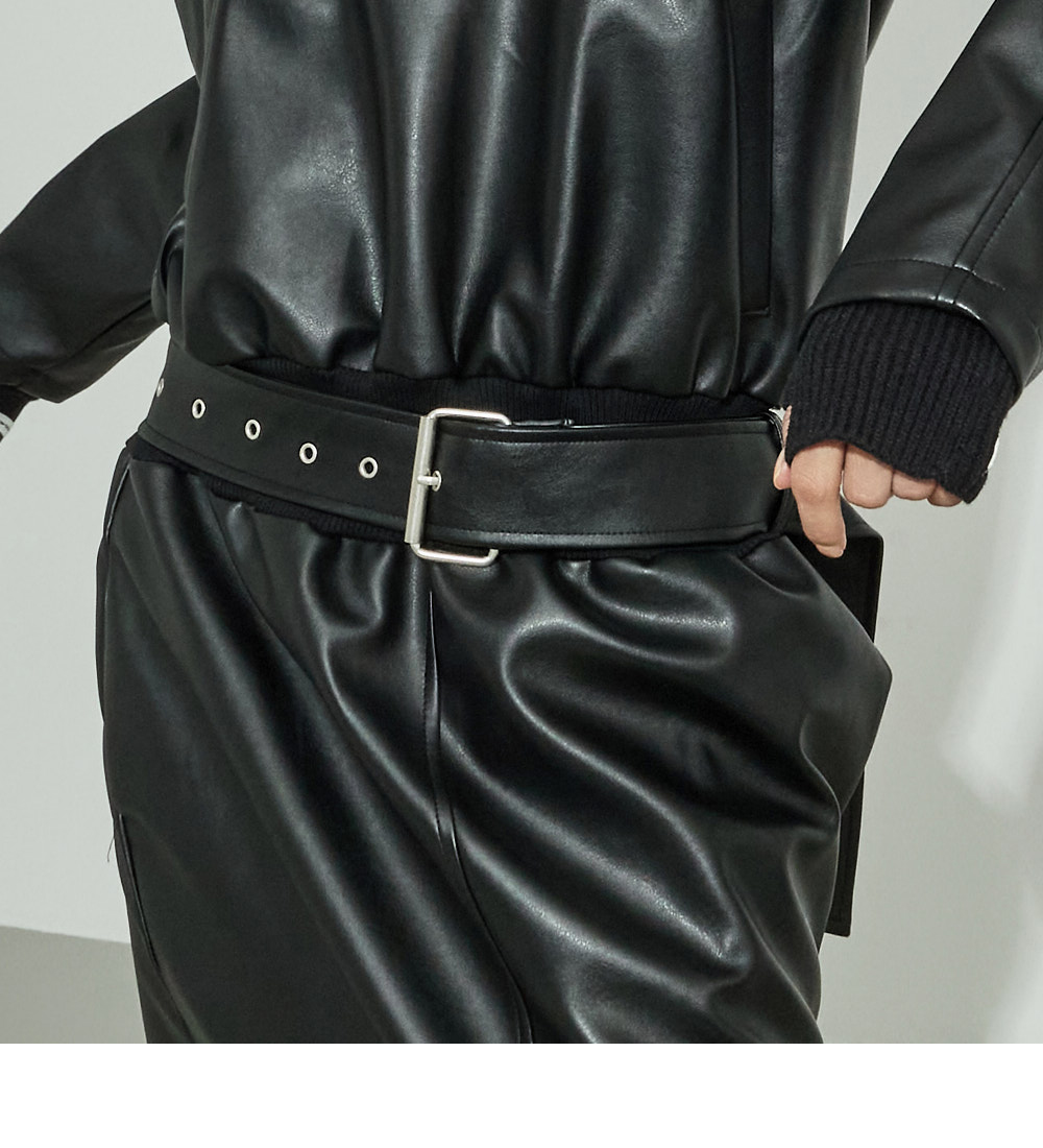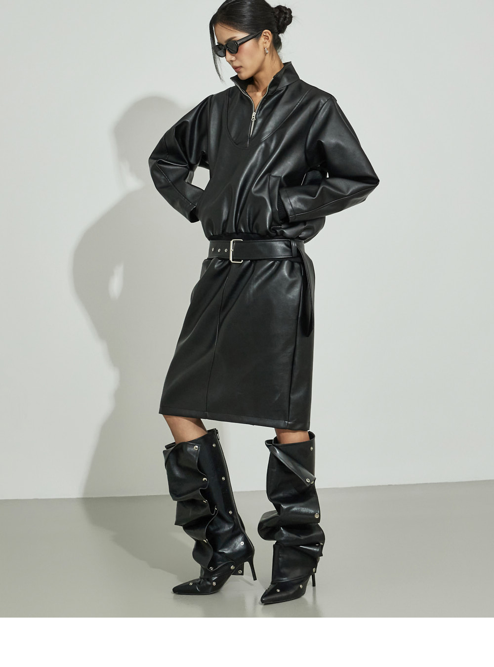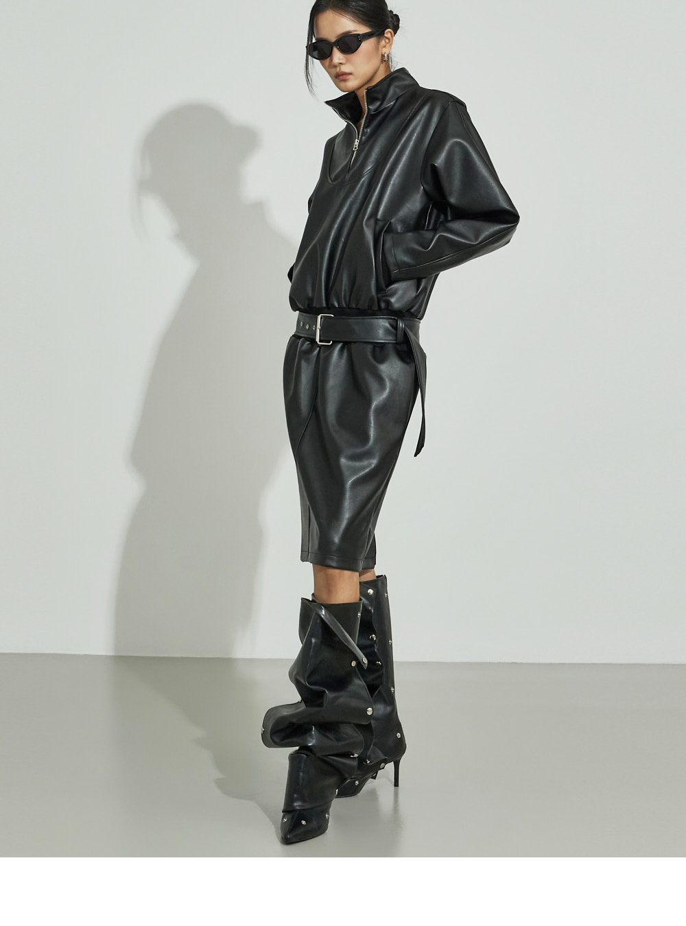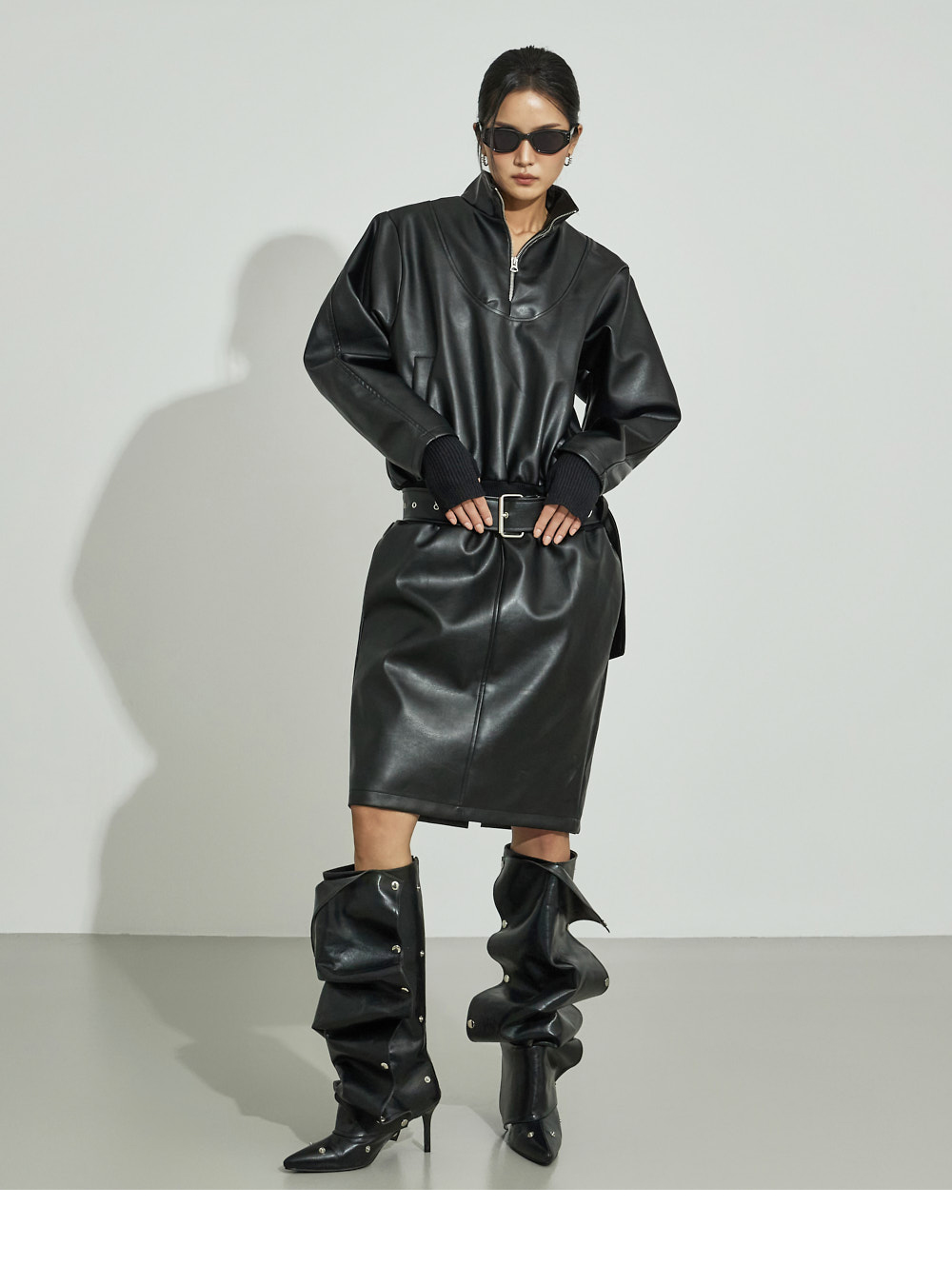 这是一款散发时尚气息的腰带套装皮革连衣裙。 采用聚氨酯与粘纤混纺面料制作,质感坚韧且富有弹性的皮革纹理十分突出,宽松版型既舒适又能营造感性的氛围。 半高领设计与半拉链开合,增添干练而现代的细节。 腰部松紧设计,搭配腰带套装,可自由调整轮廓,展现多样氛围,上衣与裙子两侧口袋兼具实用性。 适合正式场合以及追求独特氛围的造型,是一款兼具时尚感与实穿性的皮革连衣裙。 模特身高173CM,穿着ONE尺码,颜色为BLACK。