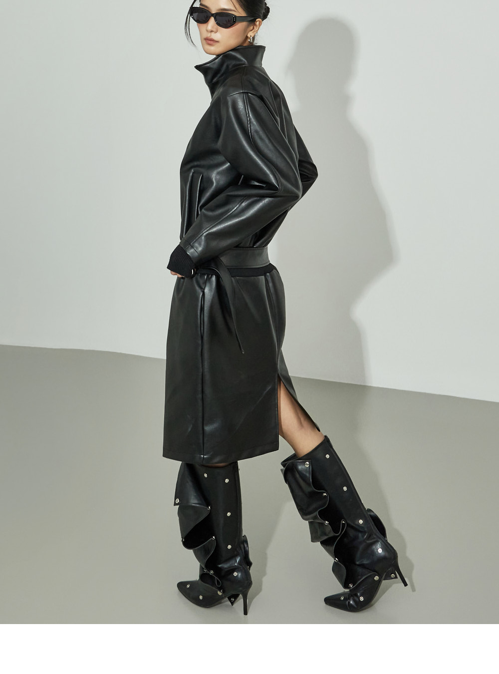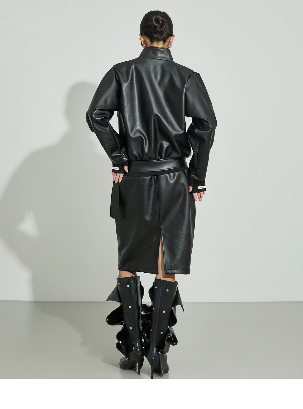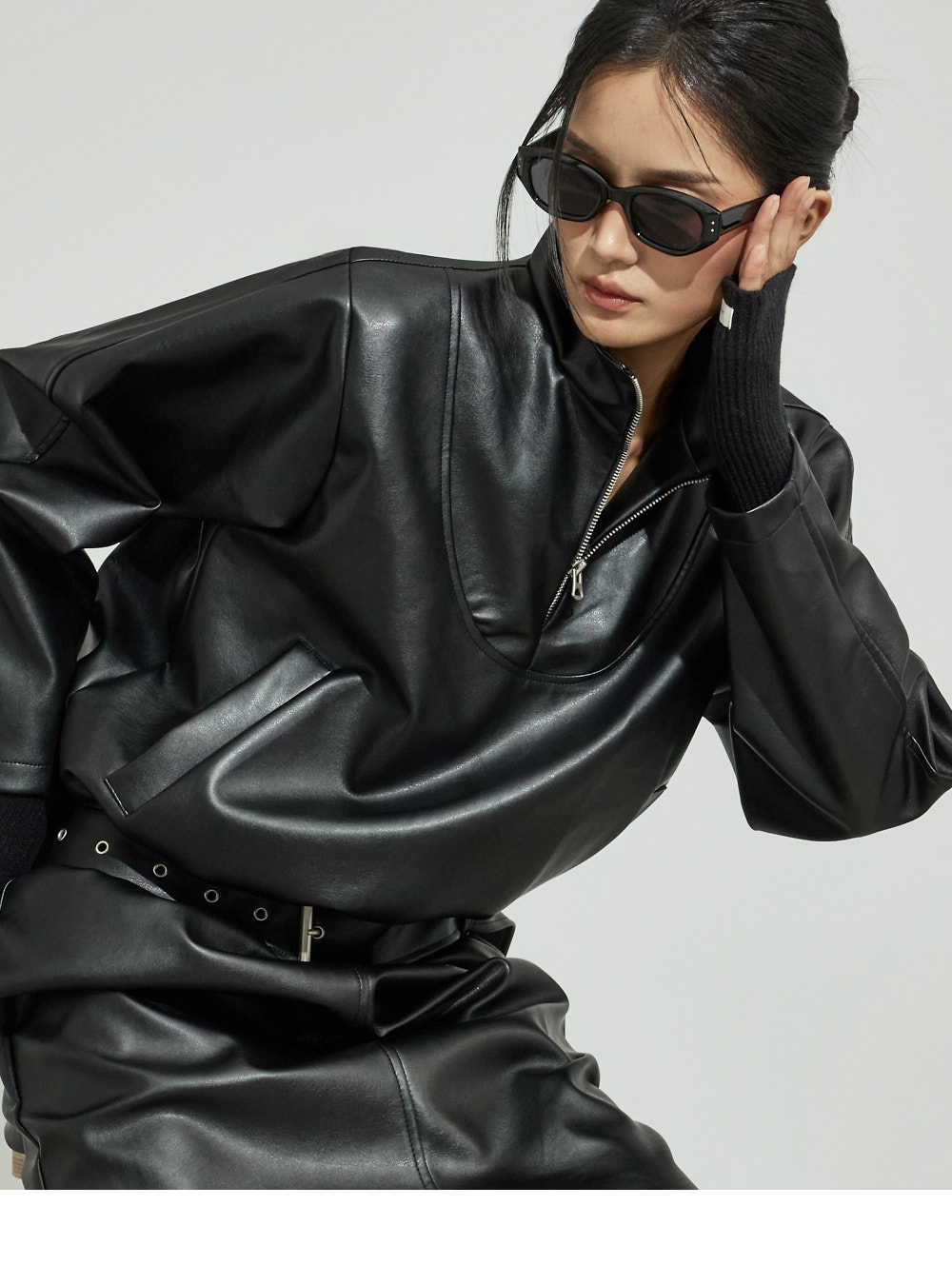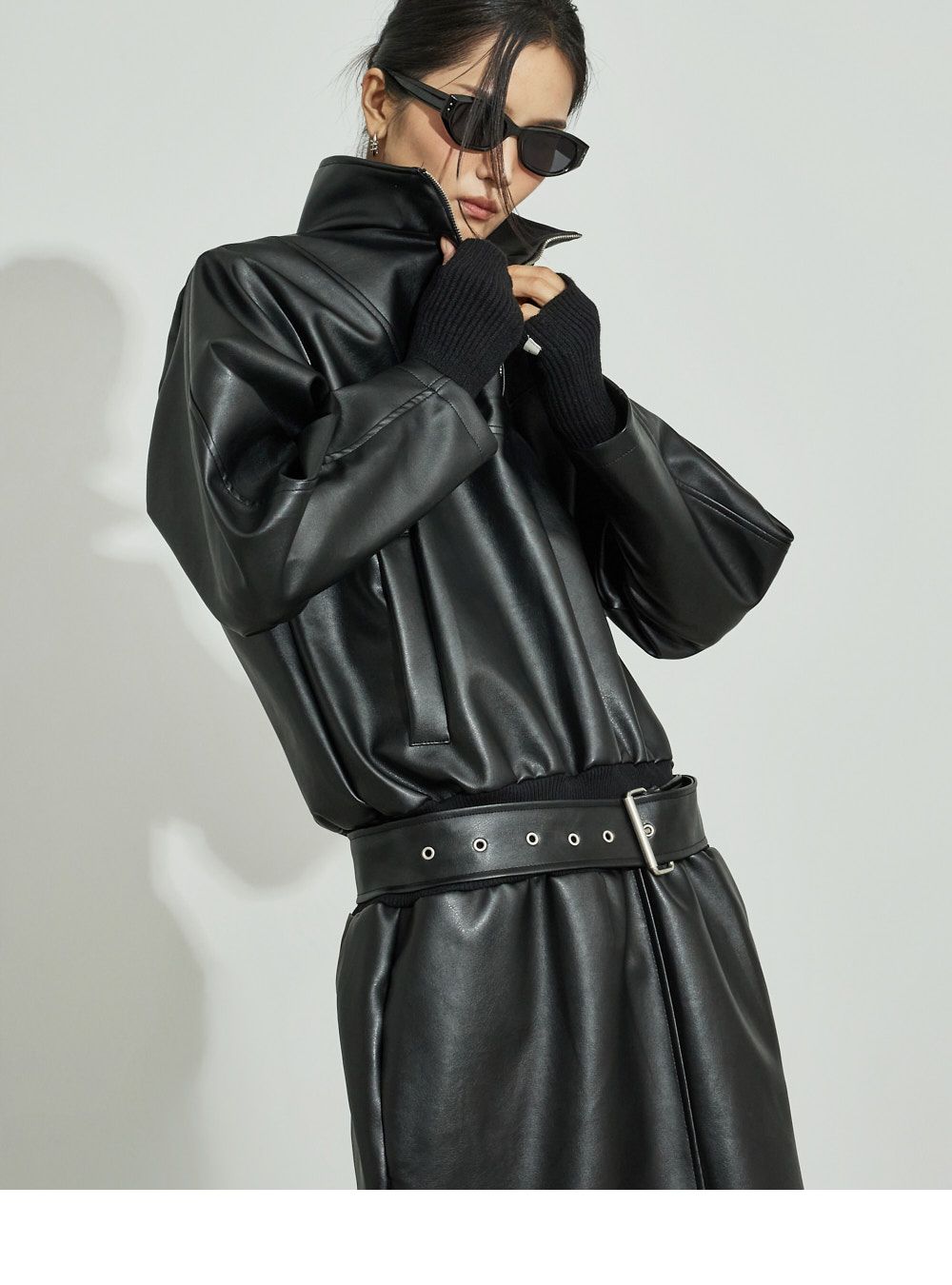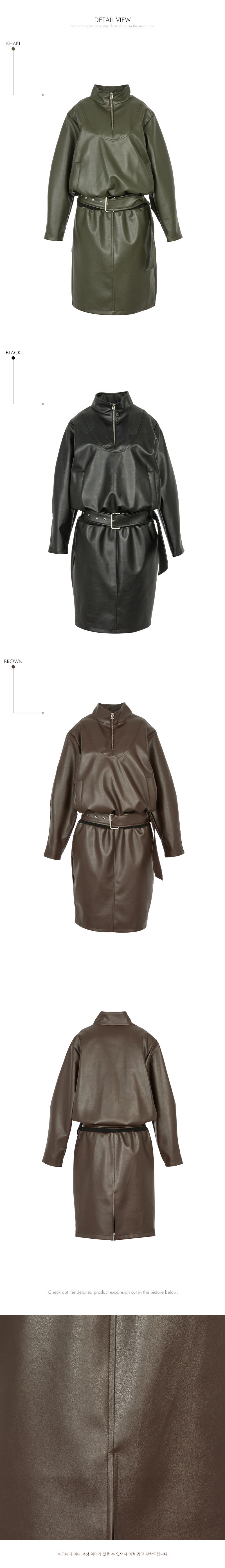 这是一款散发时尚气息的腰带套装皮革连衣裙。 采用聚氨酯与粘纤混纺面料制作,质感坚韧且富有弹性的皮革纹理十分突出,宽松版型既舒适又能营造感性的氛围。 半高领设计与半拉链开合,增添干练而现代的细节。 腰部松紧设计,搭配腰带套装,可自由调整轮廓,展现多样氛围,上衣与裙子两侧口袋兼具实用性。 适合正式场合以及追求独特氛围的造型,是一款兼具时尚感与实穿性的皮革连衣裙。 模特身高173CM,穿着ONE尺码,颜色为BLACK。