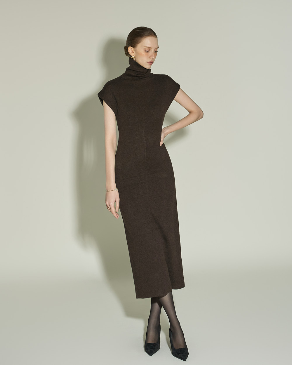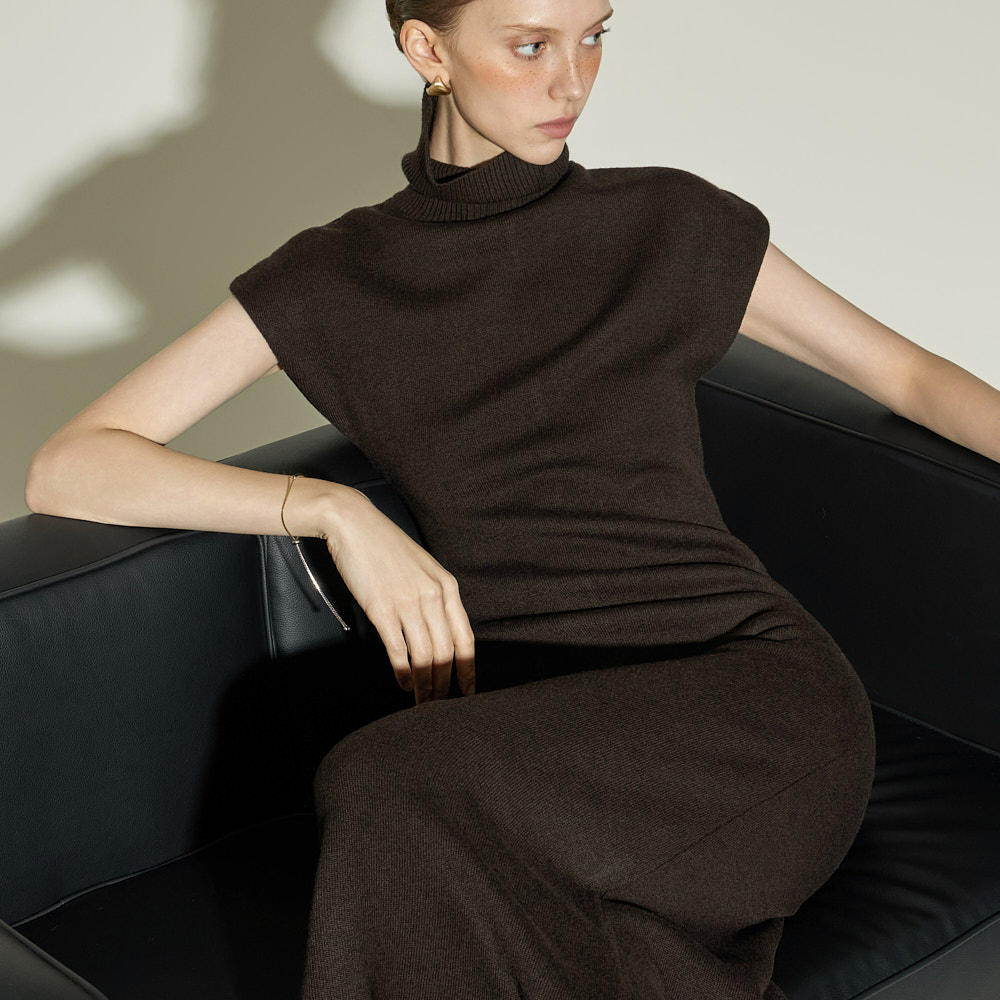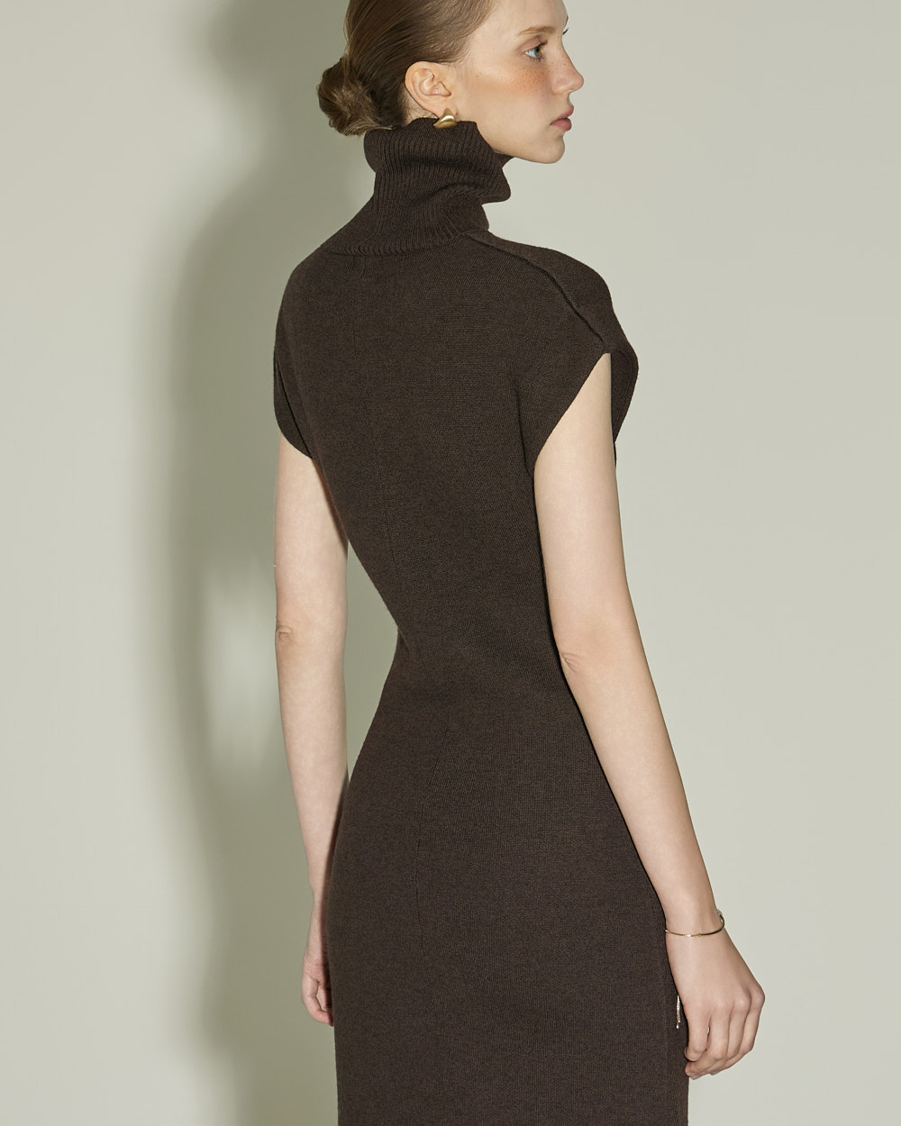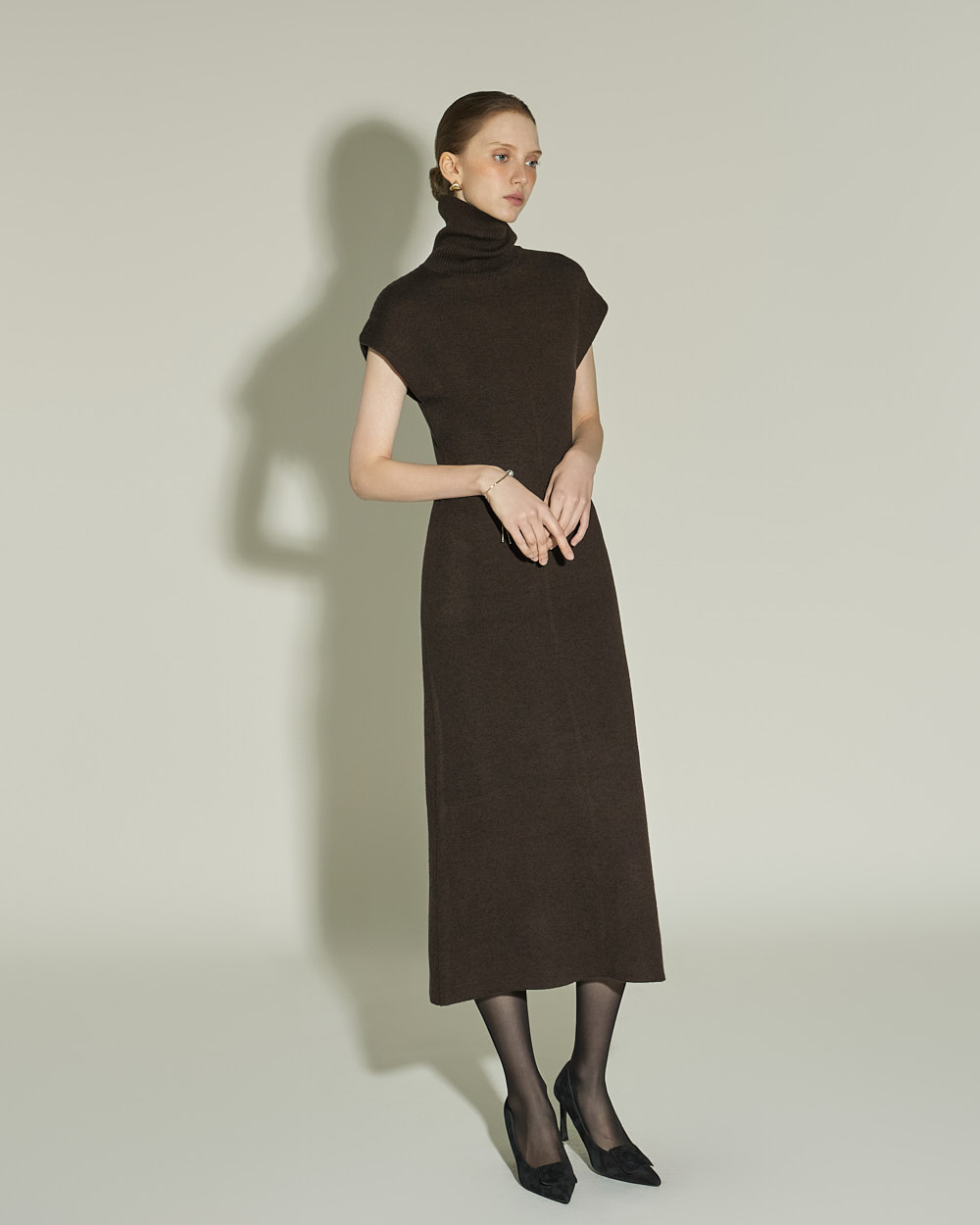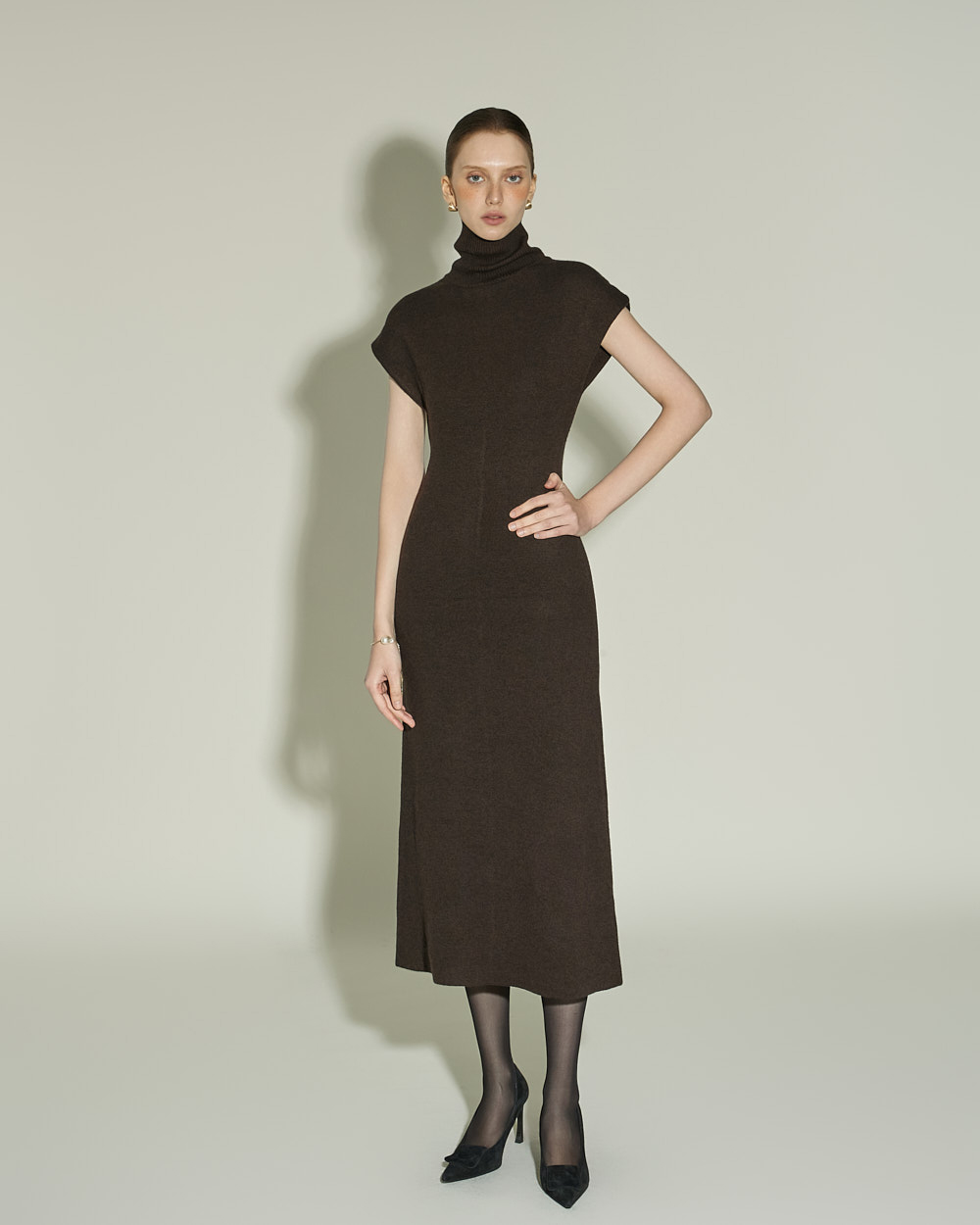 这是一款具有摩登氛围的高领羊毛针织连衣裙。