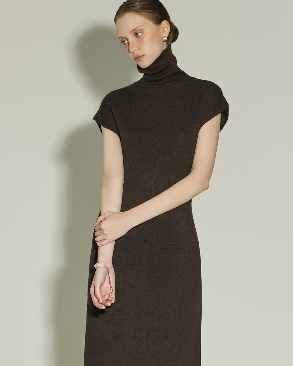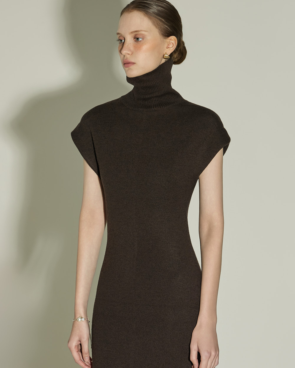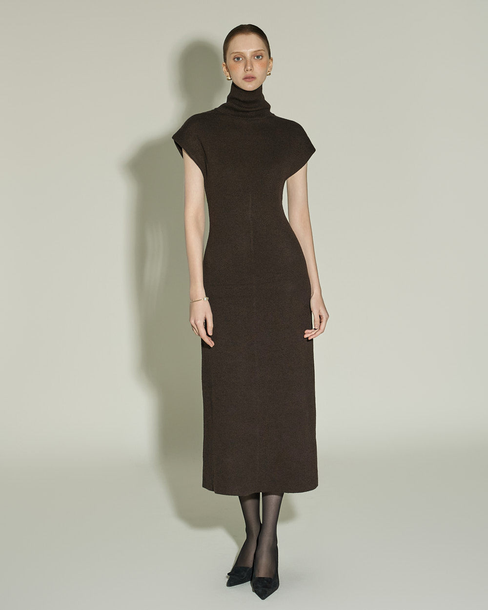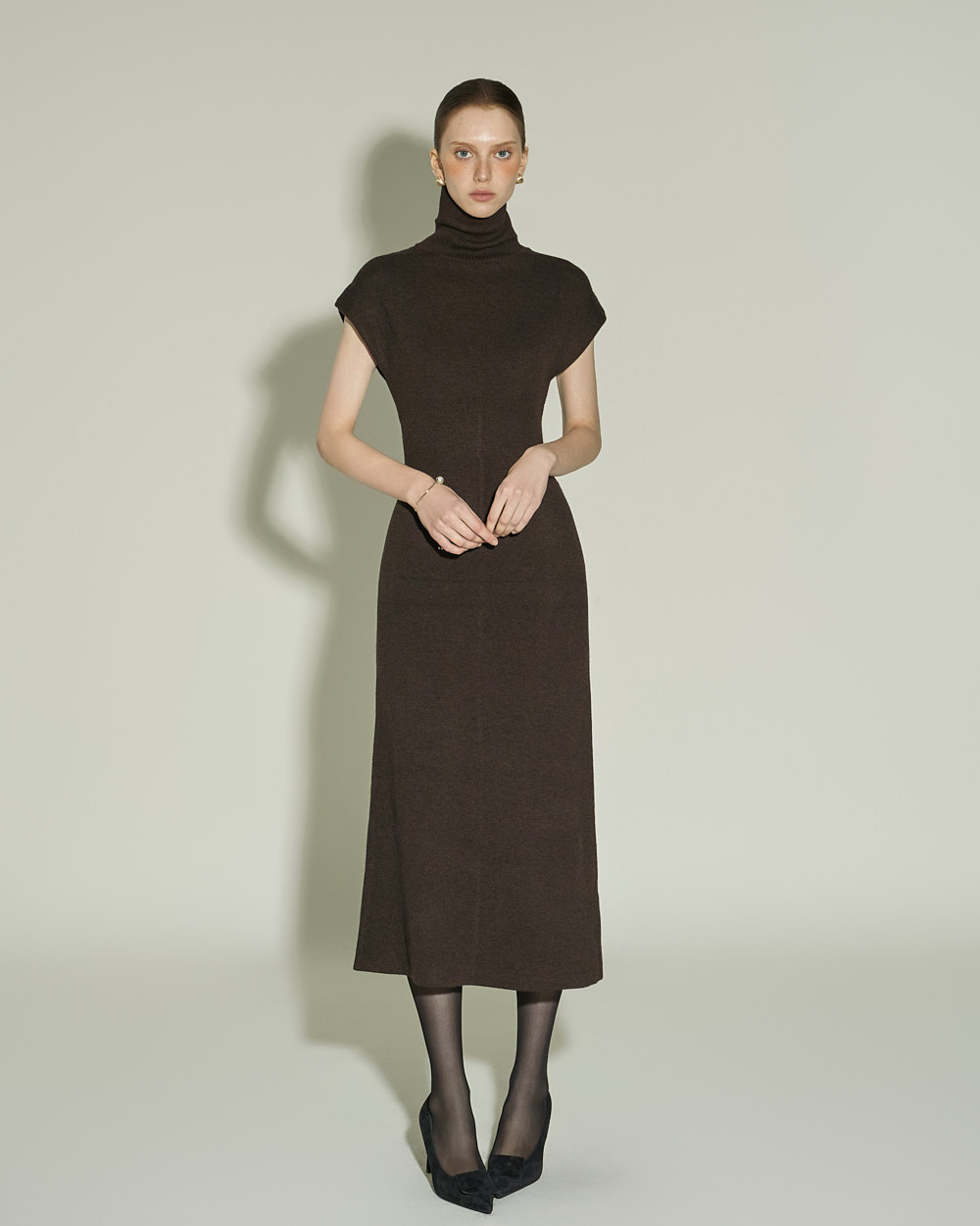 这是一款具有摩登氛围的高领羊毛针织连衣裙。