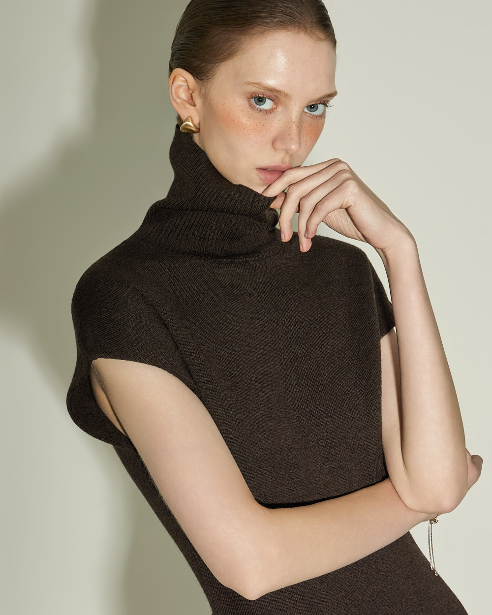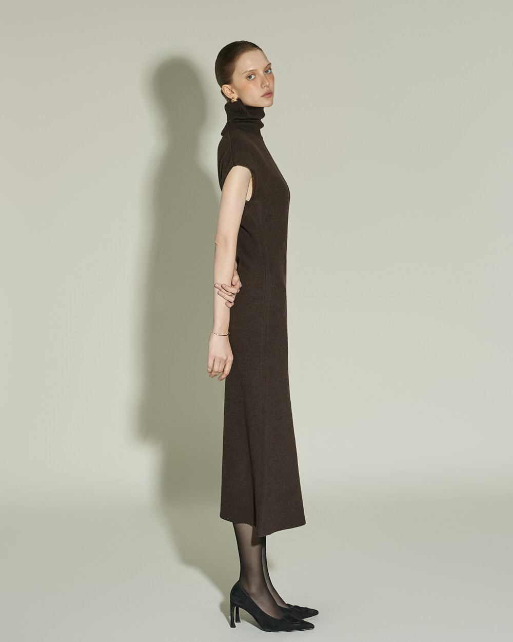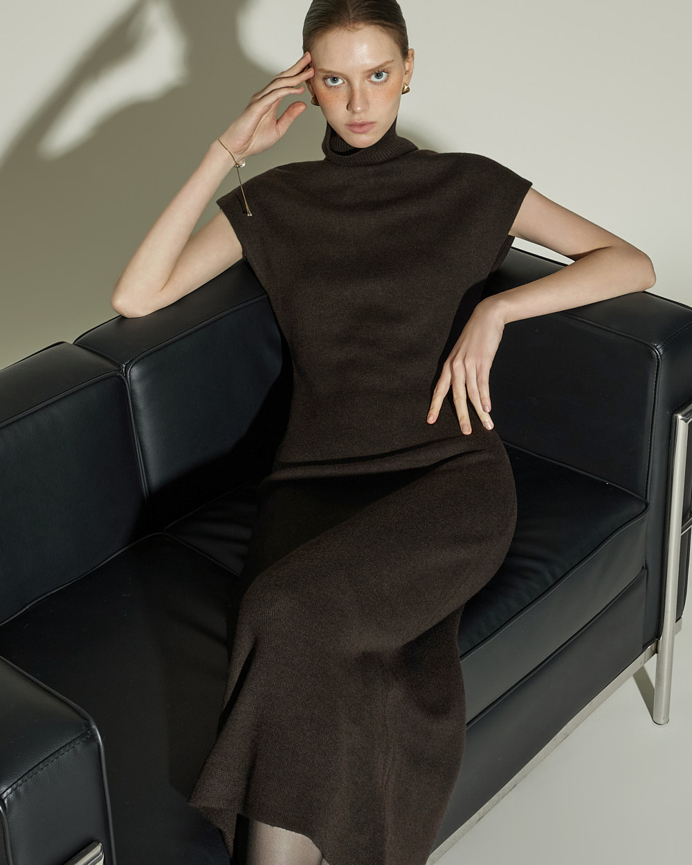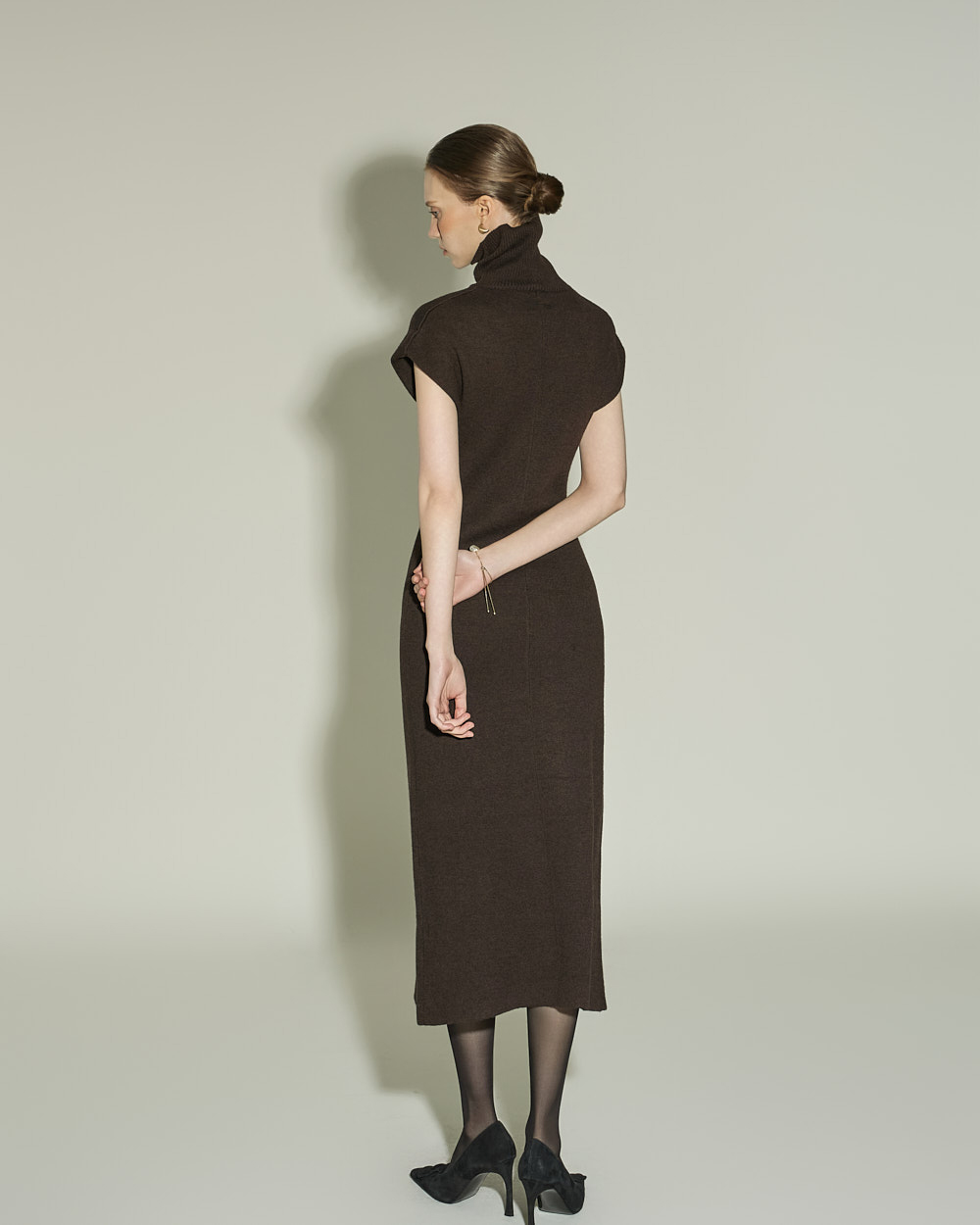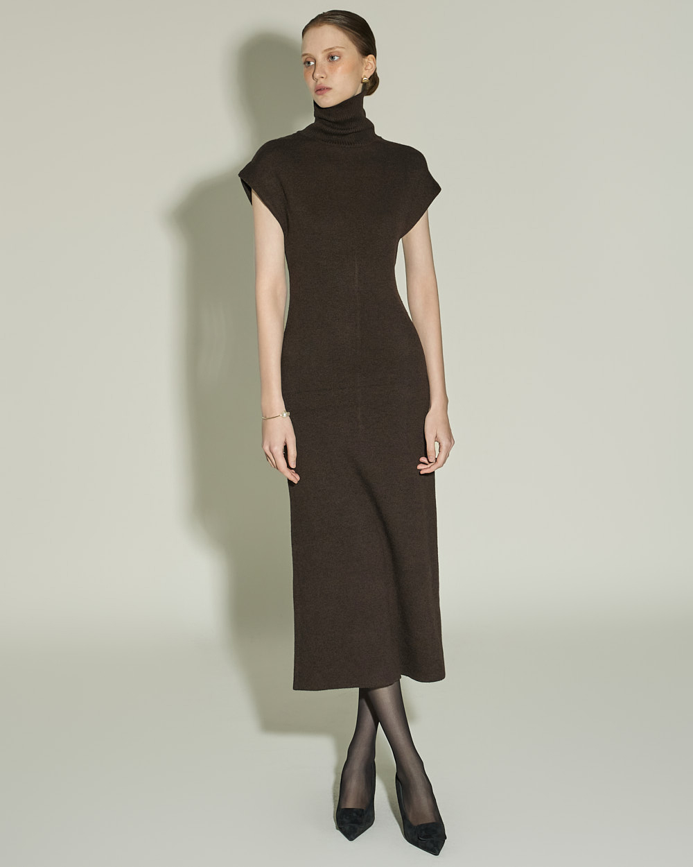 这是一款具有摩登氛围的高领羊毛针织连衣裙。