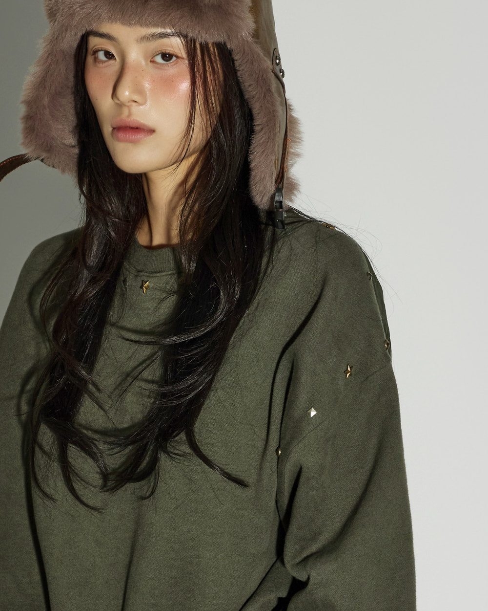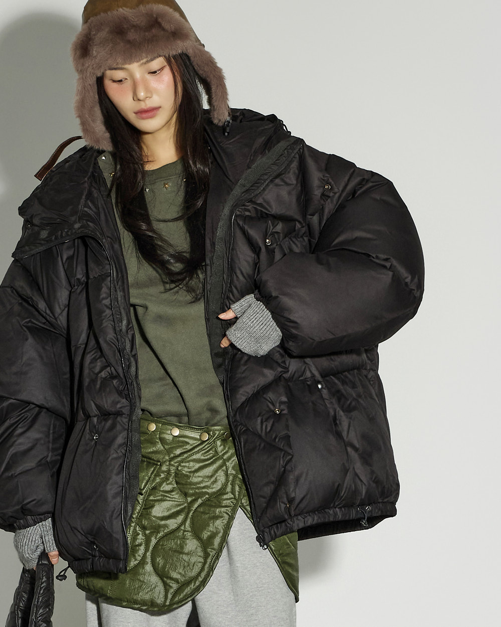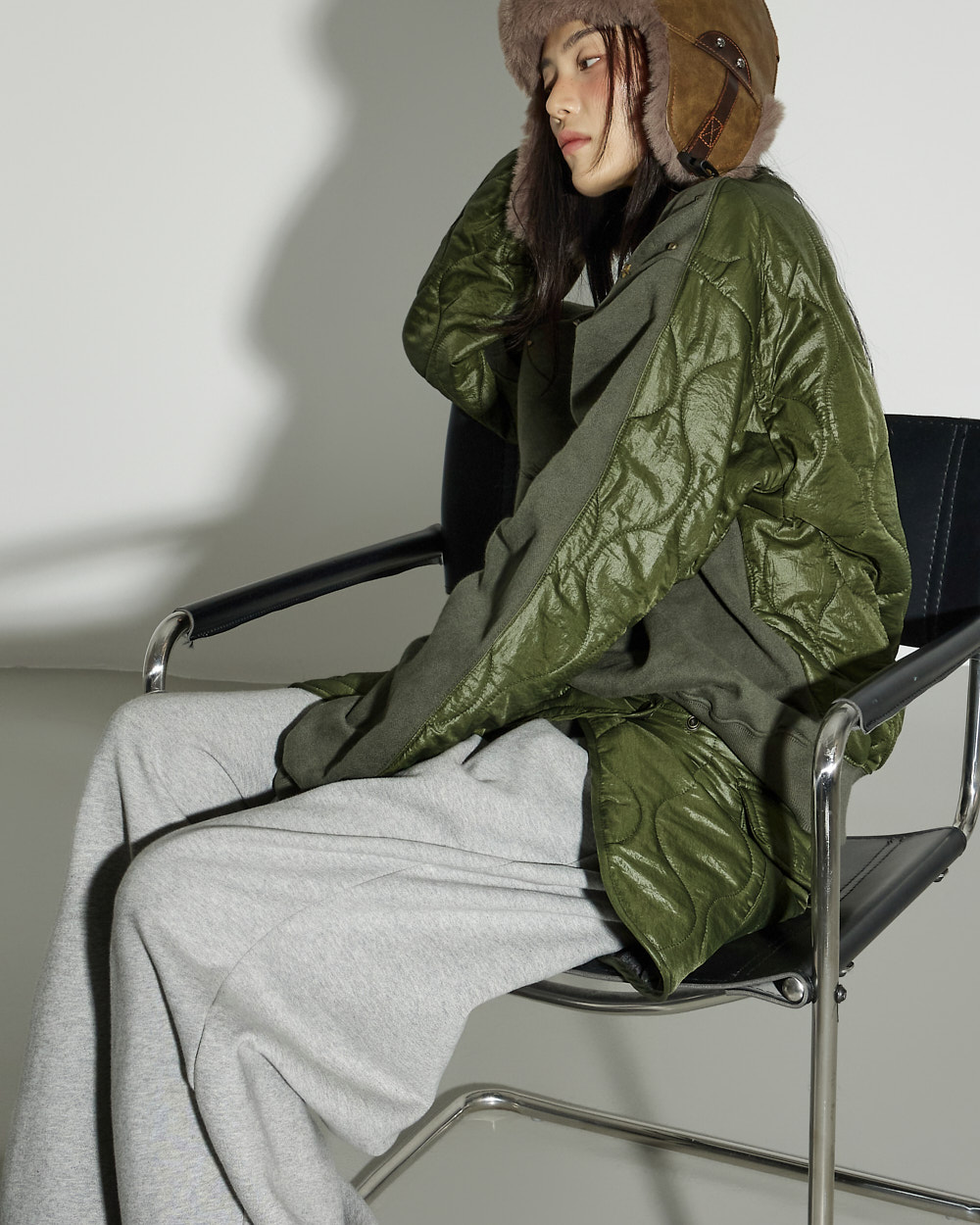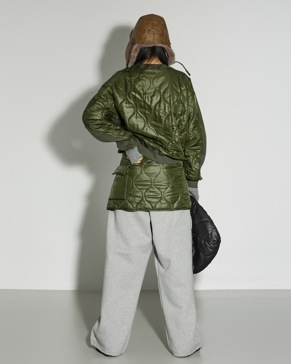 171CM 模特穿着 ONE 码,KHAKI 颜色。