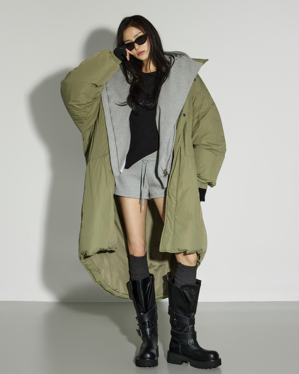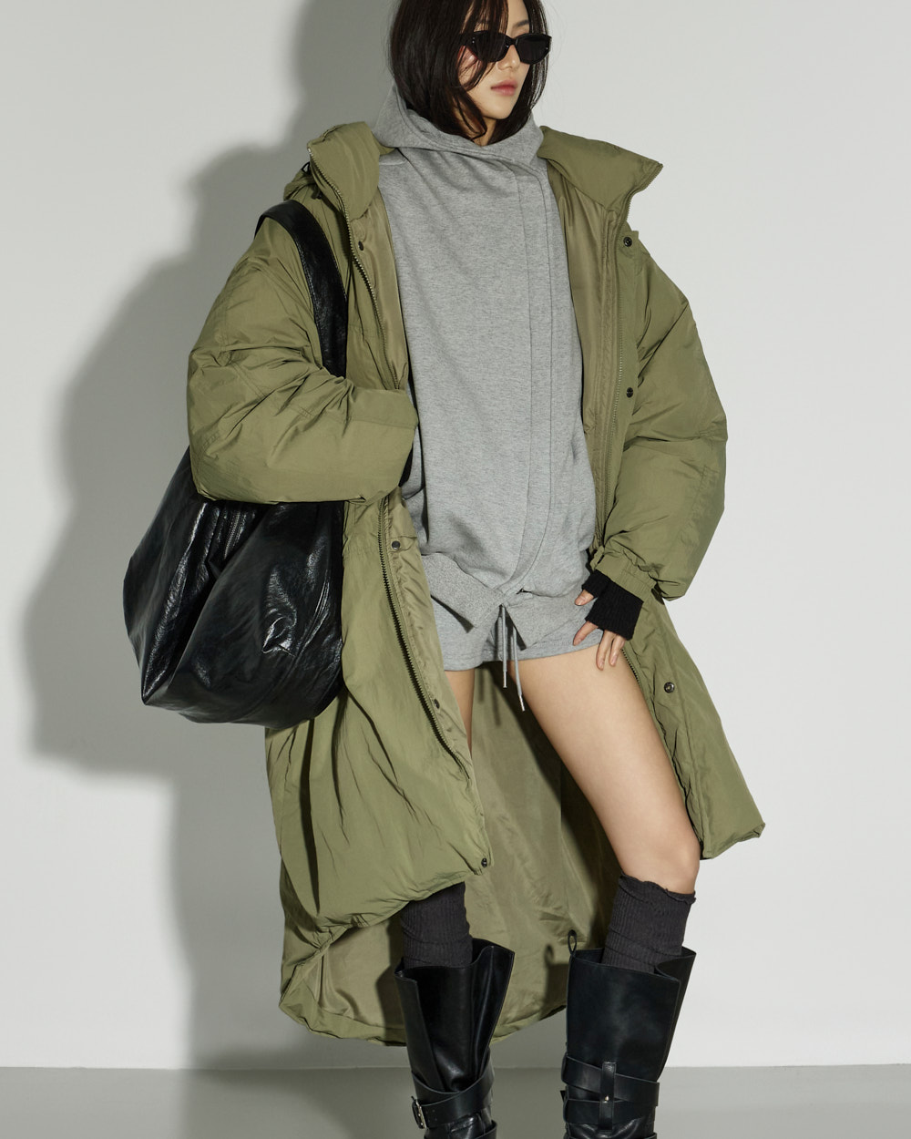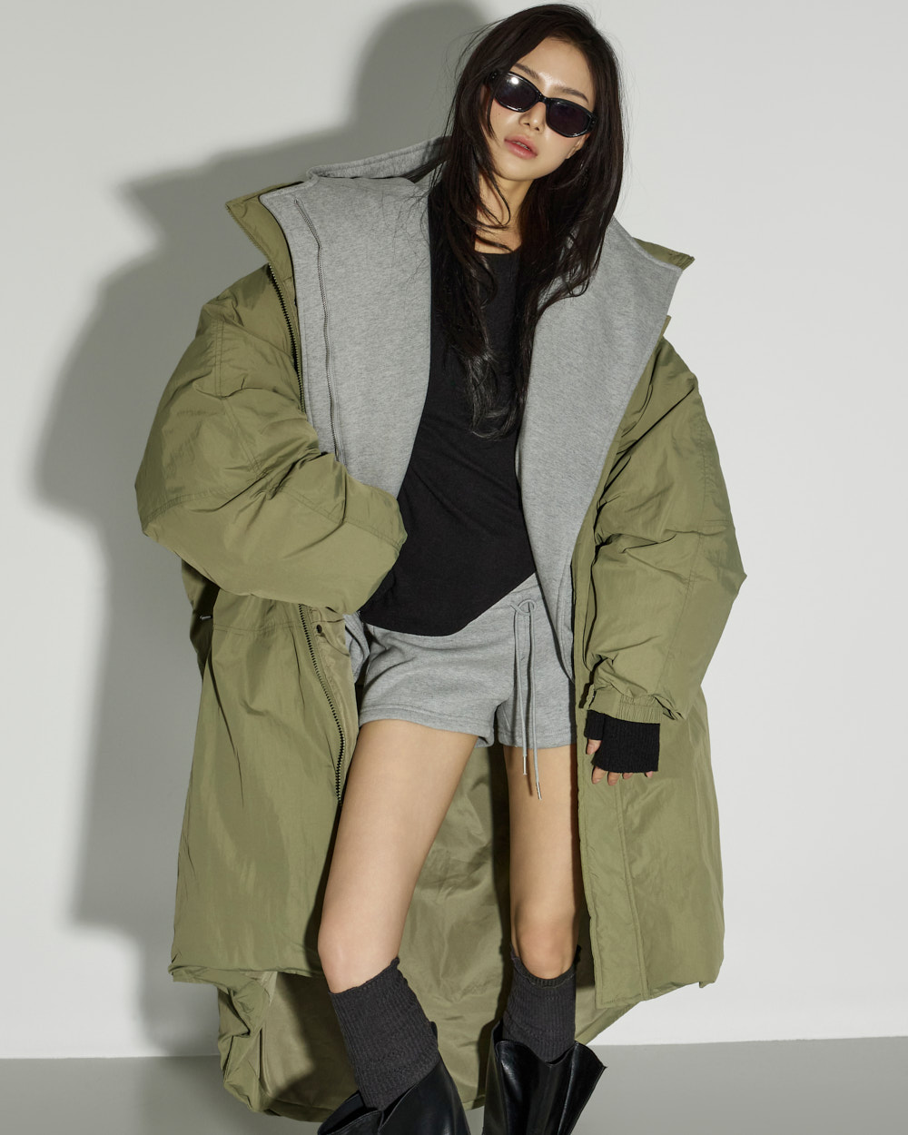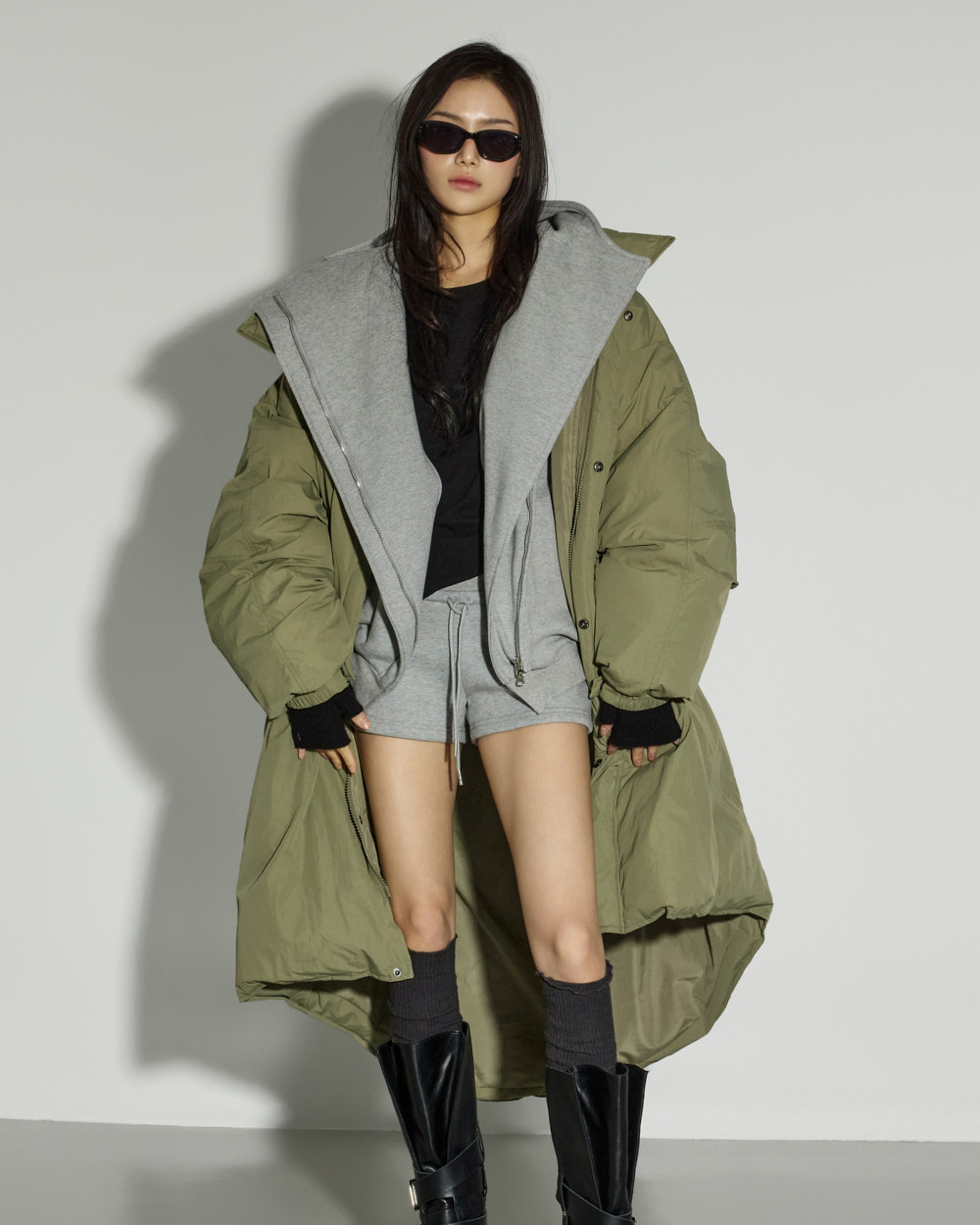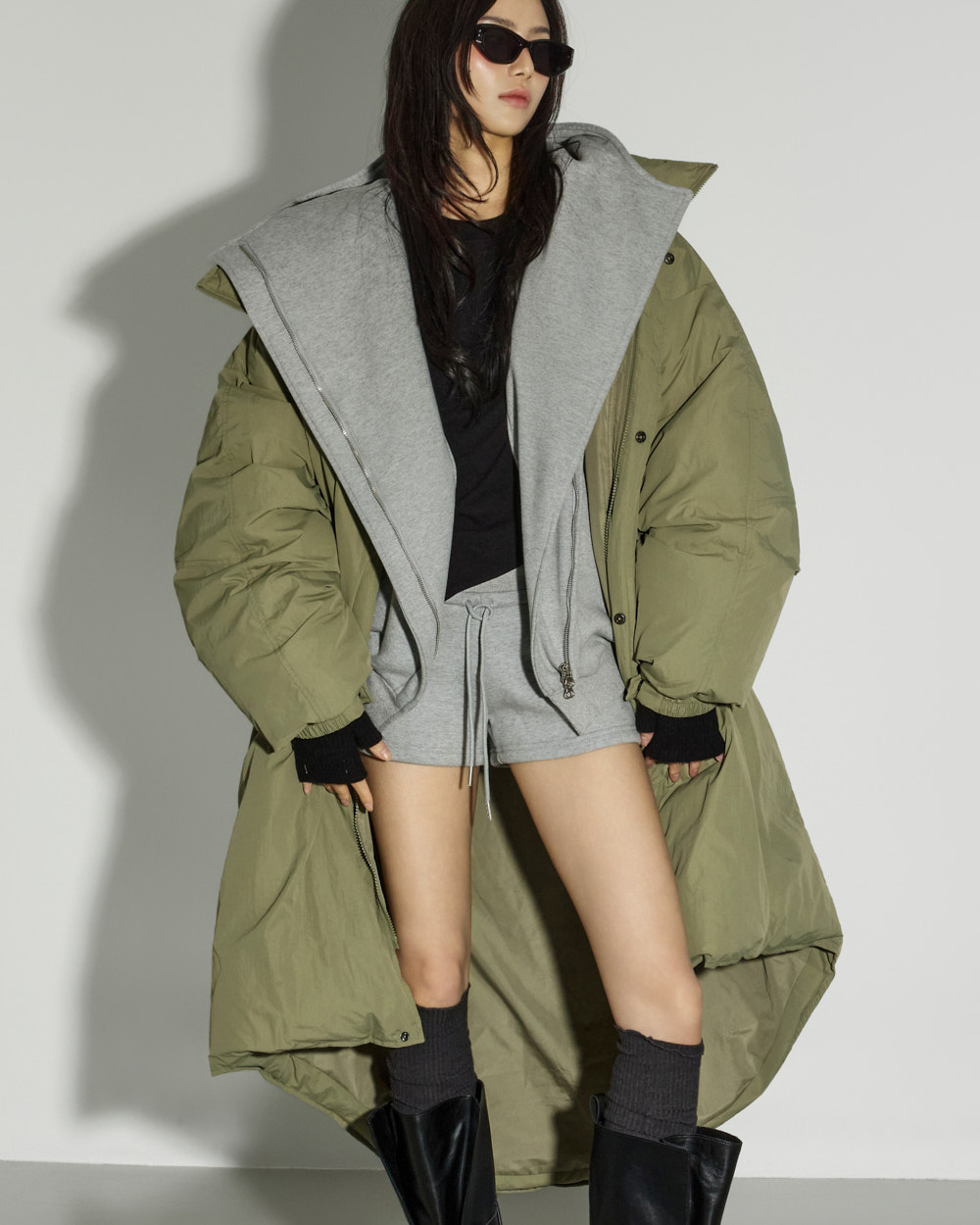这是一款具有休闲氛围的鸭绒长款羽绒外套。