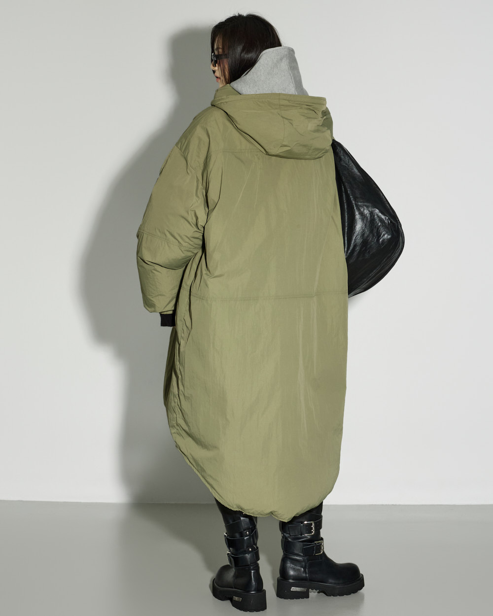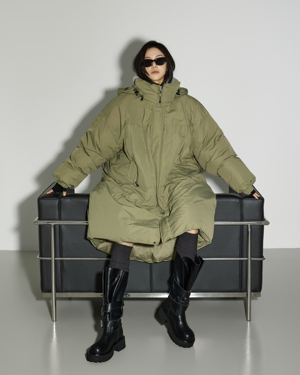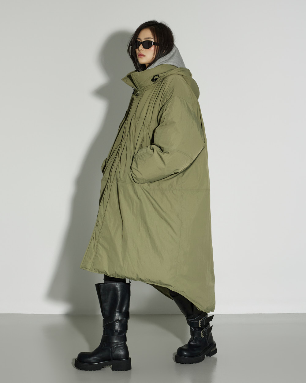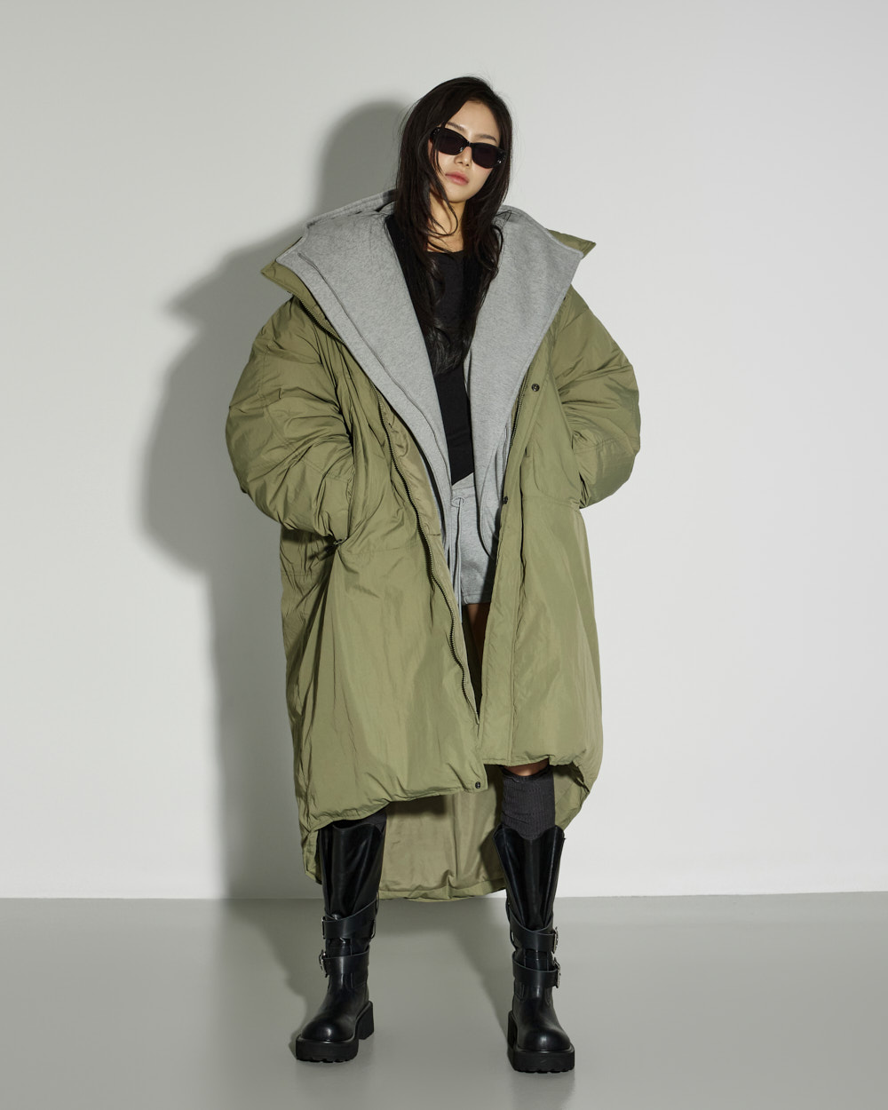 这是一款具有休闲氛围的鸭绒长款羽绒外套。
