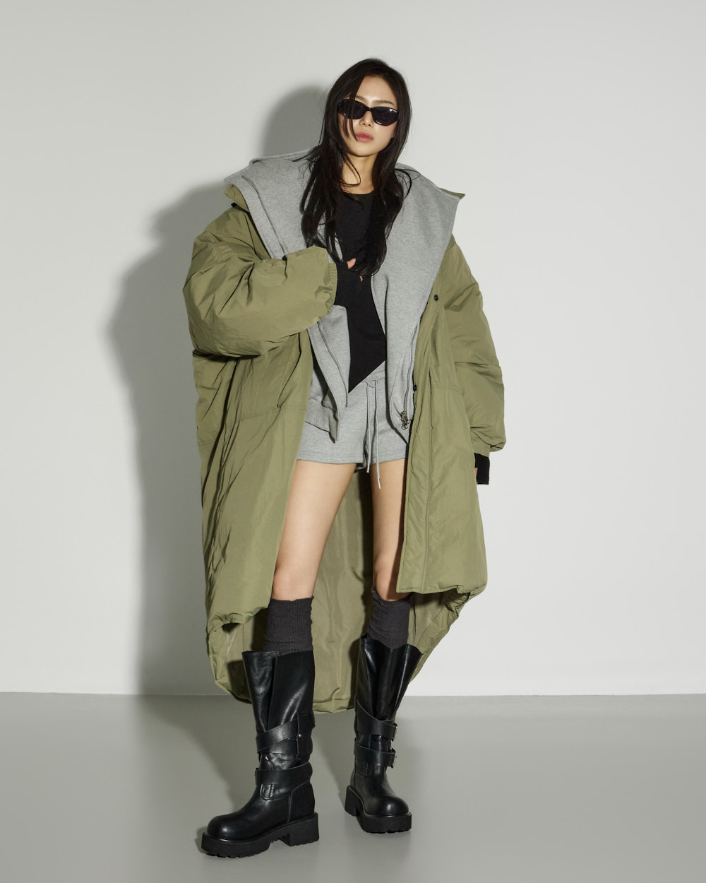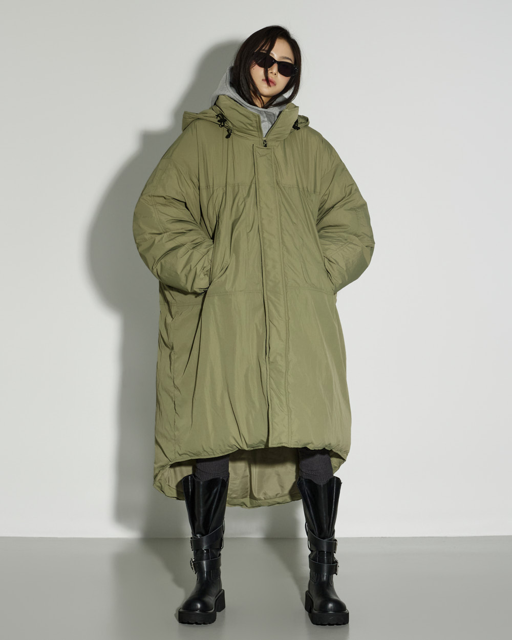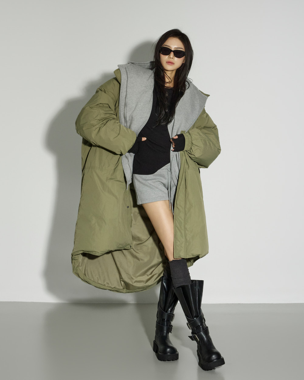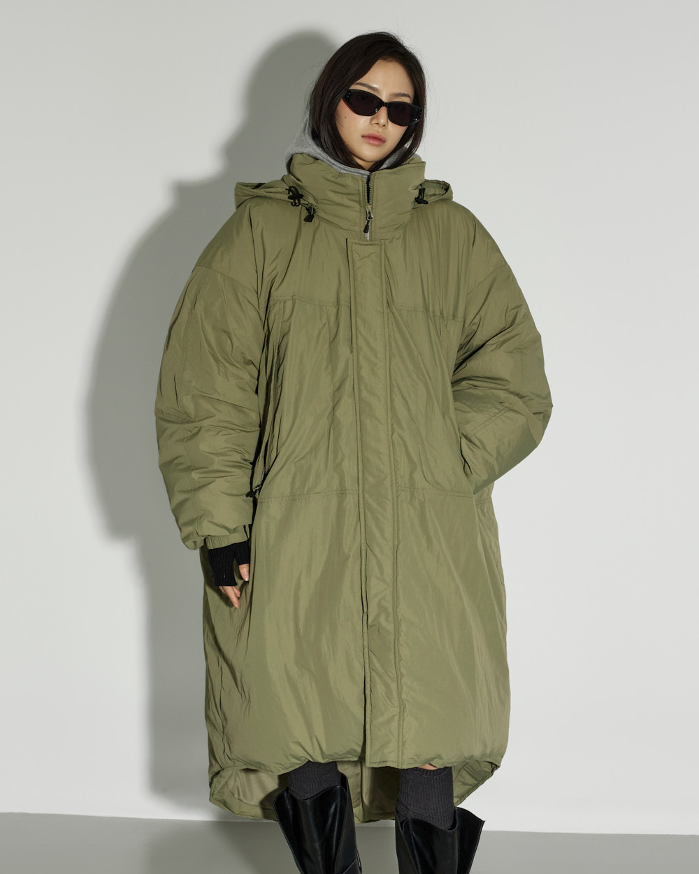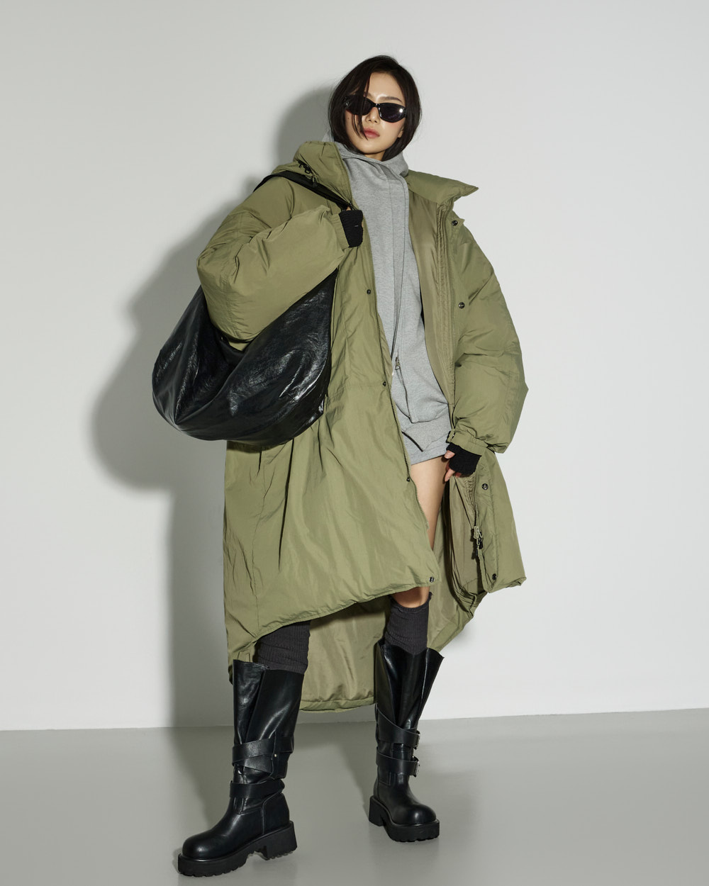 这是一款具有休闲氛围的鸭绒长款羽绒外套。