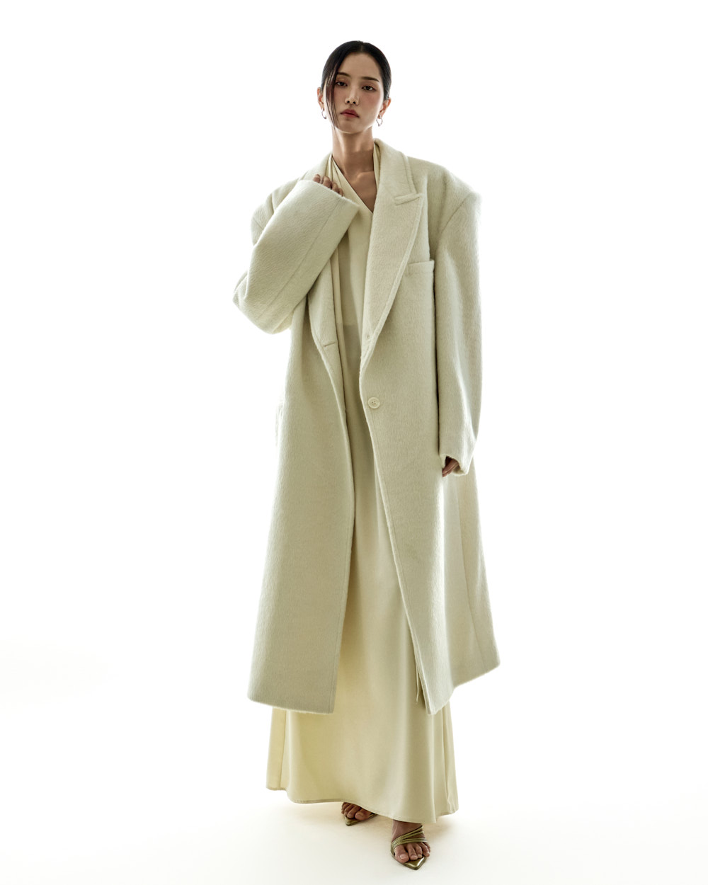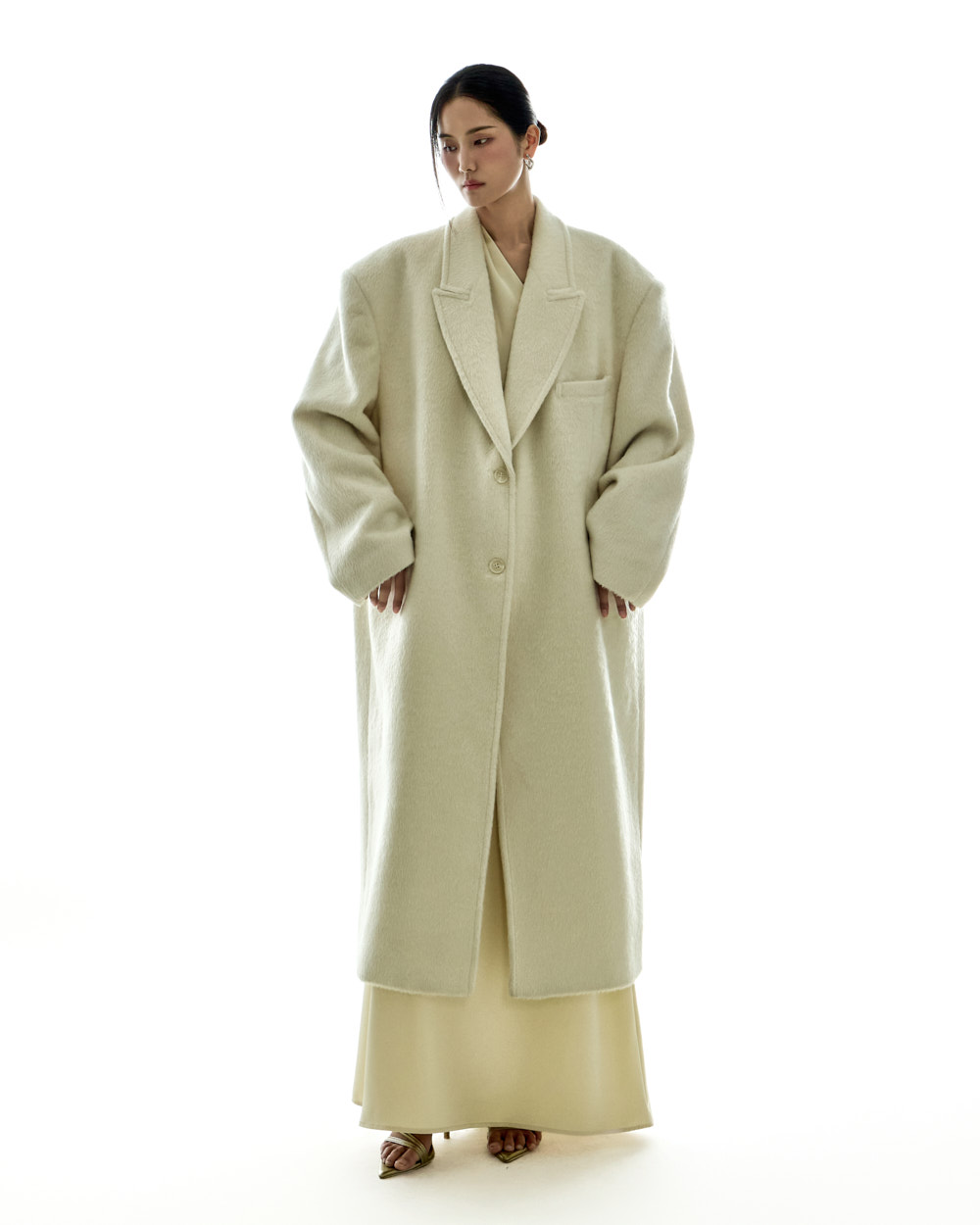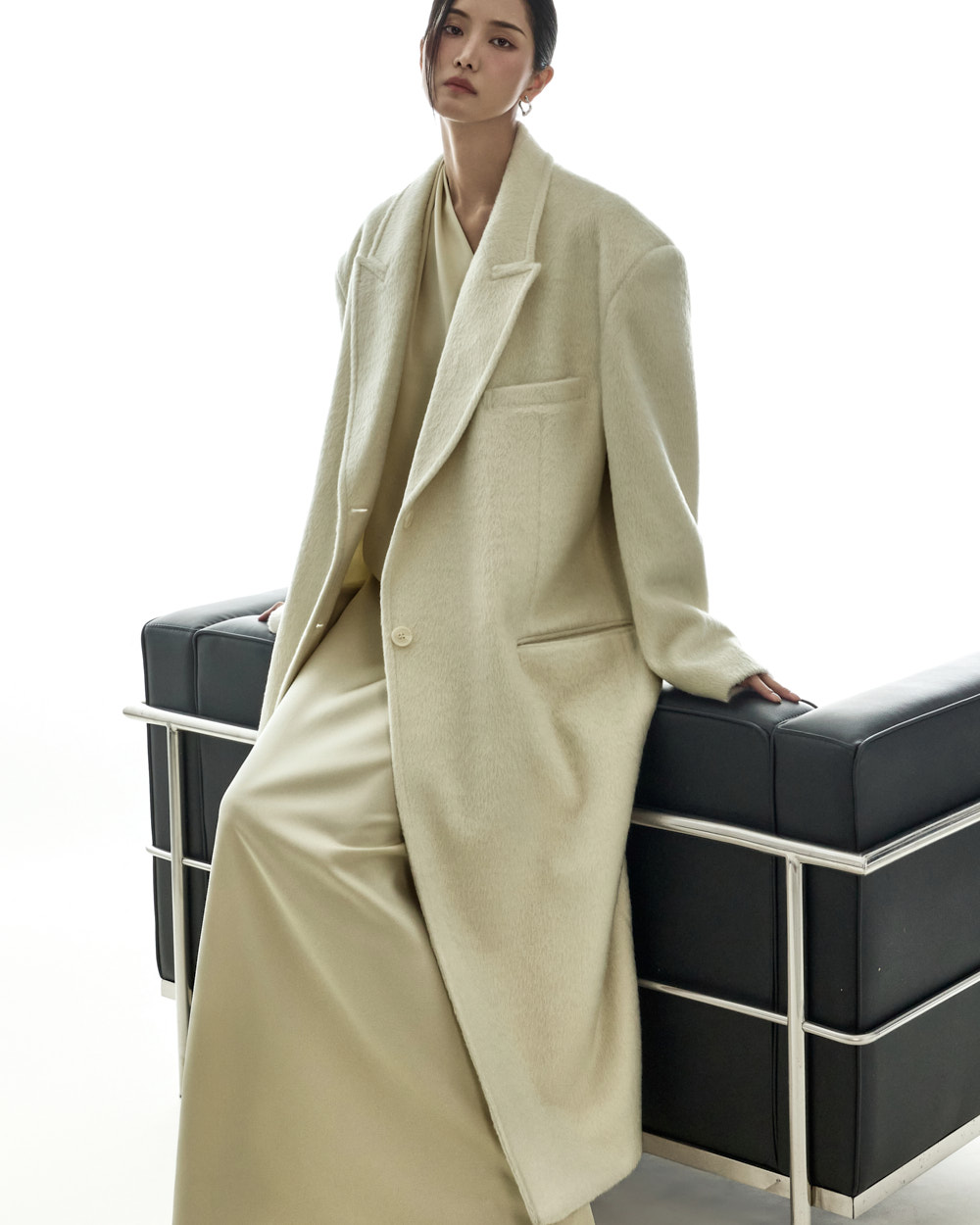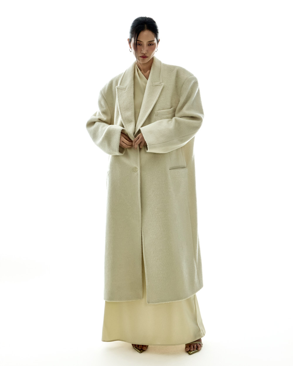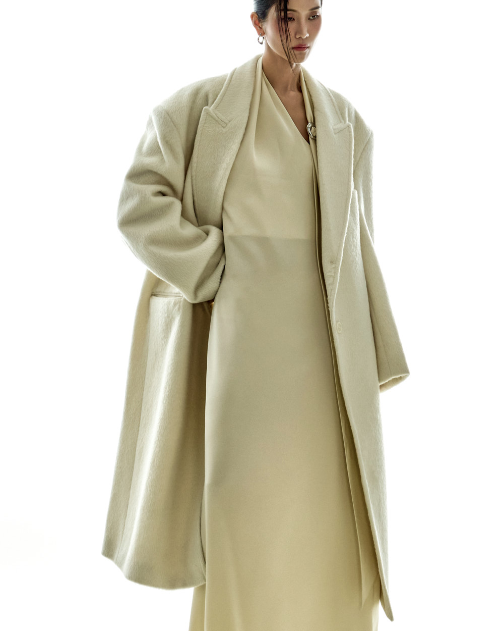 宽松版型与超长衣长自然垂落,