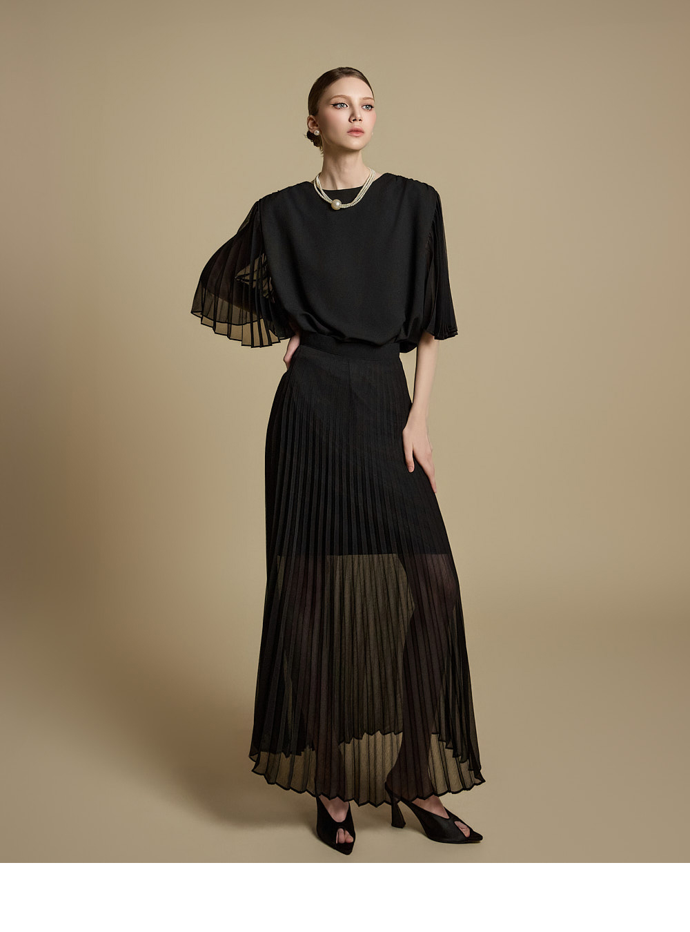 전체 플리츠 원단으로 제작되어 고급스러운 아웃핏을 선사하며,