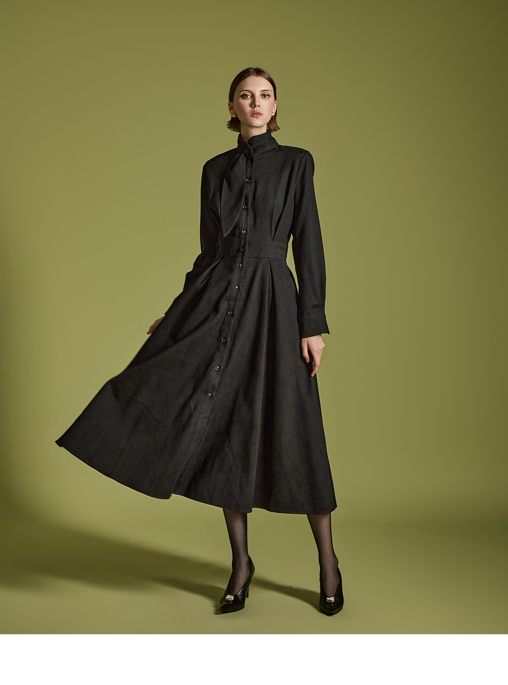 这是一款女性化风格的连衣裙。采用柔软且挺括的聚酯材质制成,ONE 尺码设计,可根据体型穿着。前排纽扣闭合,方便穿脱;两侧口袋提供简单收纳功能,肩部垫设计塑造饱满轮廓。自然散开的伞裙线条呈现女性化轮廓,内衬提升穿着舒适感,腰带细节打造时尚造型。基础色系易于多样搭配,适合秋冬季婚宴或日常穿搭,是具有高收藏价值的单品,推荐给 DINT 客户。174CM 模特穿着 ONE 尺码,颜色为黑色。