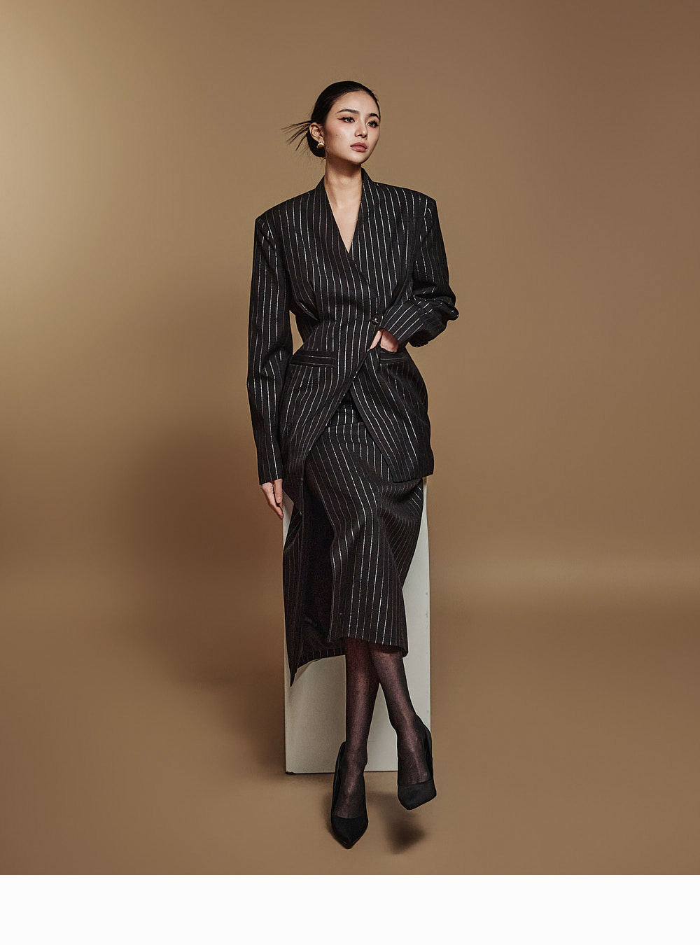 숄더 패드를 드리워 볼륨감 있는 아웃핏을 연출하고