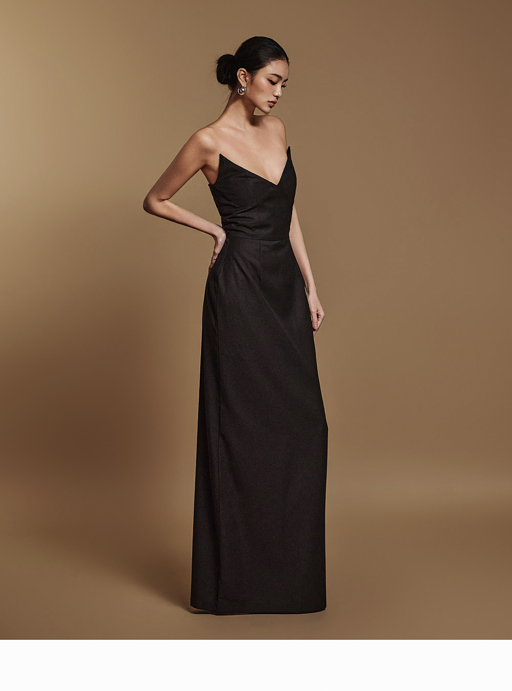 페미닌한 아웃핏과 바스트라인에 브이컷 디테일로