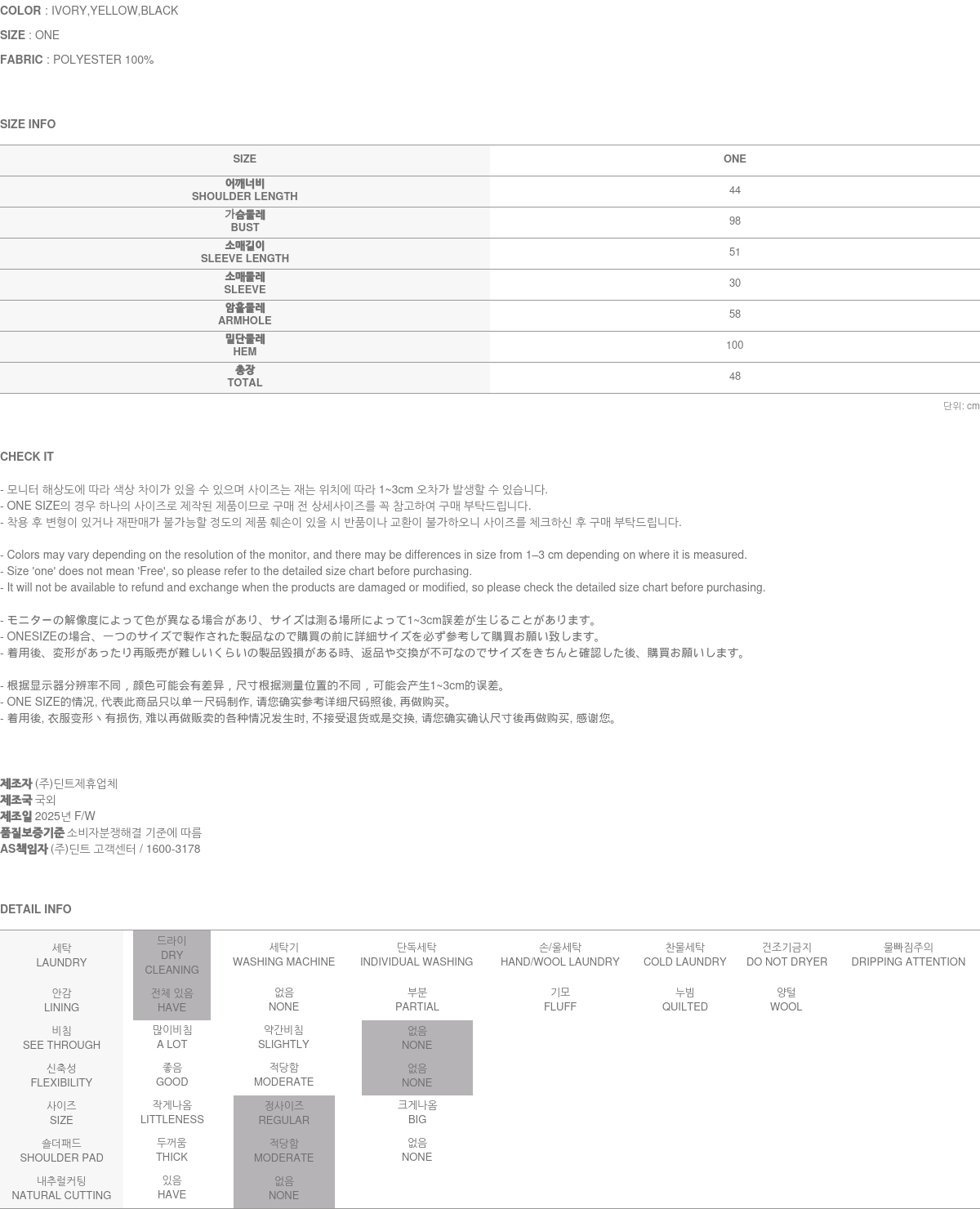 換貨 與 退貨 收到商品後, 7日內能在我的頁面申請交換或退貨, 申請後請將商品寄回DINT. 申請後, 請填寫包裹裡一同寄去的撤回申請書, 再將包裹包裝成一開始您收到時的狀態(包裝袋、衣架、贈品皆要一起寄送回來)發送至DINT即可. 因爲顧客變心所申請的換貨與退貨, 運費將由顧客負擔;誤送或是商品瑕疵的部分, 將由DINT負擔運費. 退貨住所爲:首爾市 衿川區 加山洞 459-8號 大韓通運 7樓 DINT股份有限公司 品質保證標準說明:符合電子商務等有關消費者保護法律規定的消費者可申請交換或是退貨.