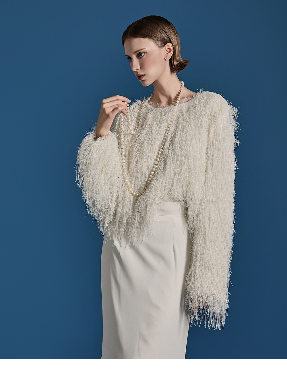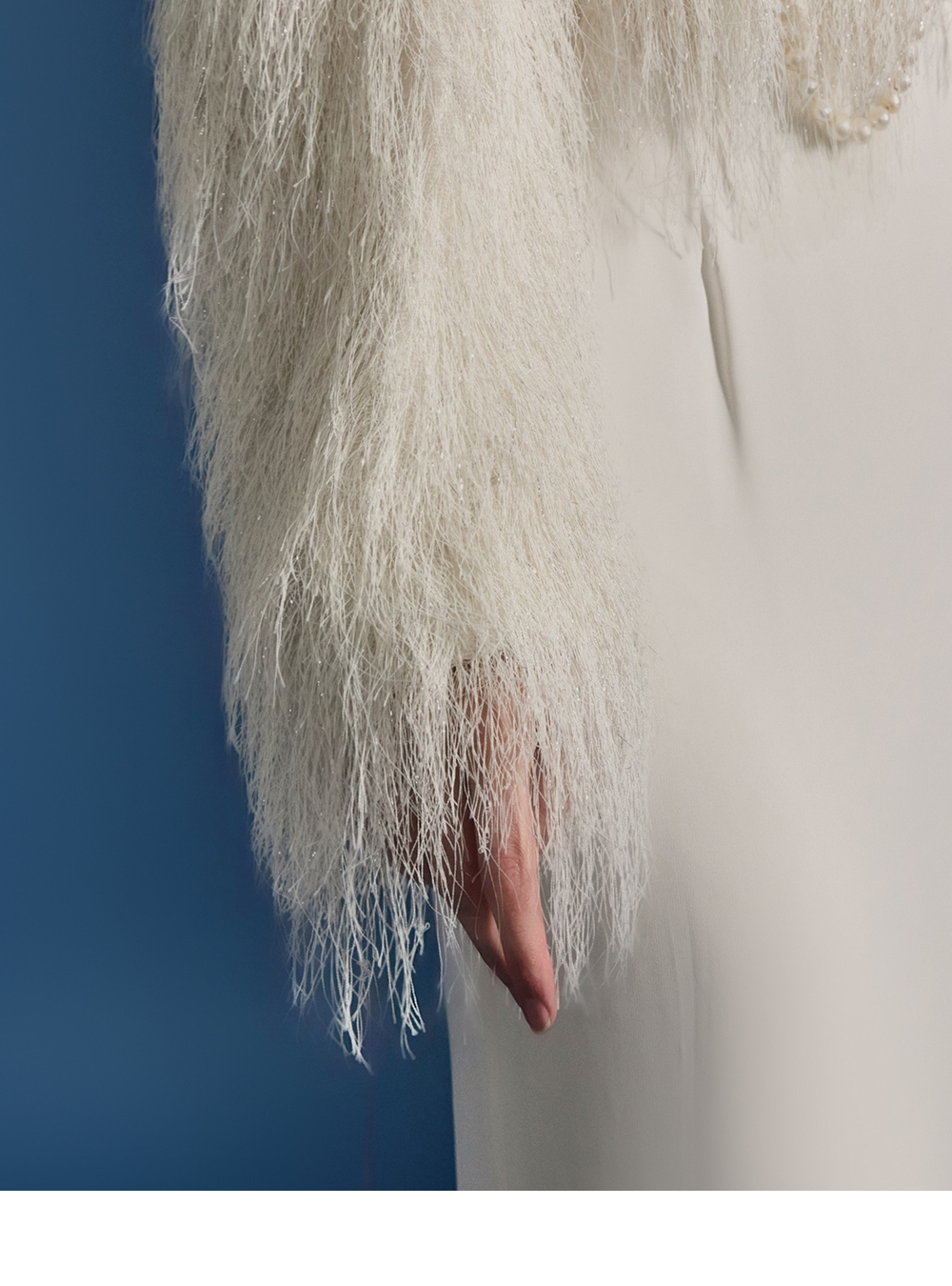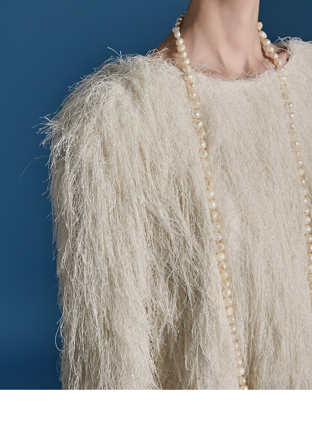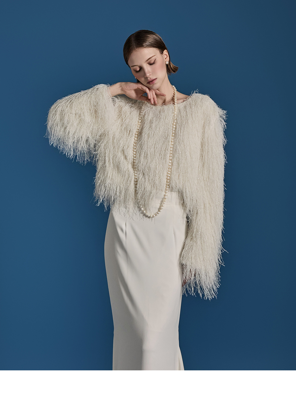 这是一款独特剪裁的肩垫上衣。 采用柔软且结实的聚酯纤维材质制作,ONE尺码设计,可根据体型舒适穿着。 无额外开合设计,圆领设计呈现柔和脸部轮廓,肩部加入薄肩垫,保持立体外观。 整体珠光流苏设计,独特亮眼,是点缀造型的理想单品,推荐给DINT顾客。 模特身高174CM,穿着ONE尺码,颜色为象牙色。