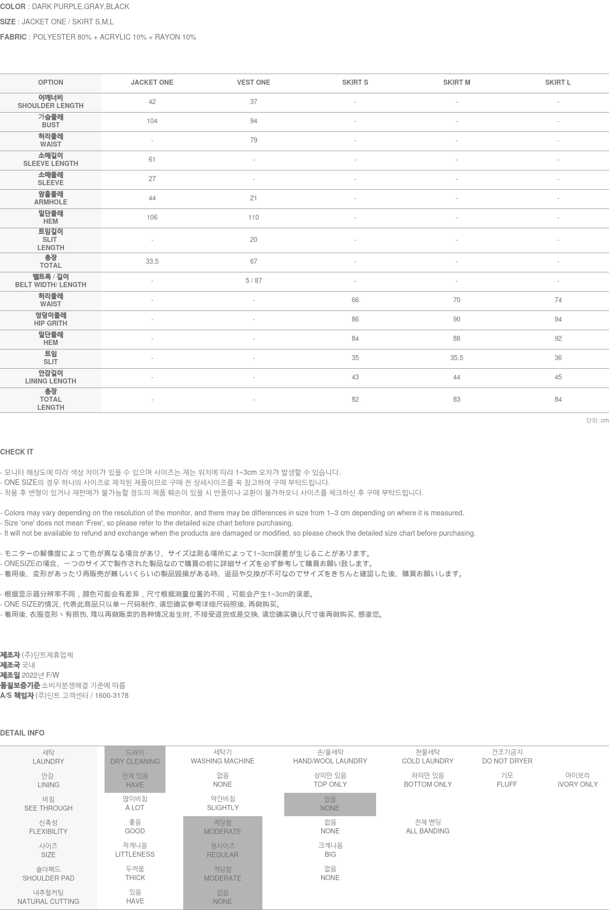 스커트는 백지퍼 여밈으로 탈착용에 용이하고