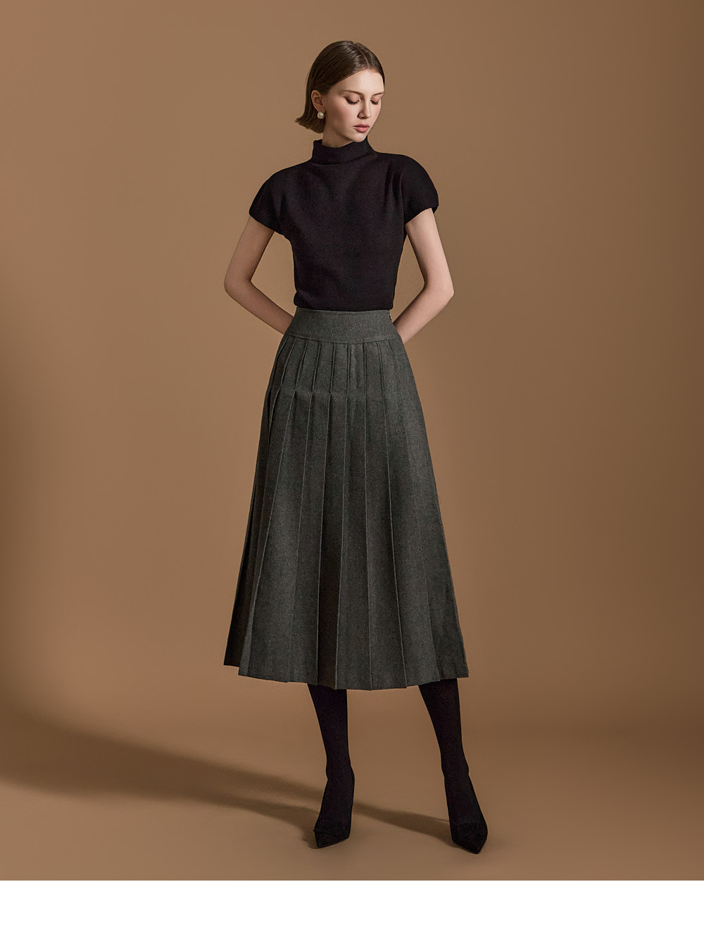 밑단 플리츠 디테일을 드리워 클래식한 무드를 더하였습니다.