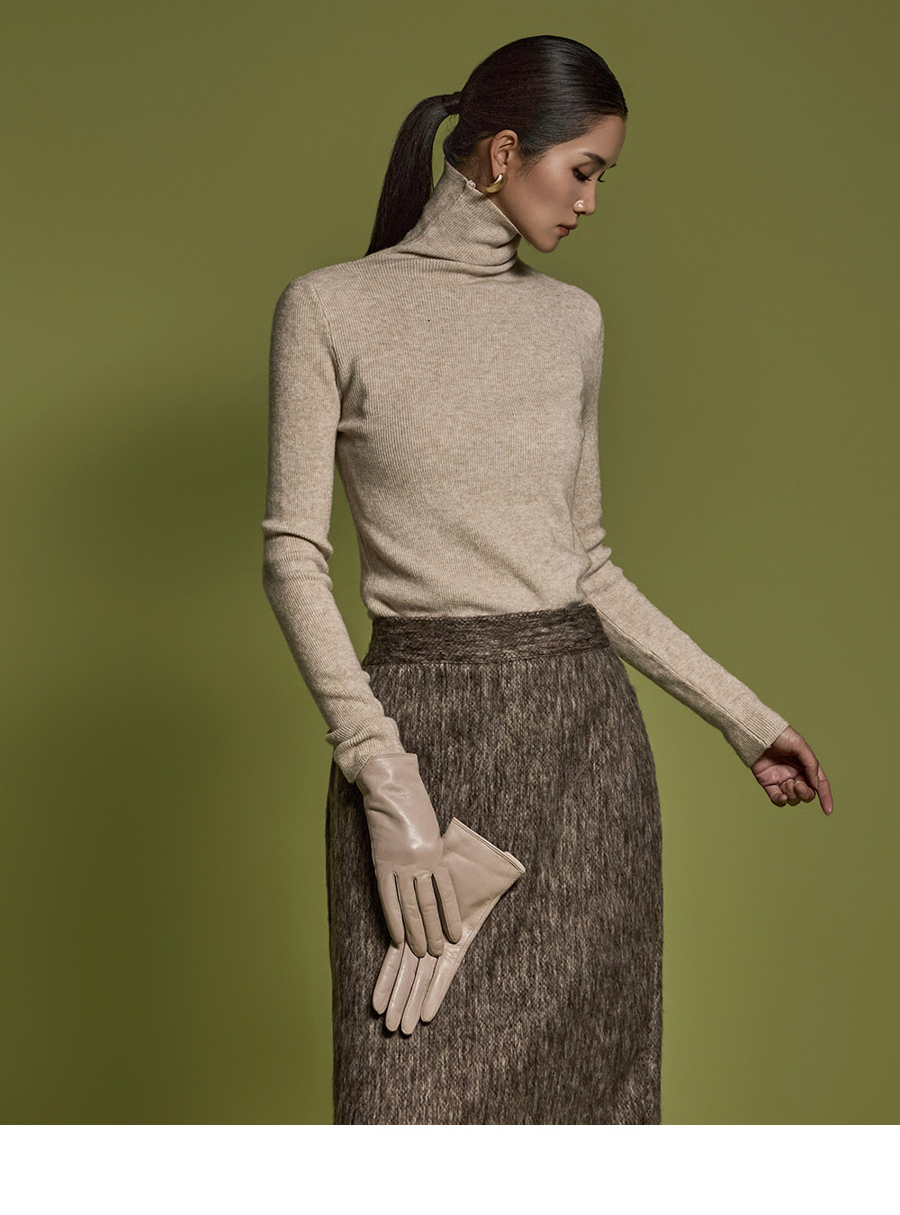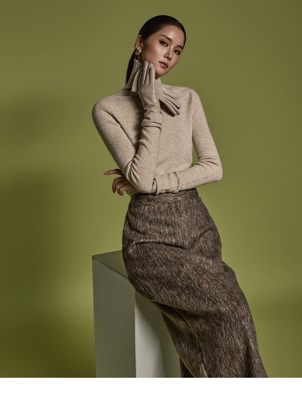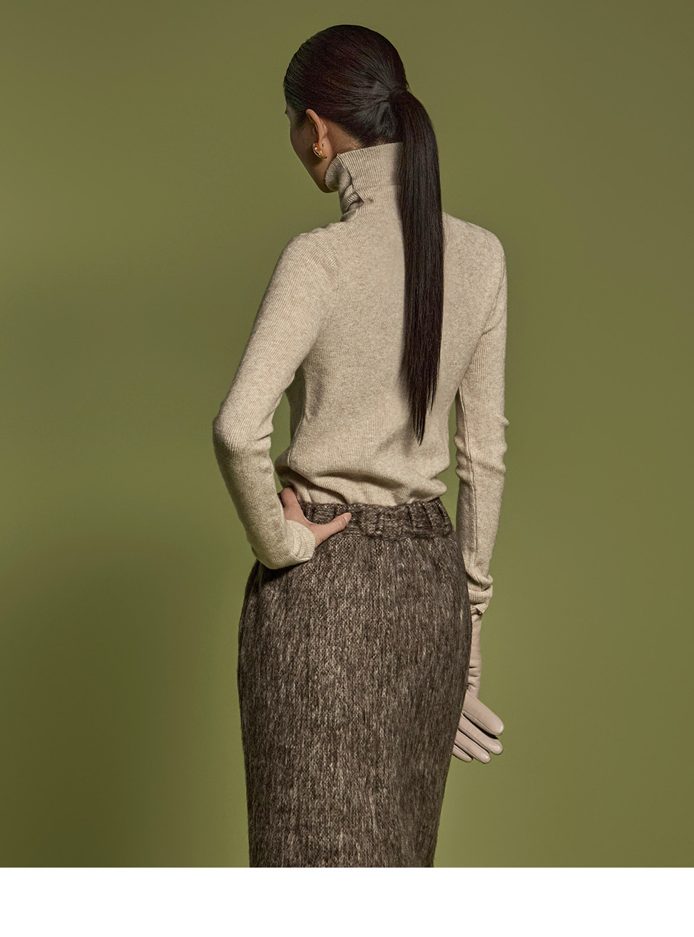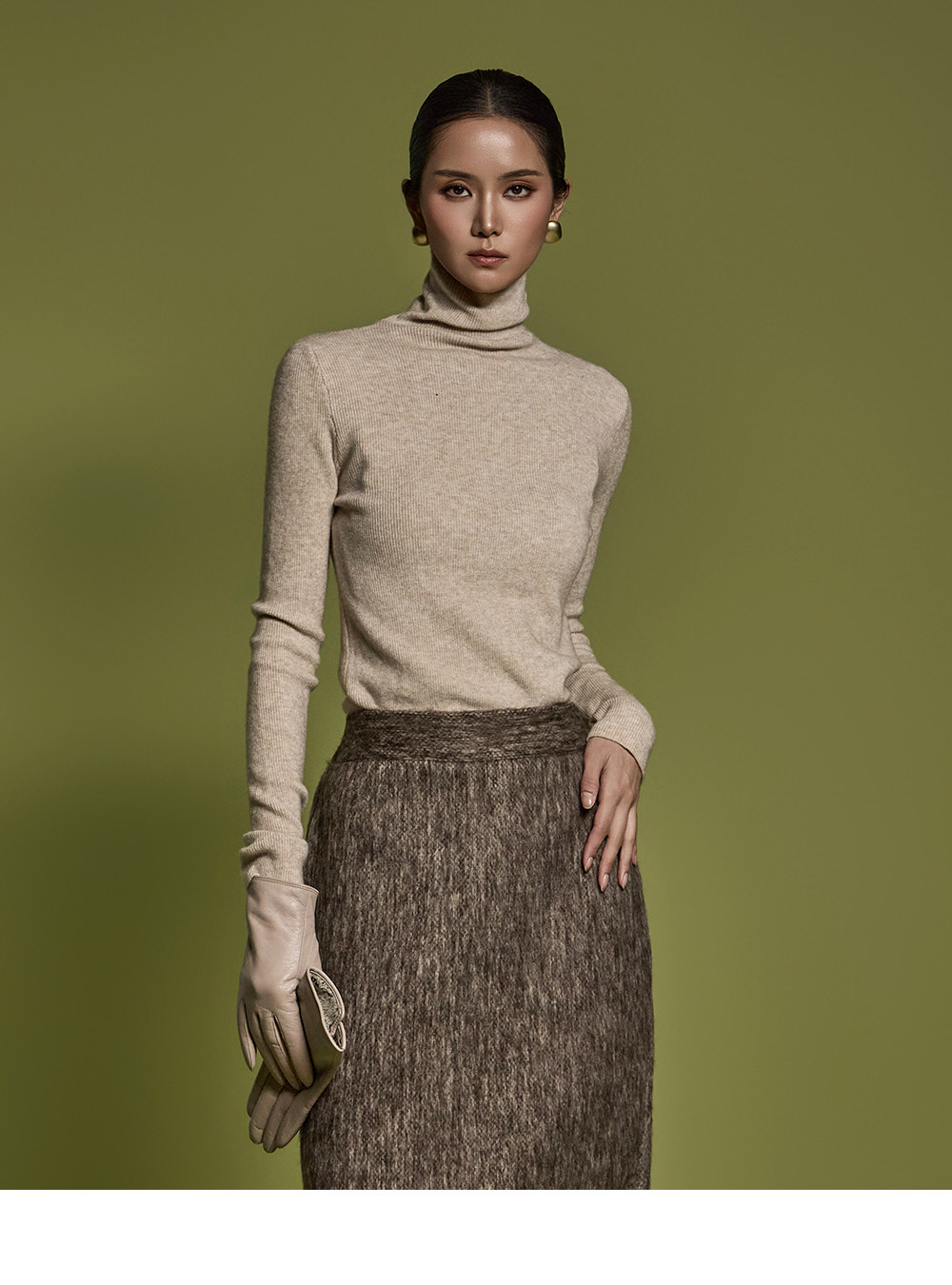 这是一款日常风格的上衣。 采用柔软的聚酯纤维、尼龙及粘胶混纺材质制作,ONE尺码设计,可根据体型舒适穿着。 无额外开合设计,弹性良好,穿着舒适,高领设计提升保暖性。 多种色彩选择,修身版型营造纤细外观,可作为外套内搭单品使用。 基础设计与适中长度,便于日常穿搭,推荐给DINT顾客。 模特身高173CM,穿着ONE尺码,颜色为米色。