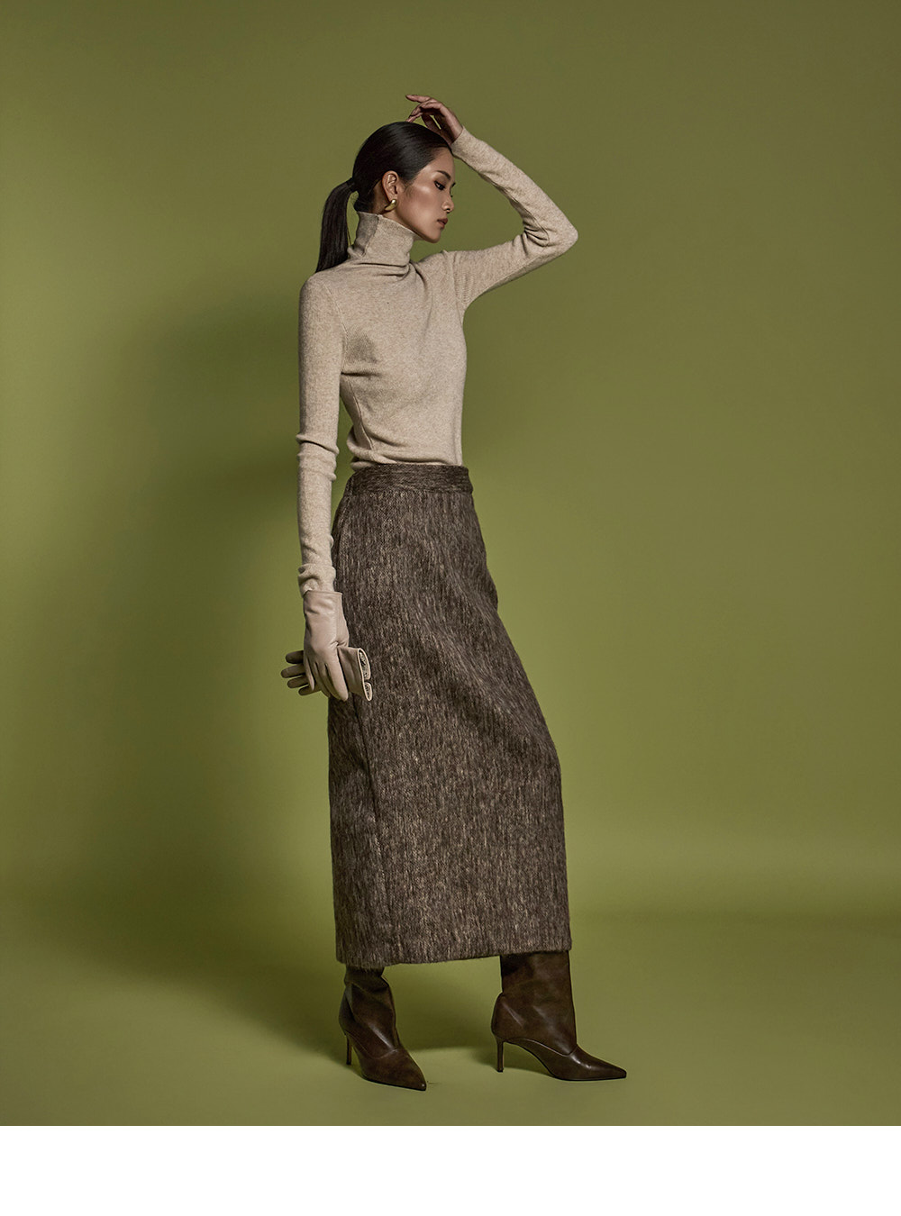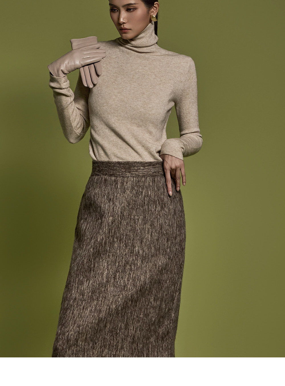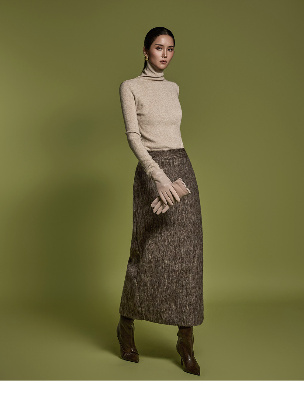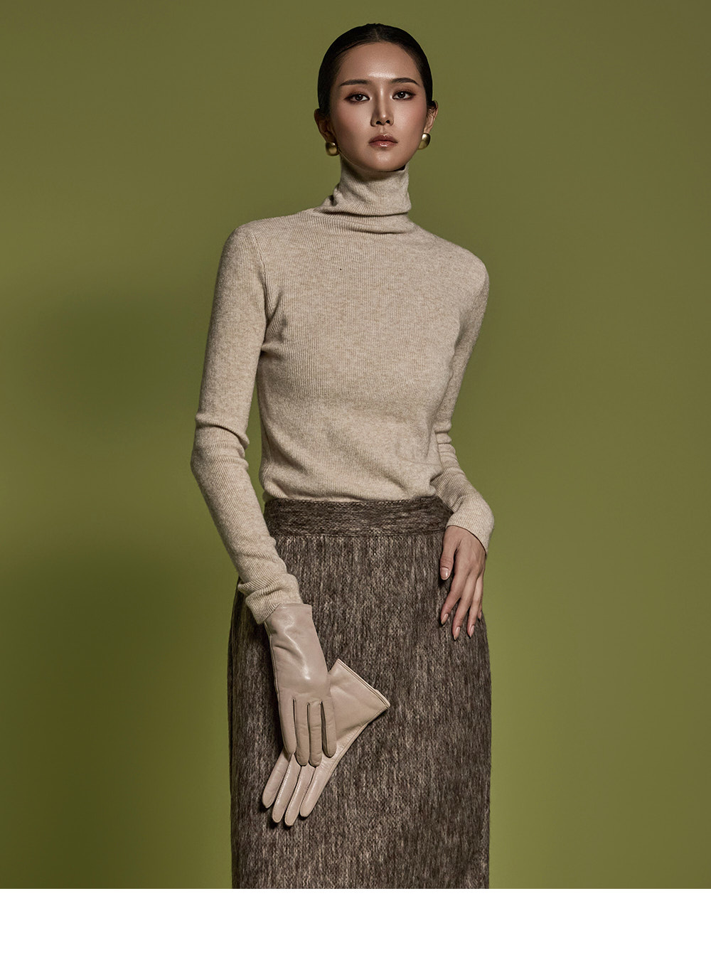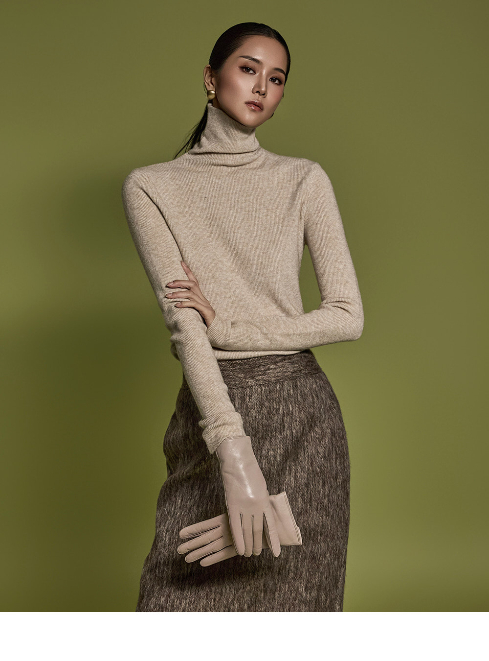 这是一款日常风格的上衣。 采用柔软的聚酯纤维、尼龙及粘胶混纺材质制作,ONE尺码设计,可根据体型舒适穿着。 无额外开合设计,弹性良好,穿着舒适,高领设计提升保暖性。 多种色彩选择,修身版型营造纤细外观,可作为外套内搭单品使用。 基础设计与适中长度,便于日常穿搭,推荐给DINT顾客。 模特身高173CM,穿着ONE尺码,颜色为米色。