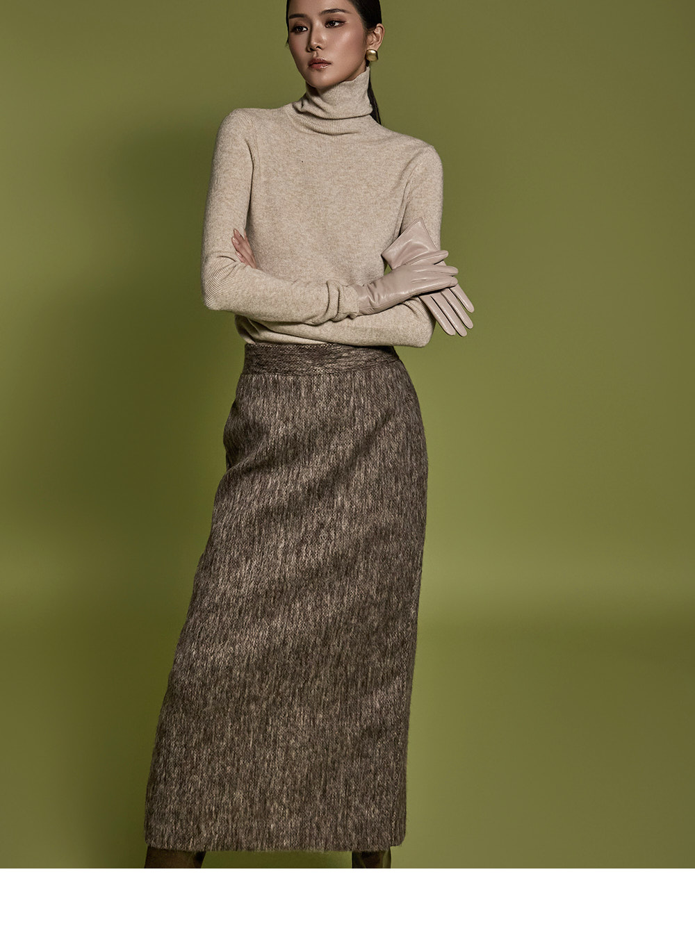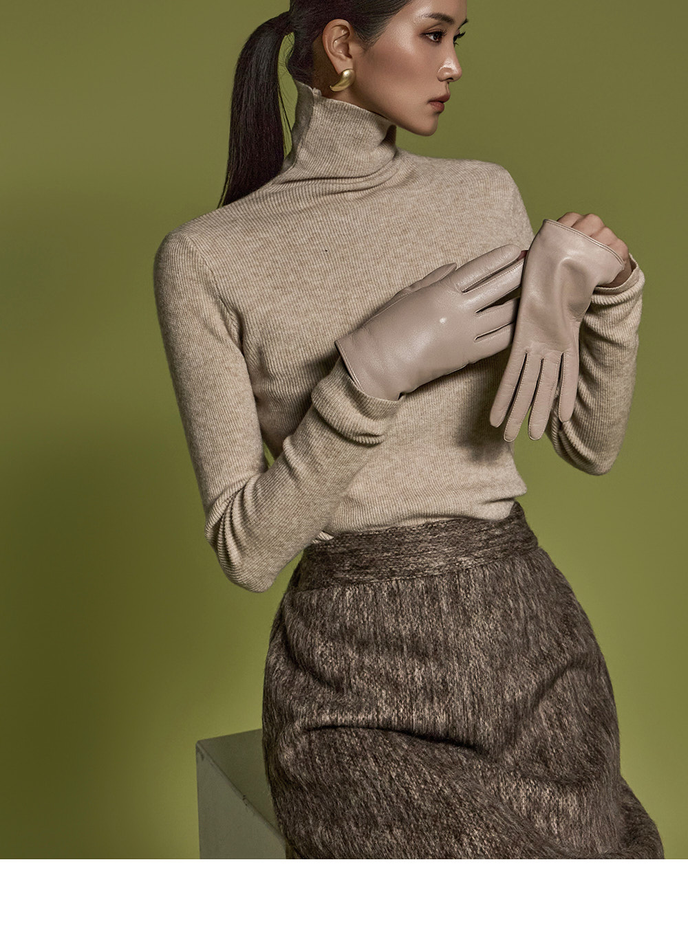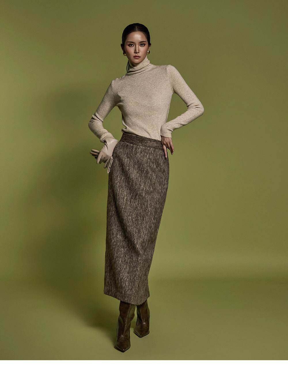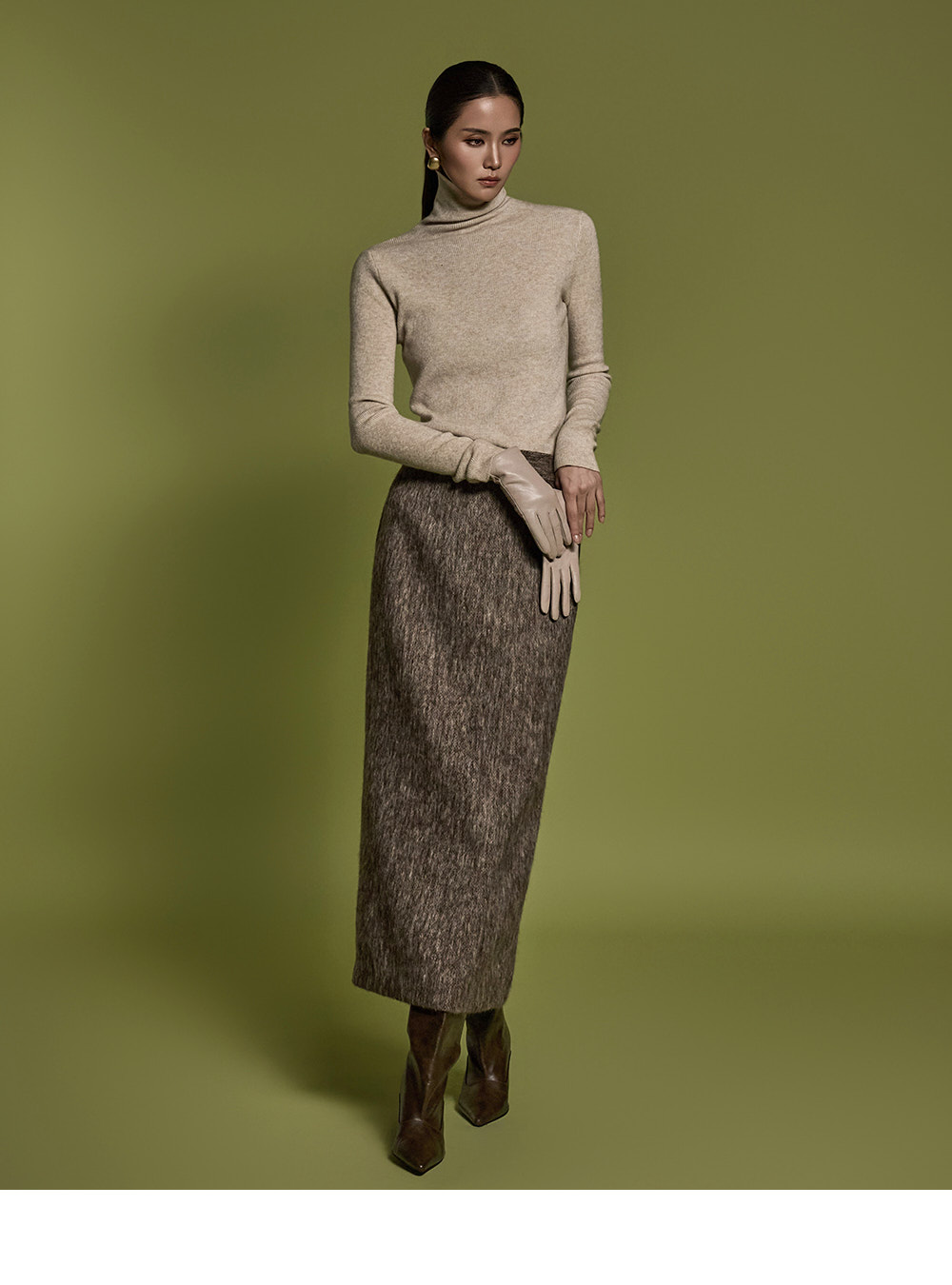 这是一款日常风格的上衣。 采用柔软的聚酯纤维、尼龙及粘胶混纺材质制作,ONE尺码设计,可根据体型舒适穿着。 无额外开合设计,弹性良好,穿着舒适,高领设计提升保暖性。 多种色彩选择,修身版型营造纤细外观,可作为外套内搭单品使用。 基础设计与适中长度,便于日常穿搭,推荐给DINT顾客。 模特身高173CM,穿着ONE尺码,颜色为米色。