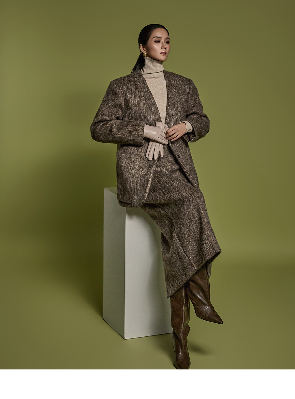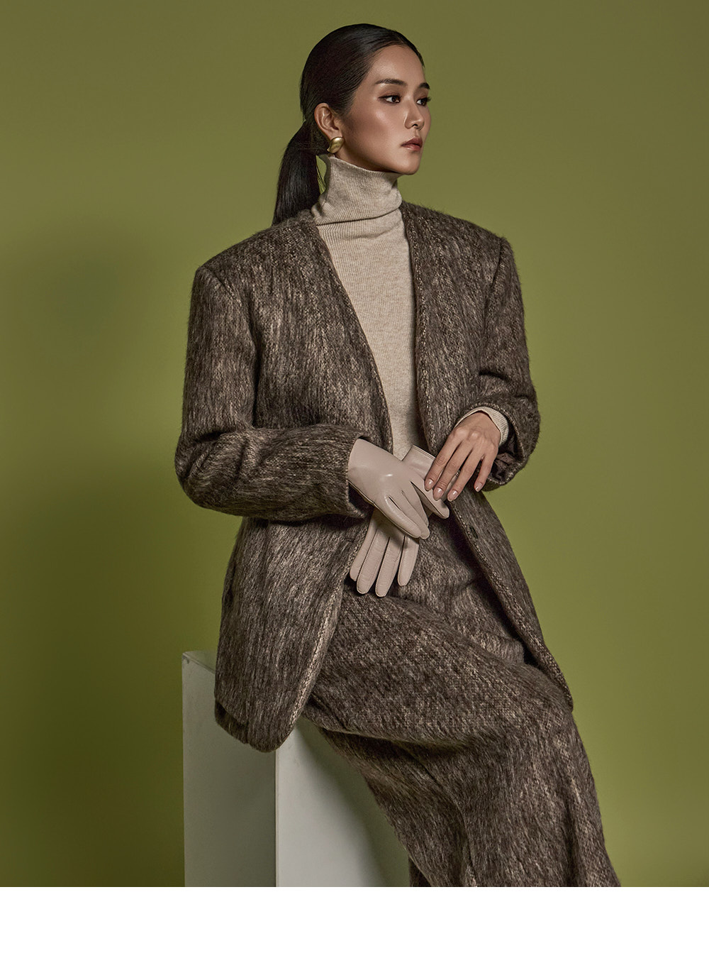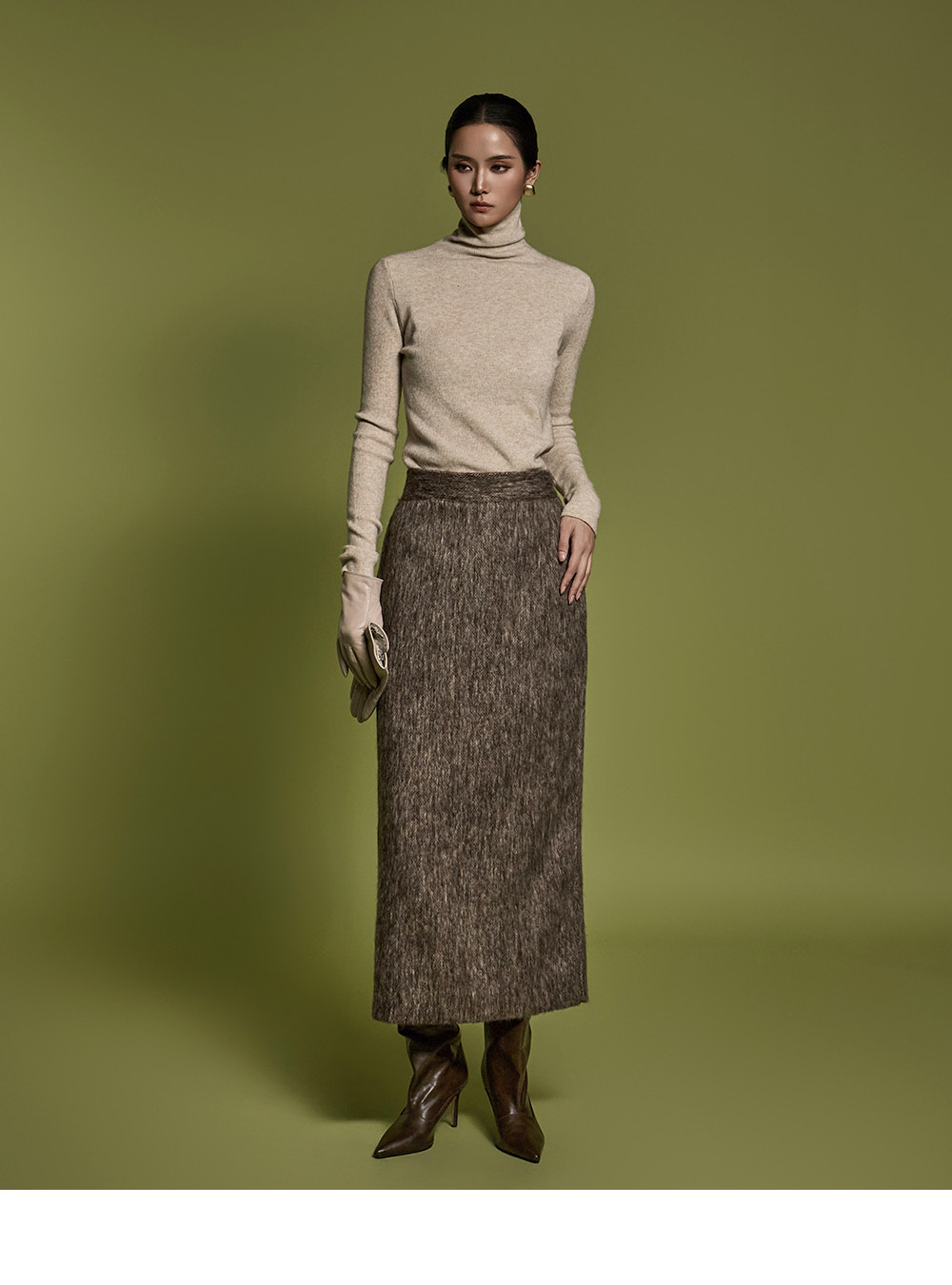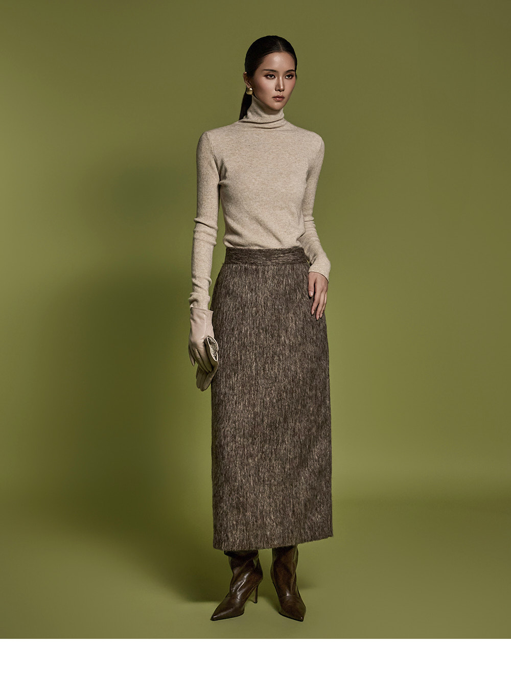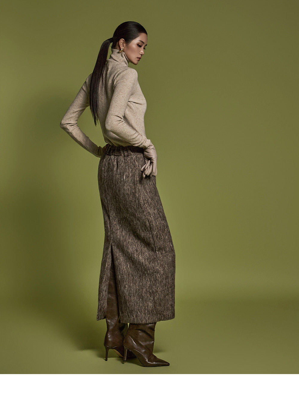 这是一款日常风格的上衣。 采用柔软的聚酯纤维、尼龙及粘胶混纺材质制作,ONE尺码设计,可根据体型舒适穿着。 无额外开合设计,弹性良好,穿着舒适,高领设计提升保暖性。 多种色彩选择,修身版型营造纤细外观,可作为外套内搭单品使用。 基础设计与适中长度,便于日常穿搭,推荐给DINT顾客。 模特身高173CM,穿着ONE尺码,颜色为米色。