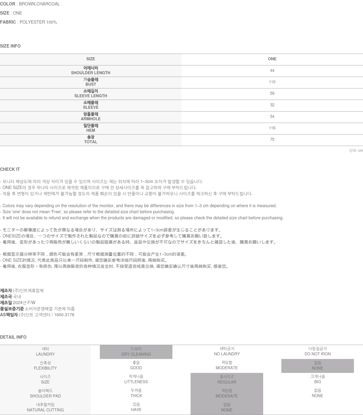 173CM 모델 ONE 사이즈, BROWN 컬러 착용하였습니다.