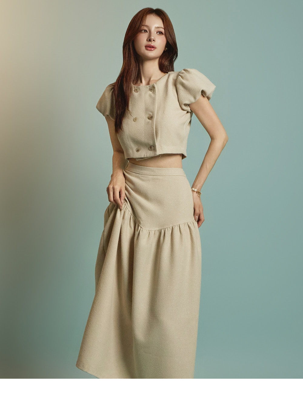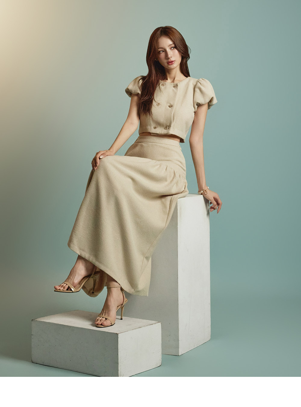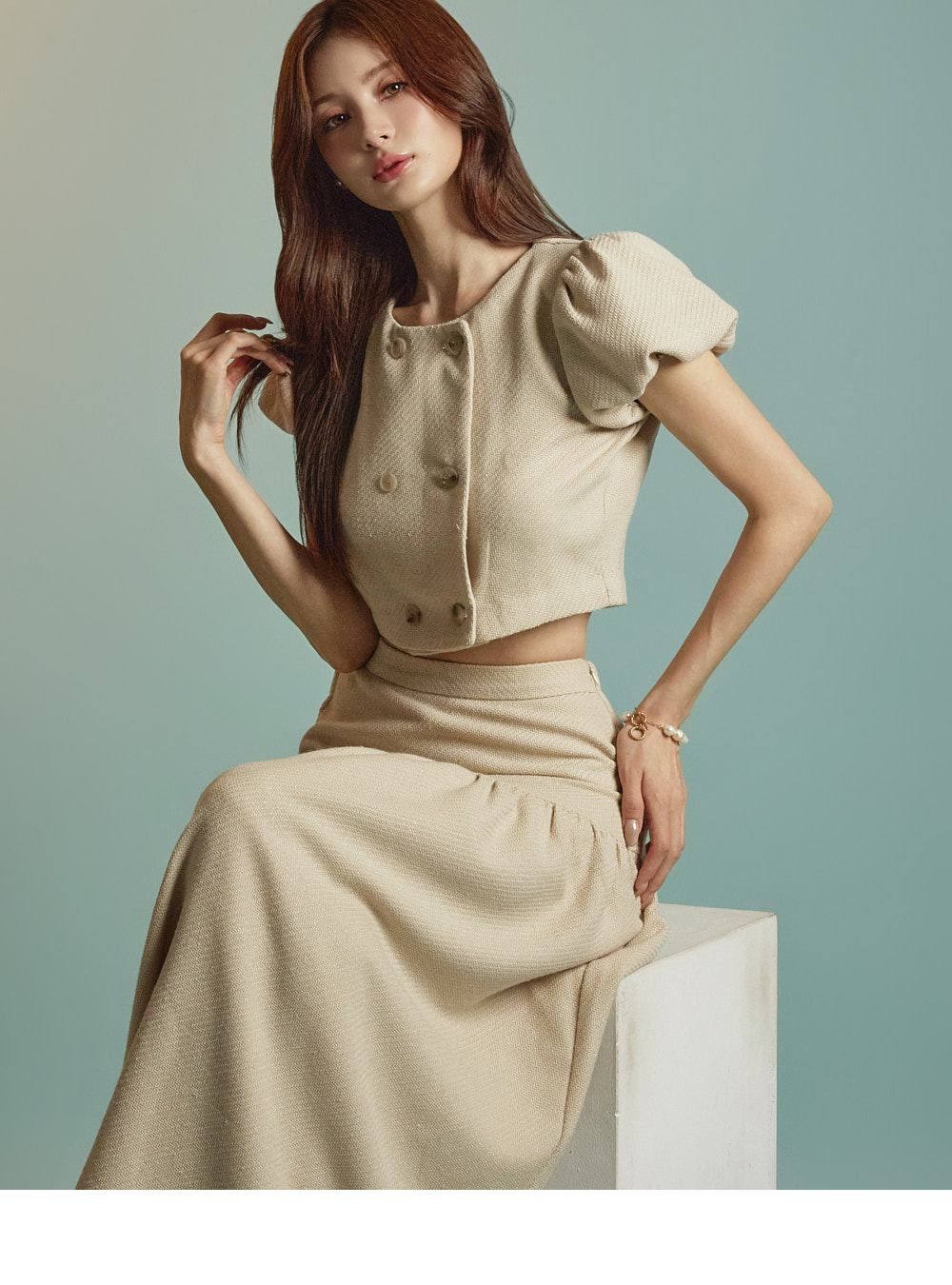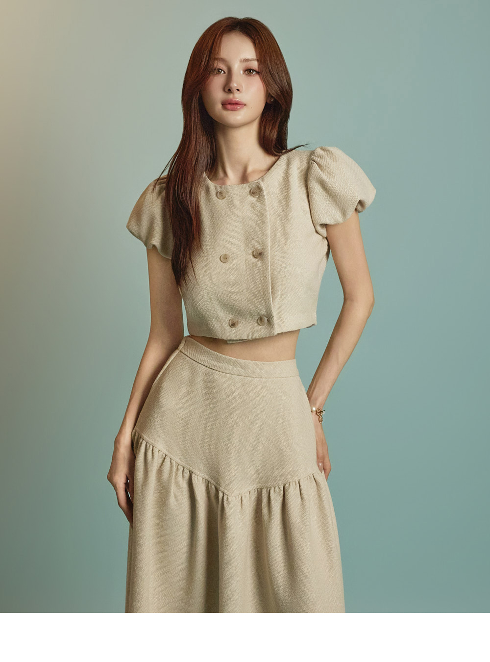 肩部带有泡泡袖细节,搭配适中厚度的肩垫,