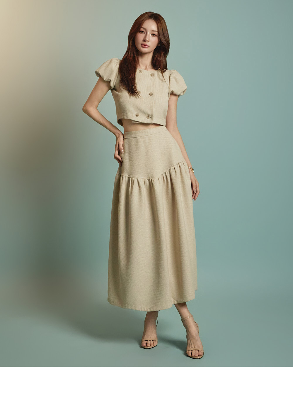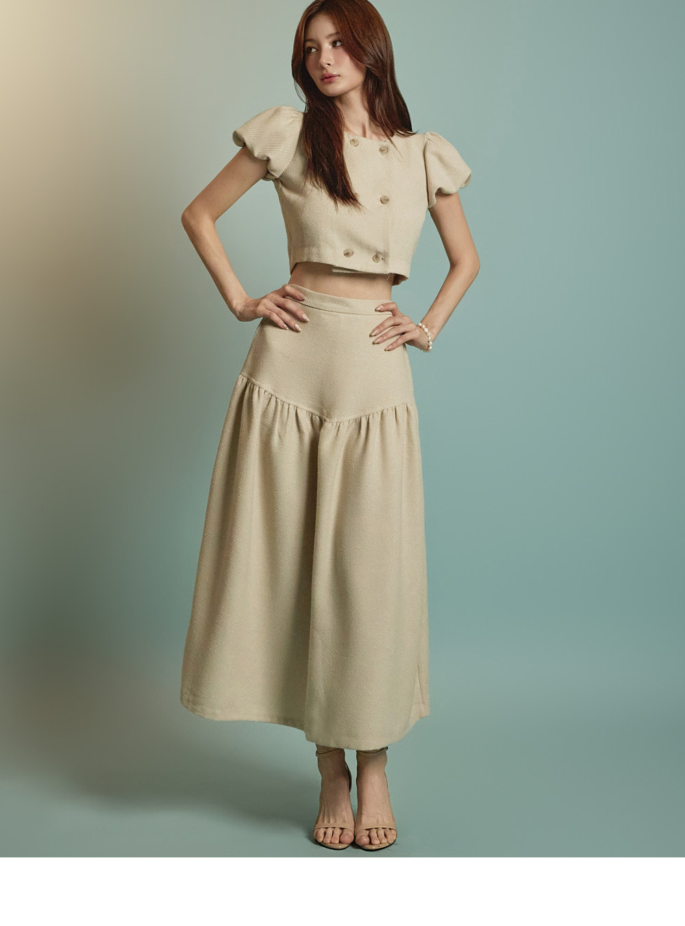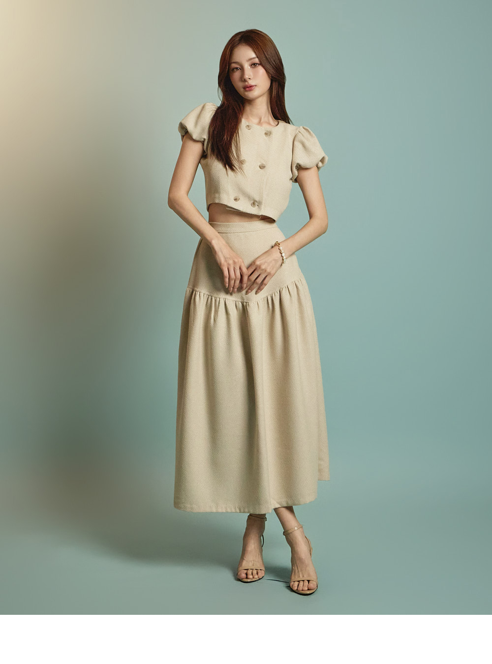 肩部带有泡泡袖细节,搭配适中厚度的肩垫,