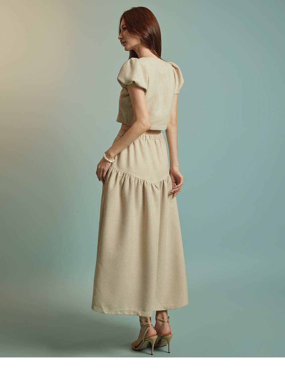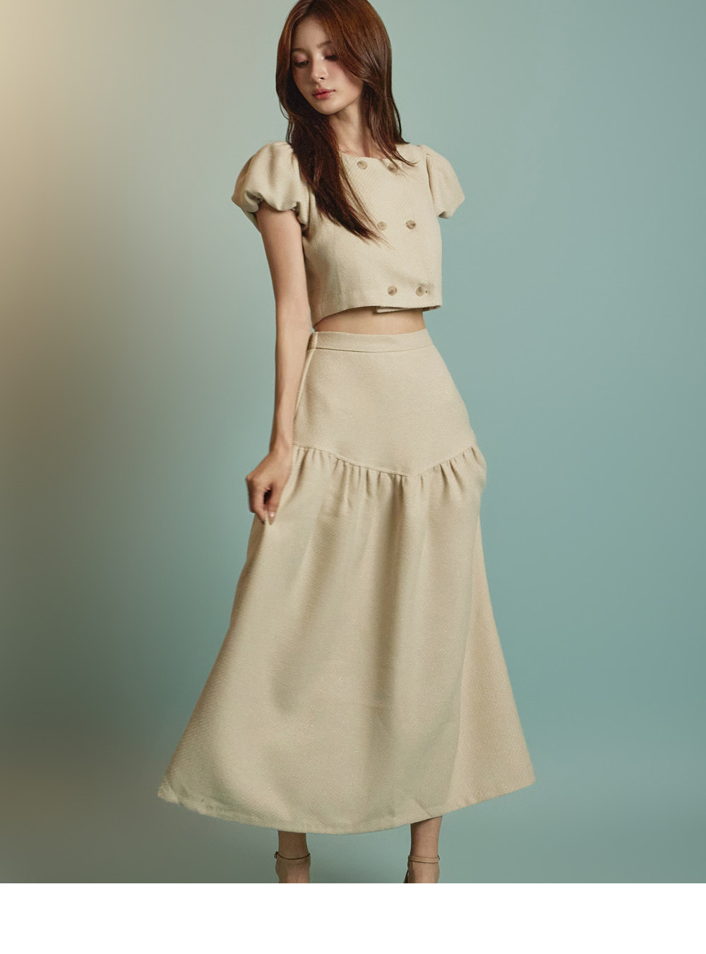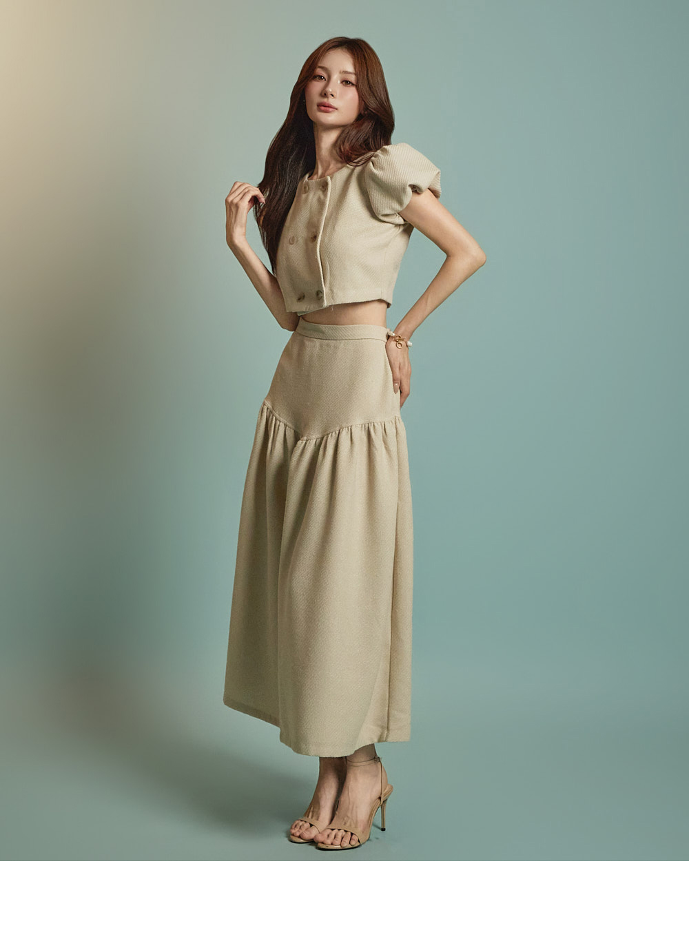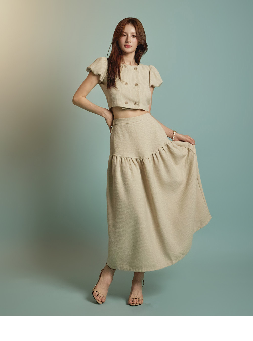 肩部带有泡泡袖细节,搭配适中厚度的肩垫,